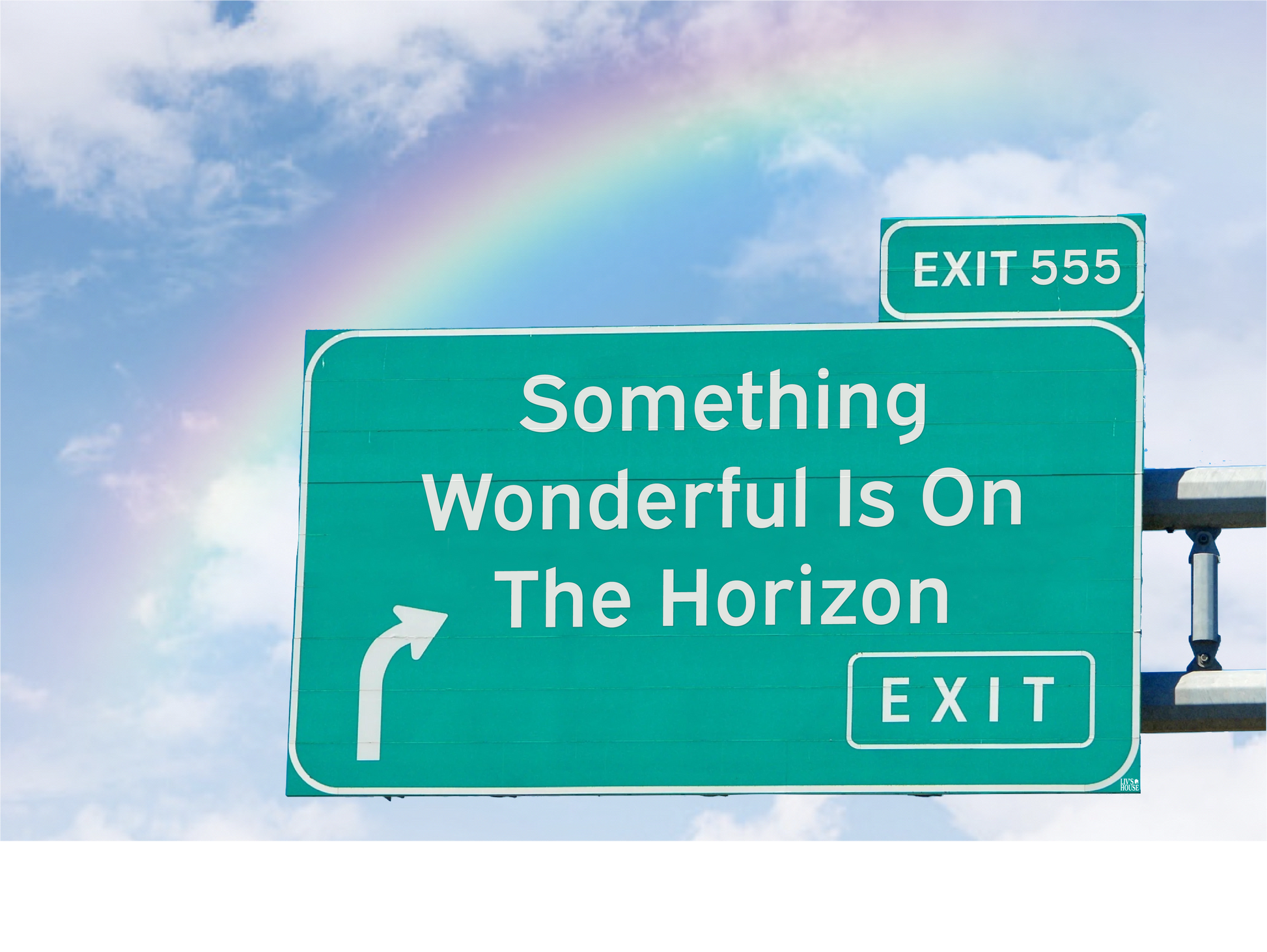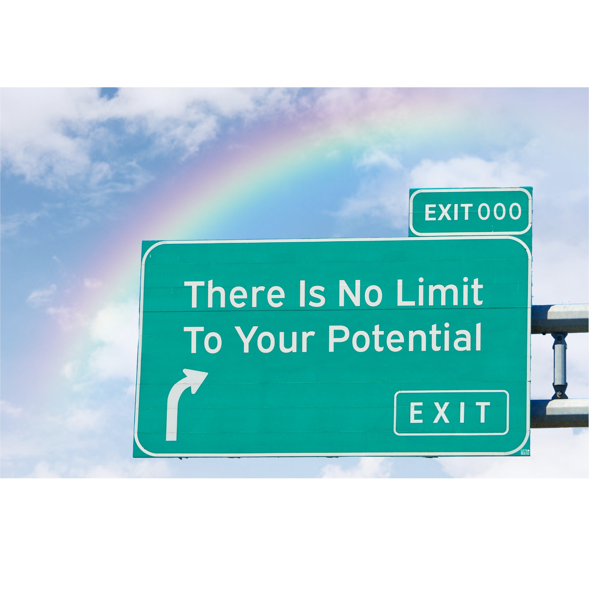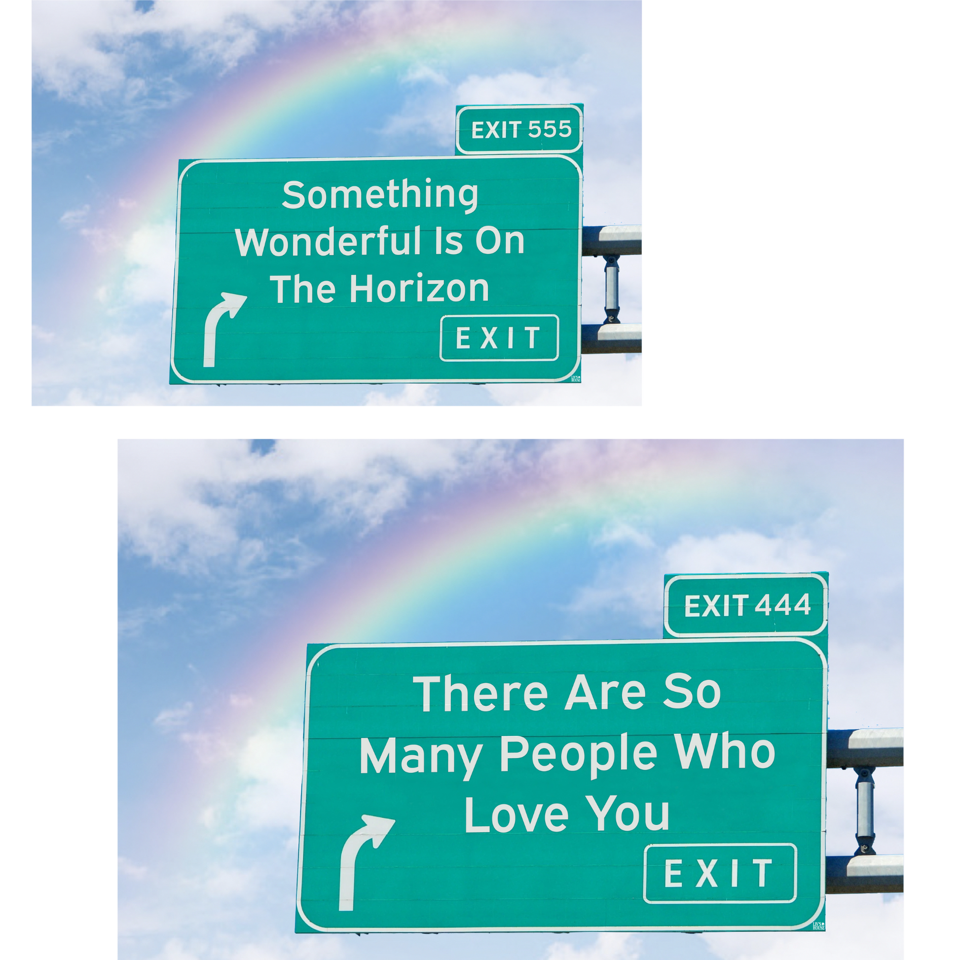 This print features angel number green highway exits with ten inspiring motivational messages to choose from, in front of a rainbow and blue skies.