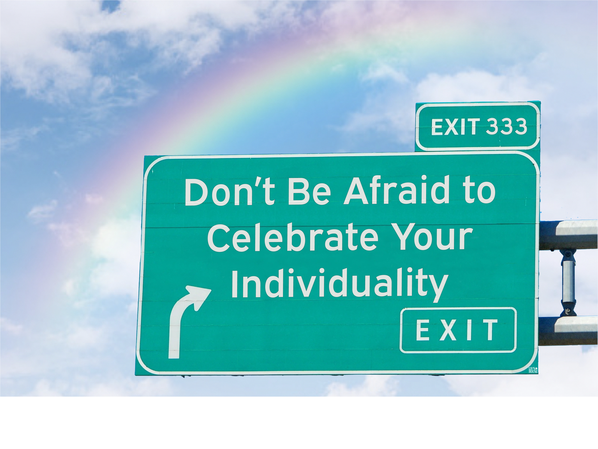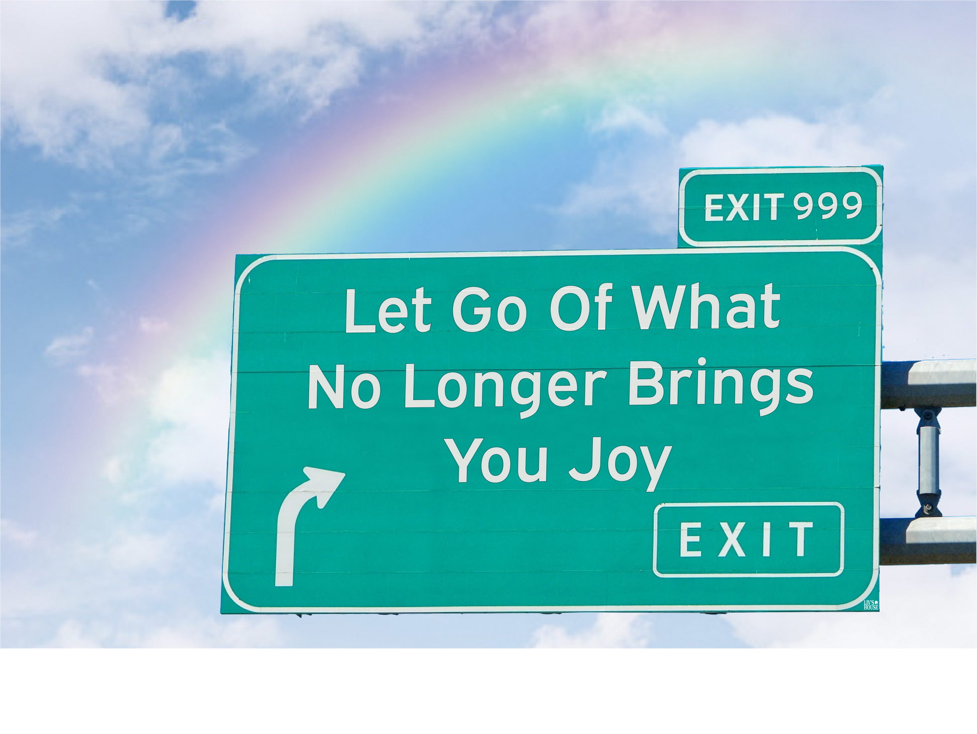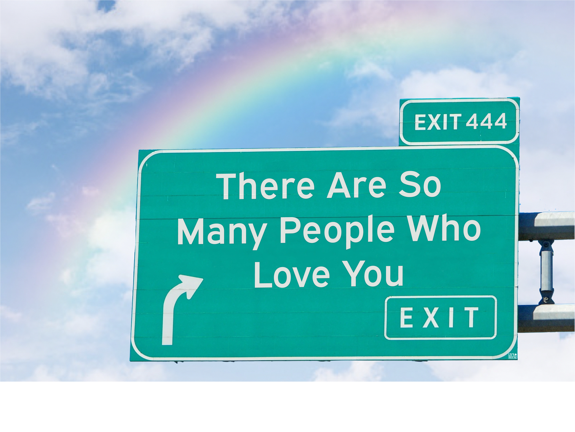 This print features angel number green highway exits with ten inspiring motivational messages to choose from, in front of a rainbow and blue skies.