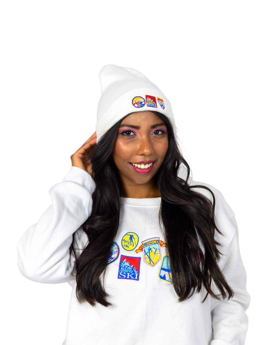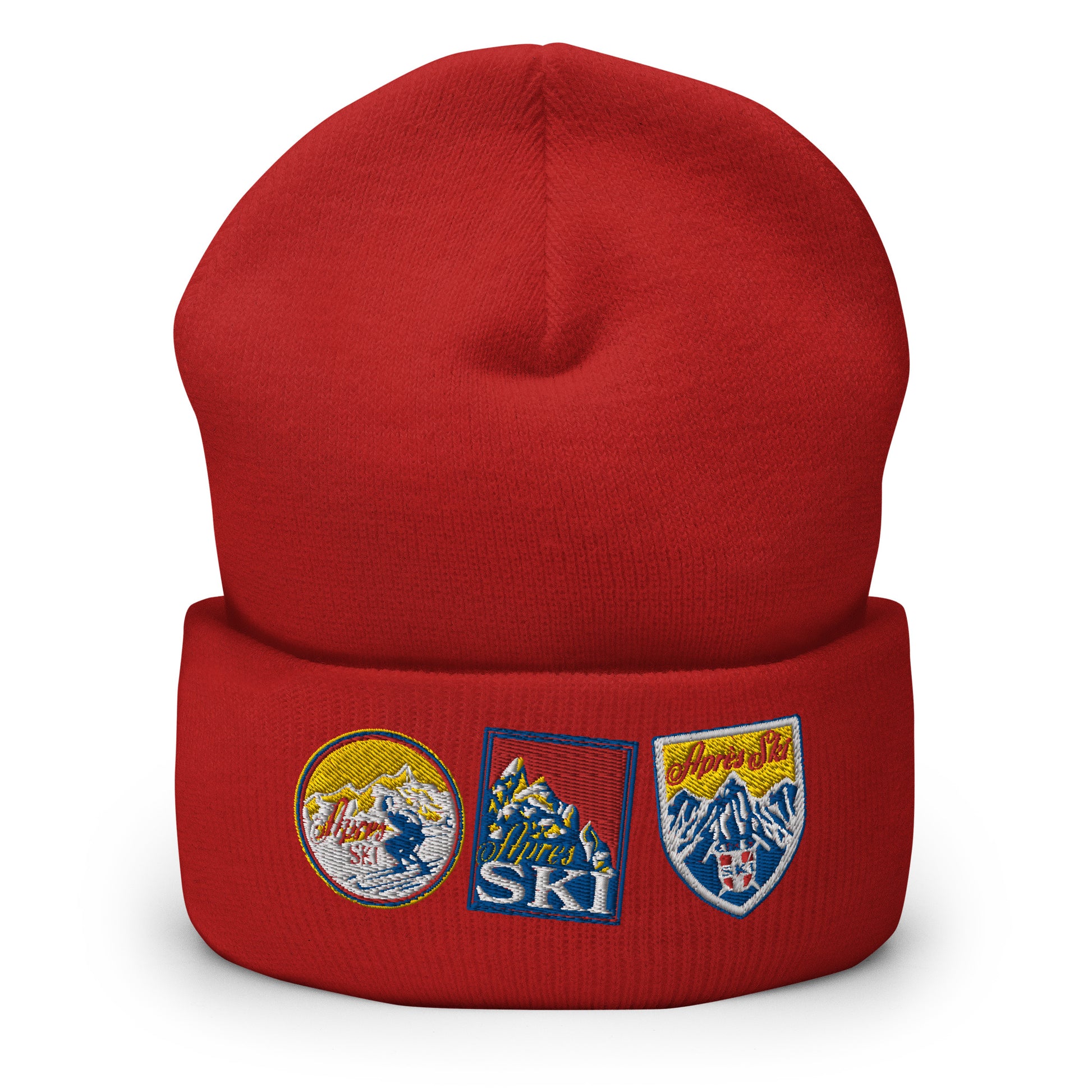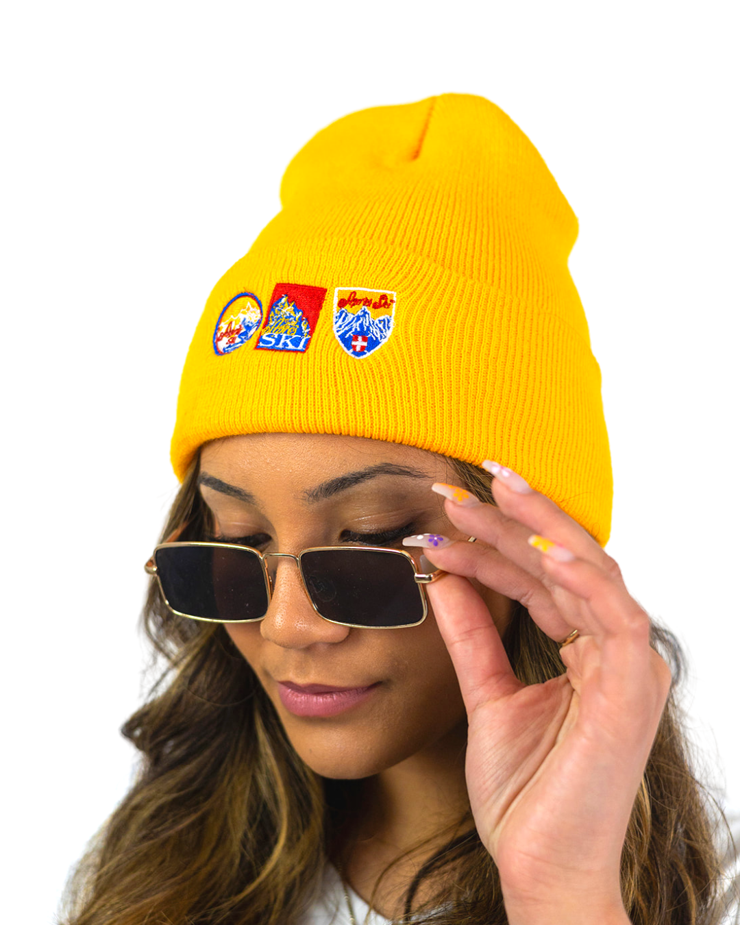 Made of 100% turbo acrylic fabric, this knit hat is snug and form-fitting. 12" in length, hypoallergenic, and hand-washable. Available in yellow, red, and white, this hat features vintage ski patch inspired embroidery with mountains in red, blue, white, and yellow.