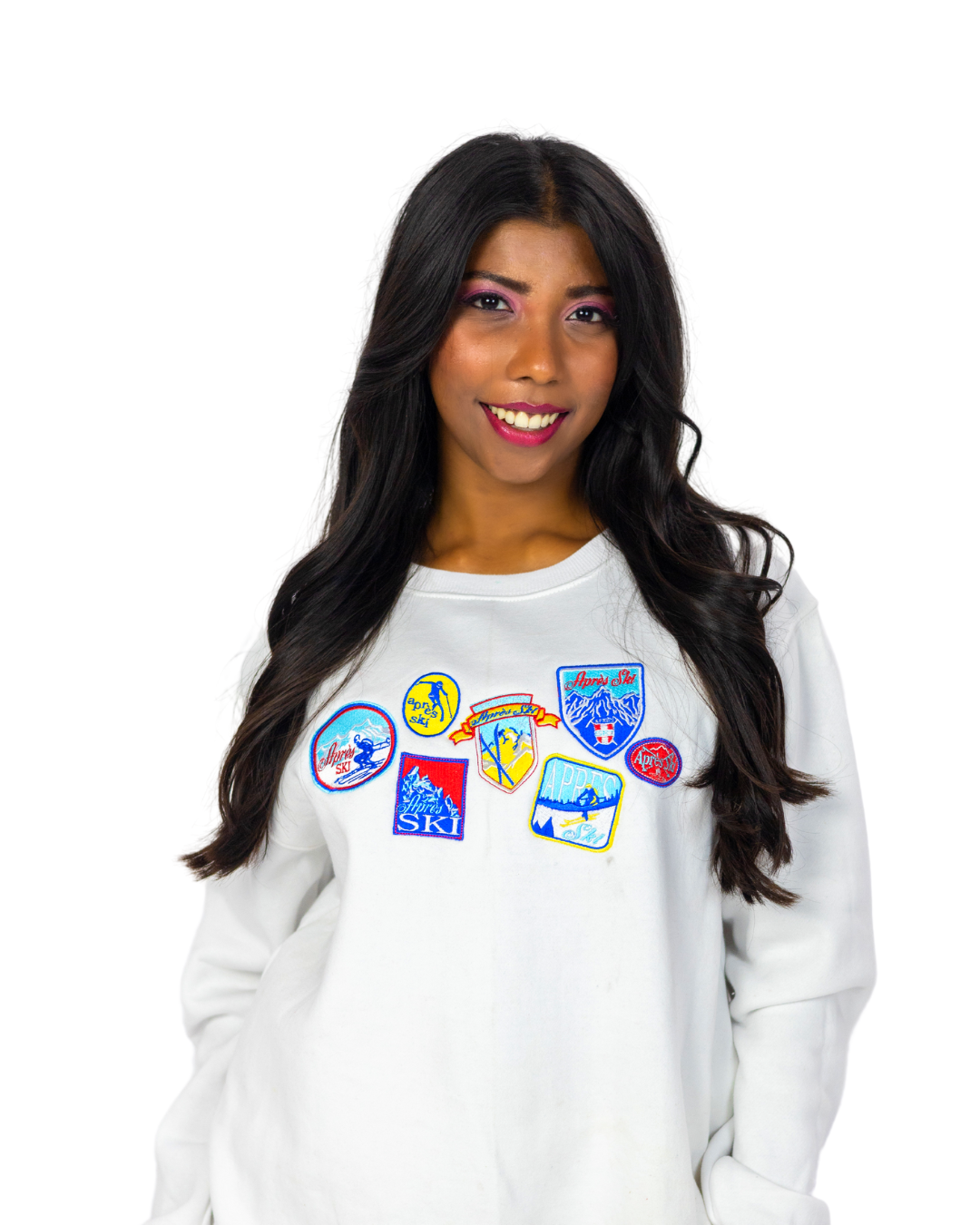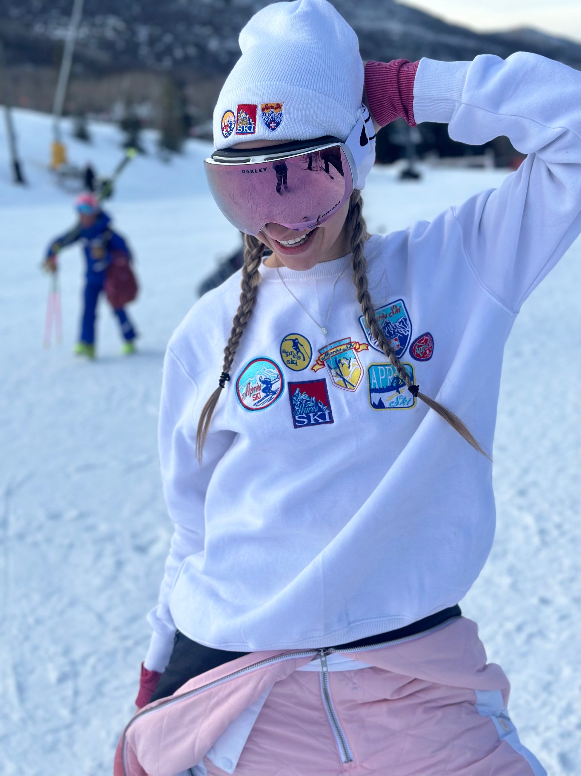 Made with super soft, heavy-weight fleece, 65% cotton, 35% polyester. This unisex sweatshirt is durable, warm, and cozy - you'll never want to take it off. Embroidered in a vintage ski patch style for a sporty look. Embroidery features mountains, skis, and text in red, blue, yellow, and white thread.