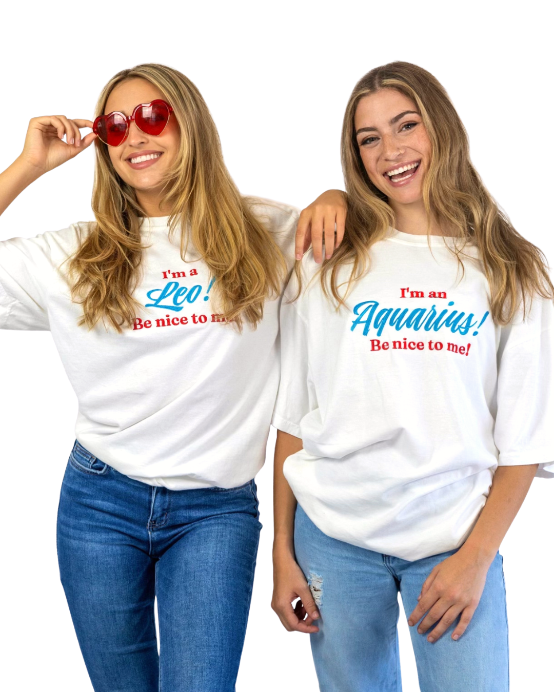 Model in style Leo is wearing a size L, model in style Aquarius is wearing a size XL.