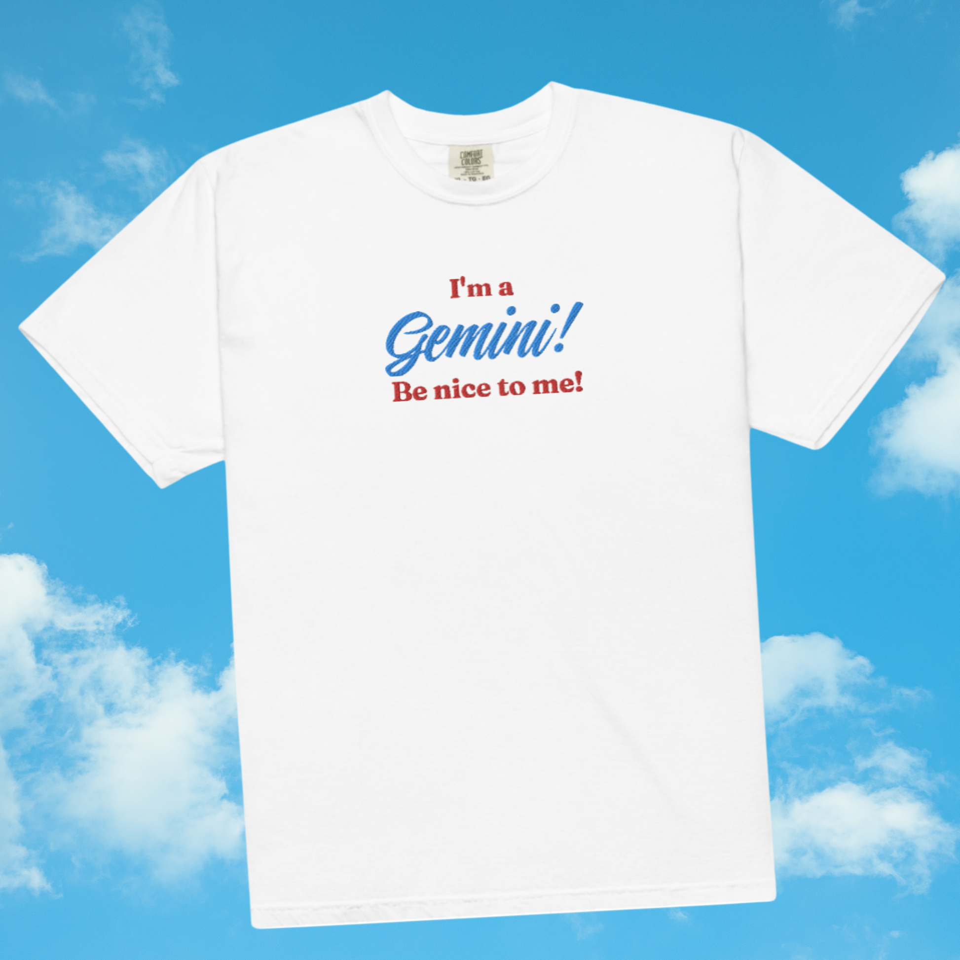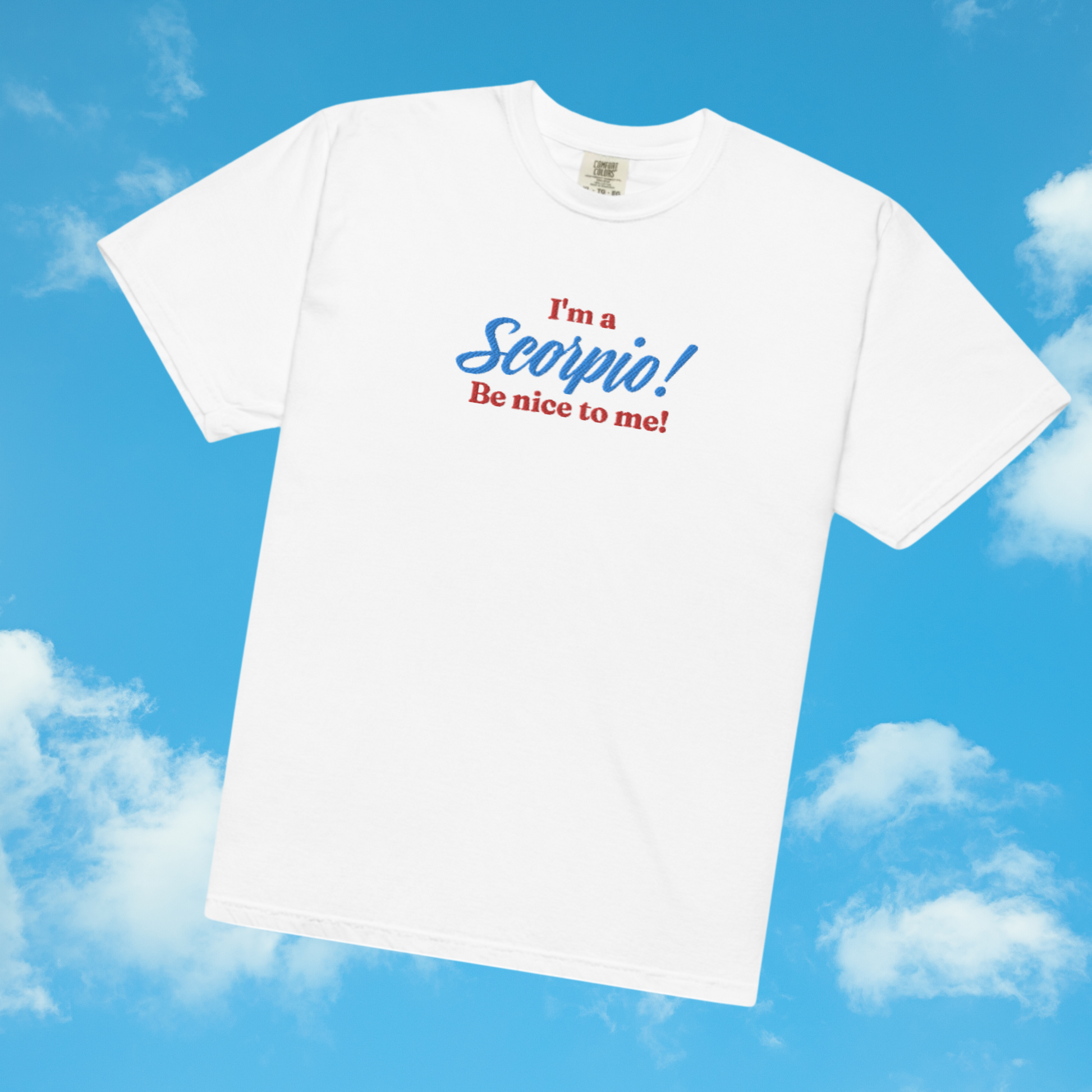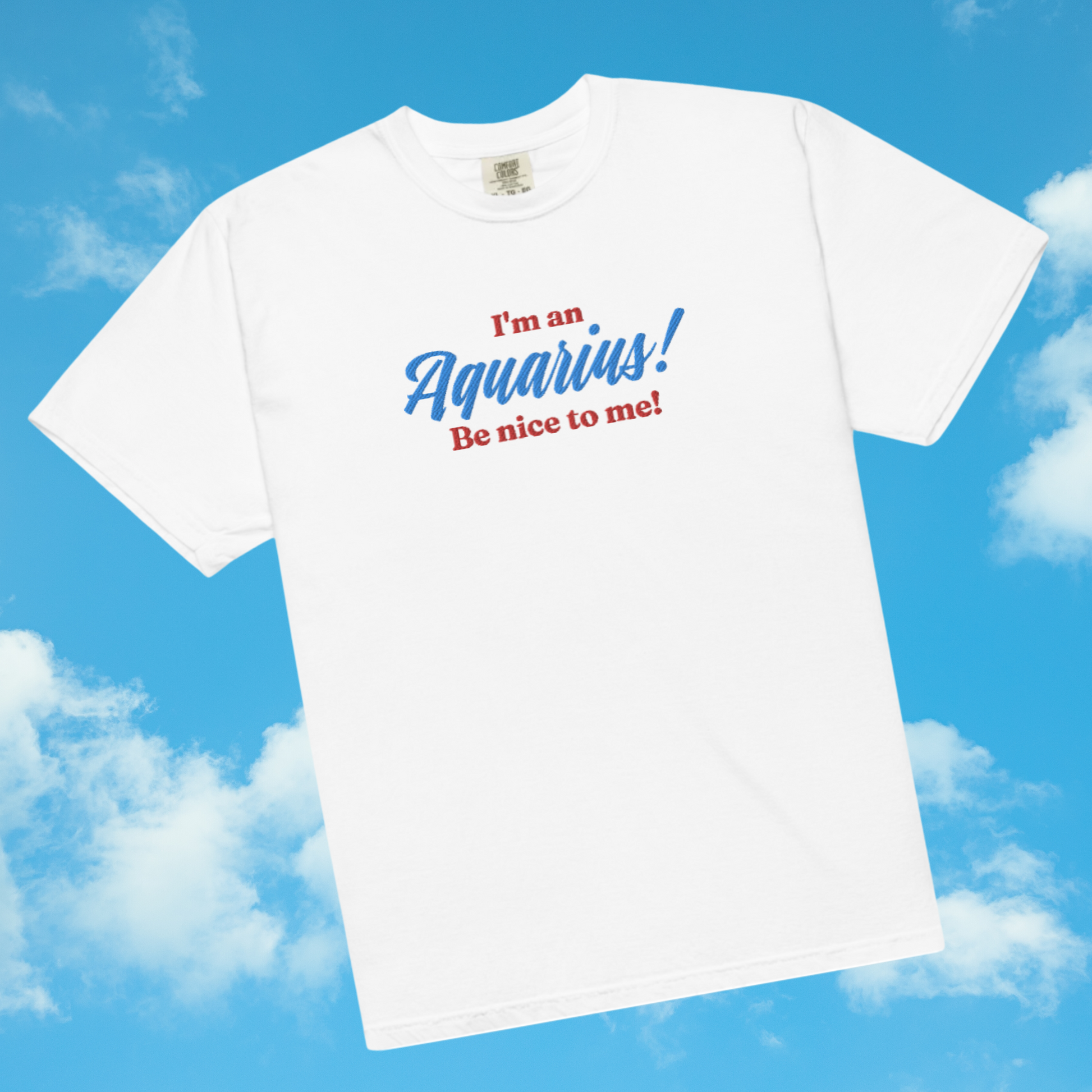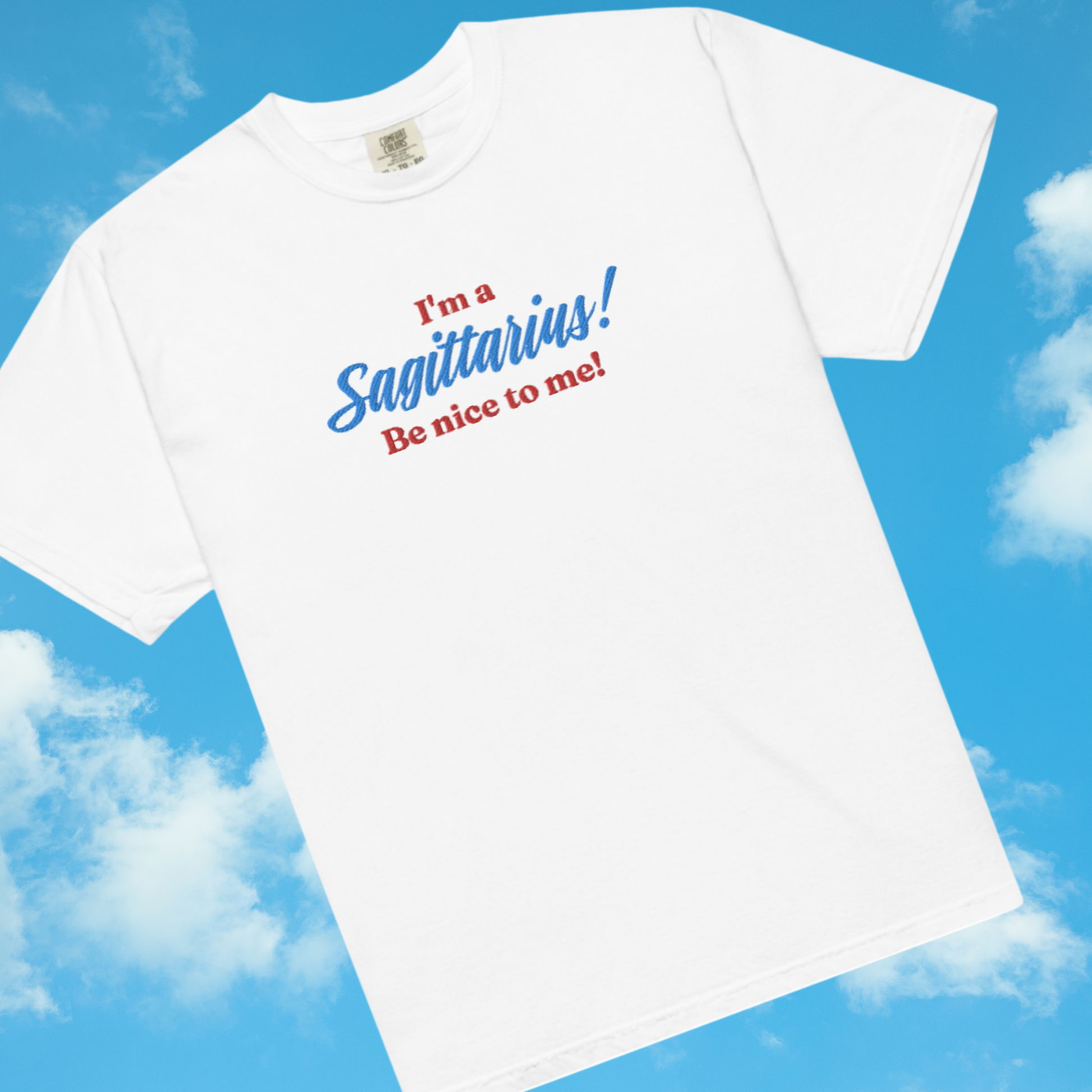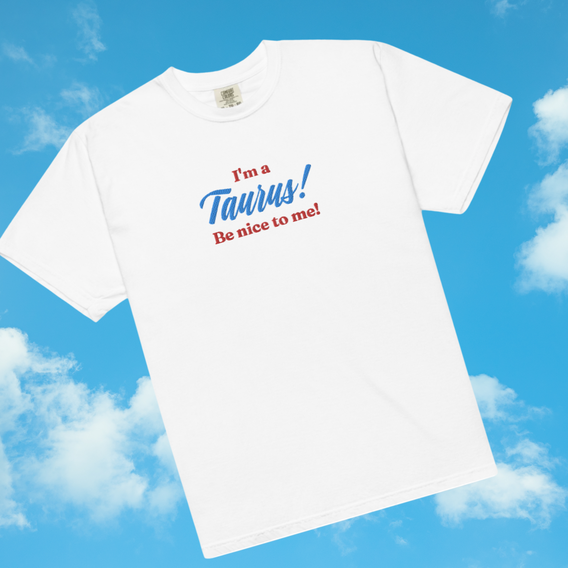 Perfect for horoscope enthusiasts and astrology lovers, this tee is embroidered in red and blue thread with your zodiac sign.