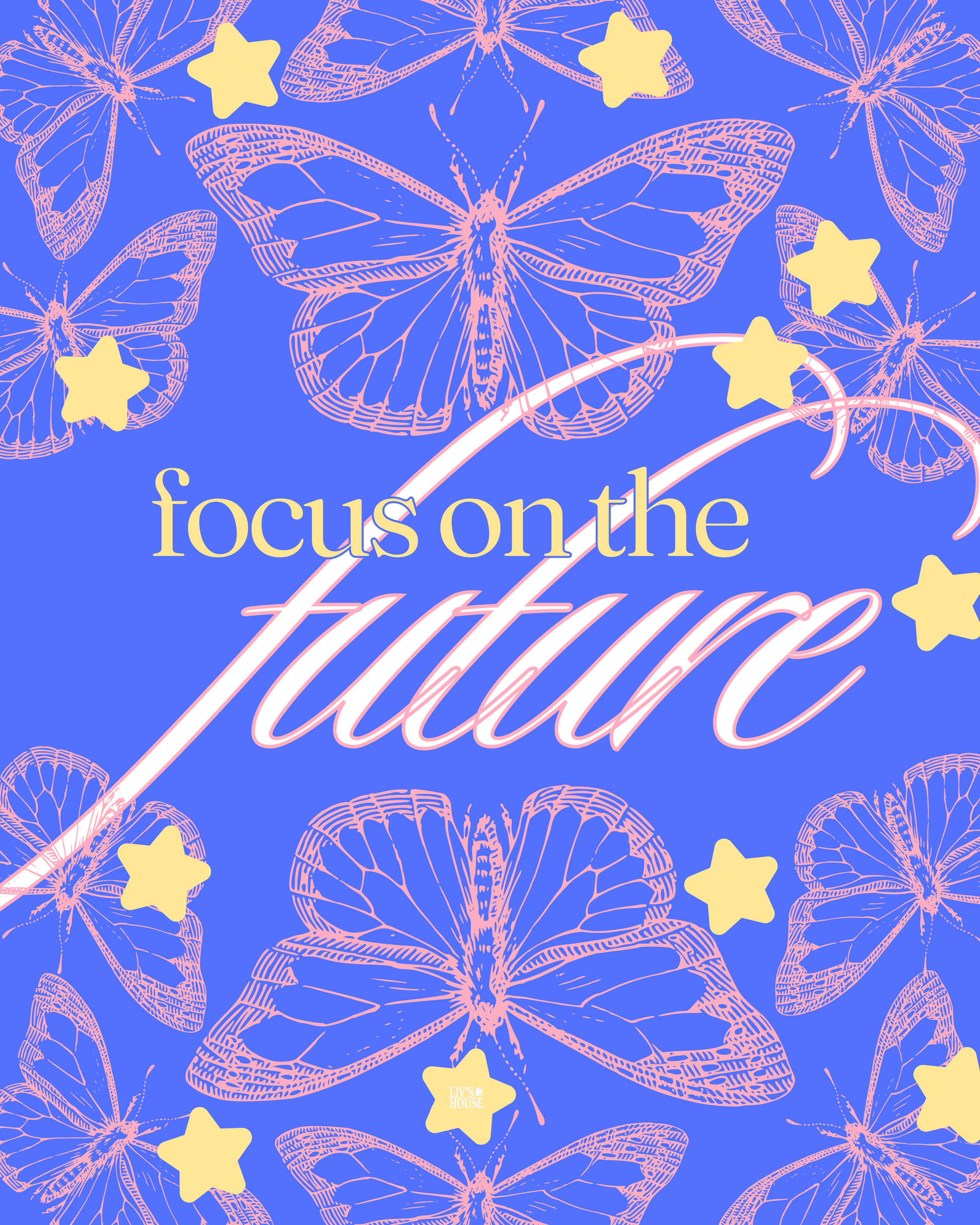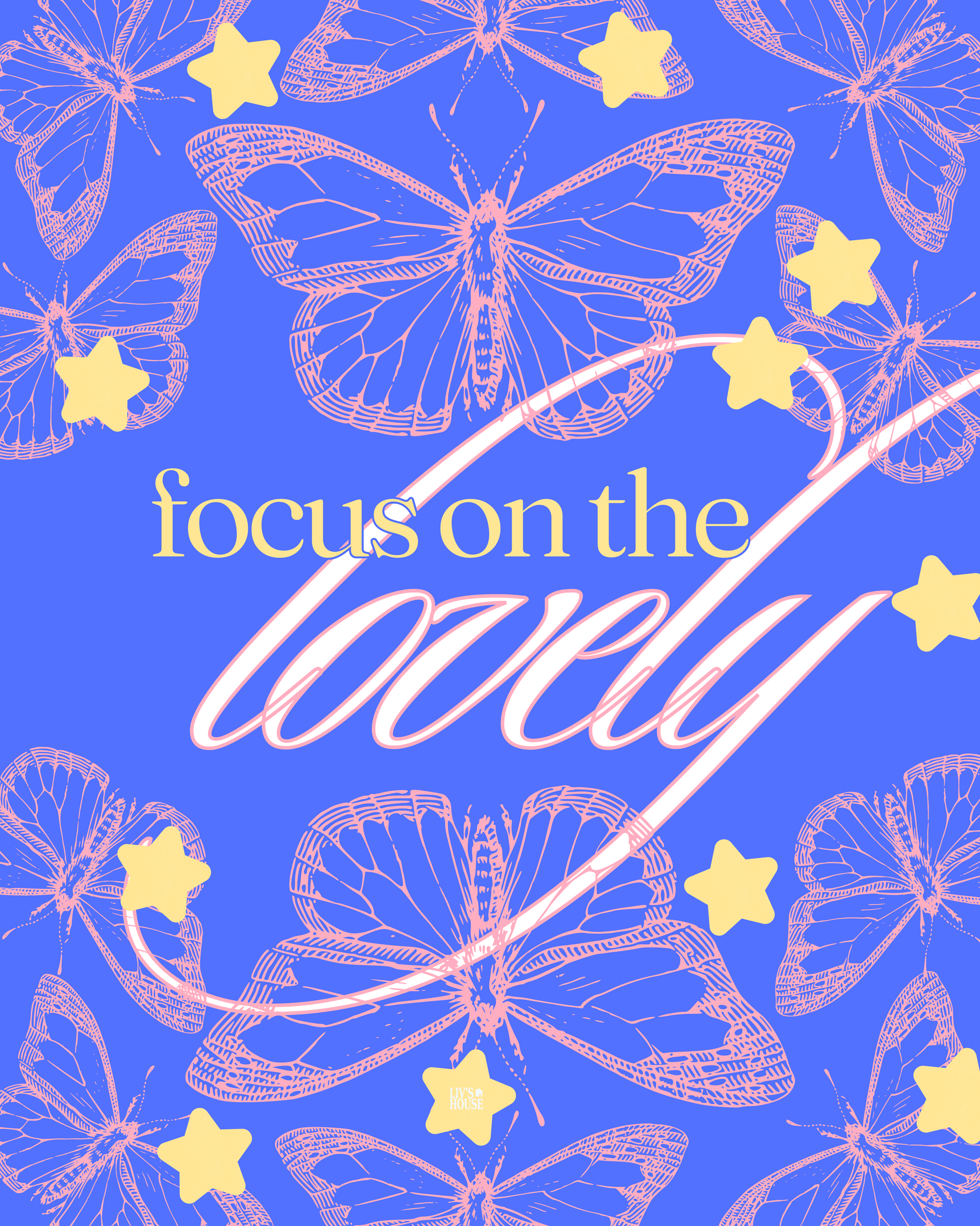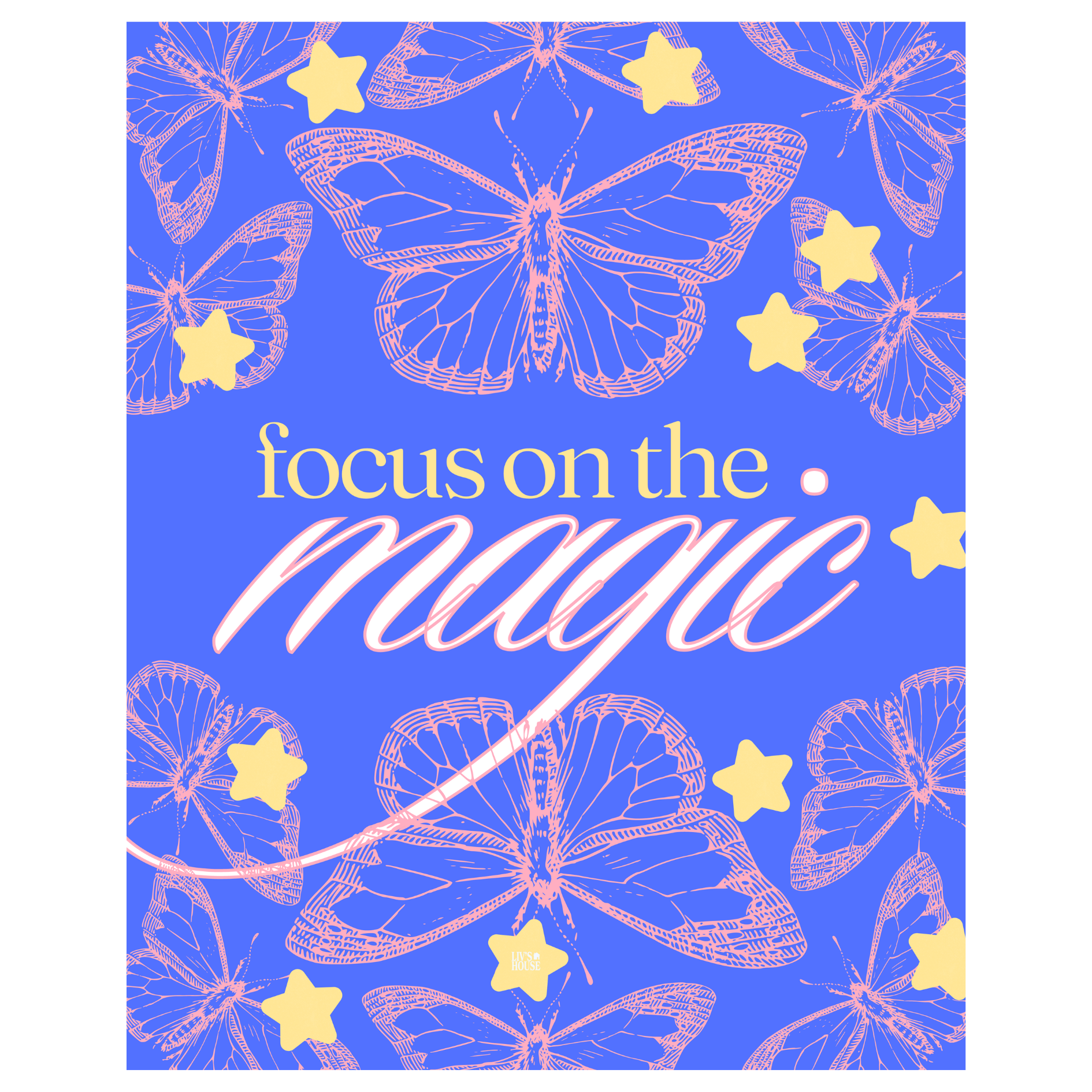 Print features pink butterflies and yellow stars on royal blue background, with inspiring messages to remind you what to focus on.
