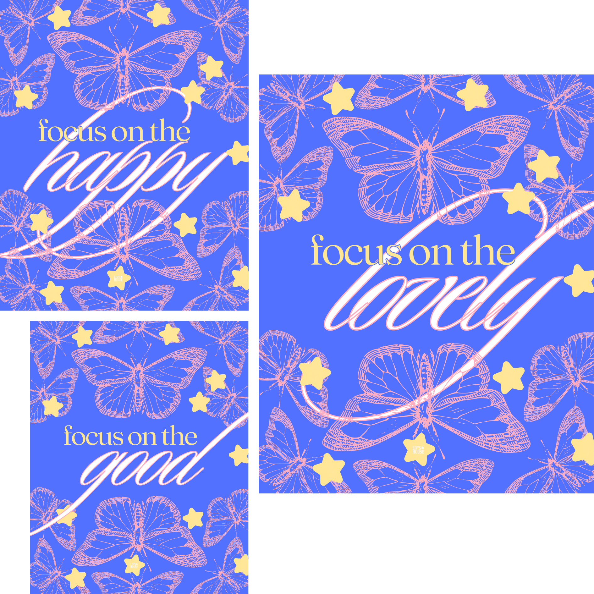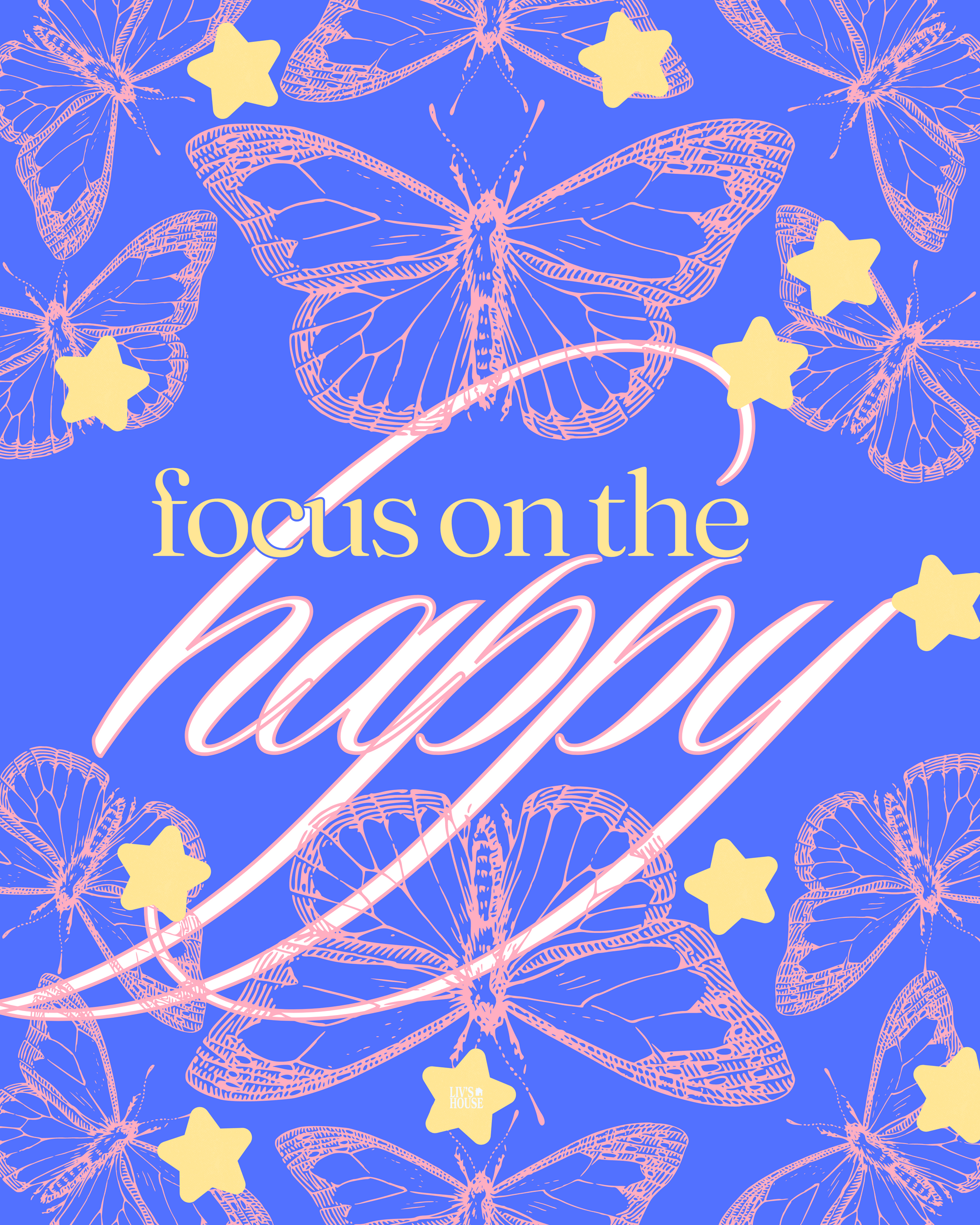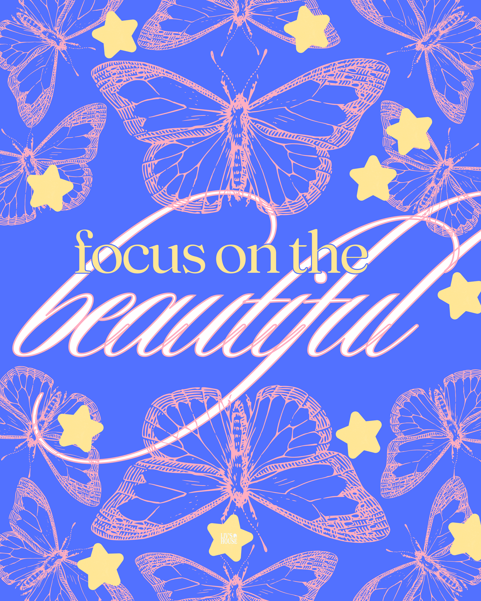 Print features pink butterflies and yellow stars on royal blue background, with inspiring messages to remind you what to focus on.