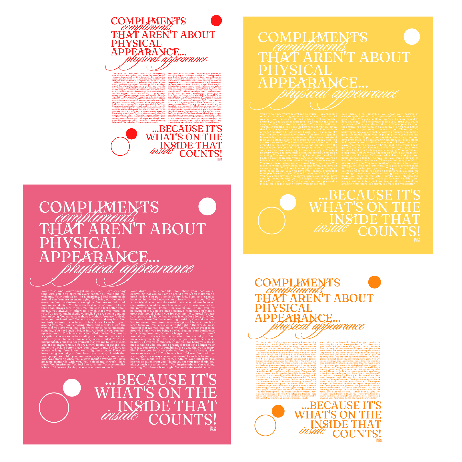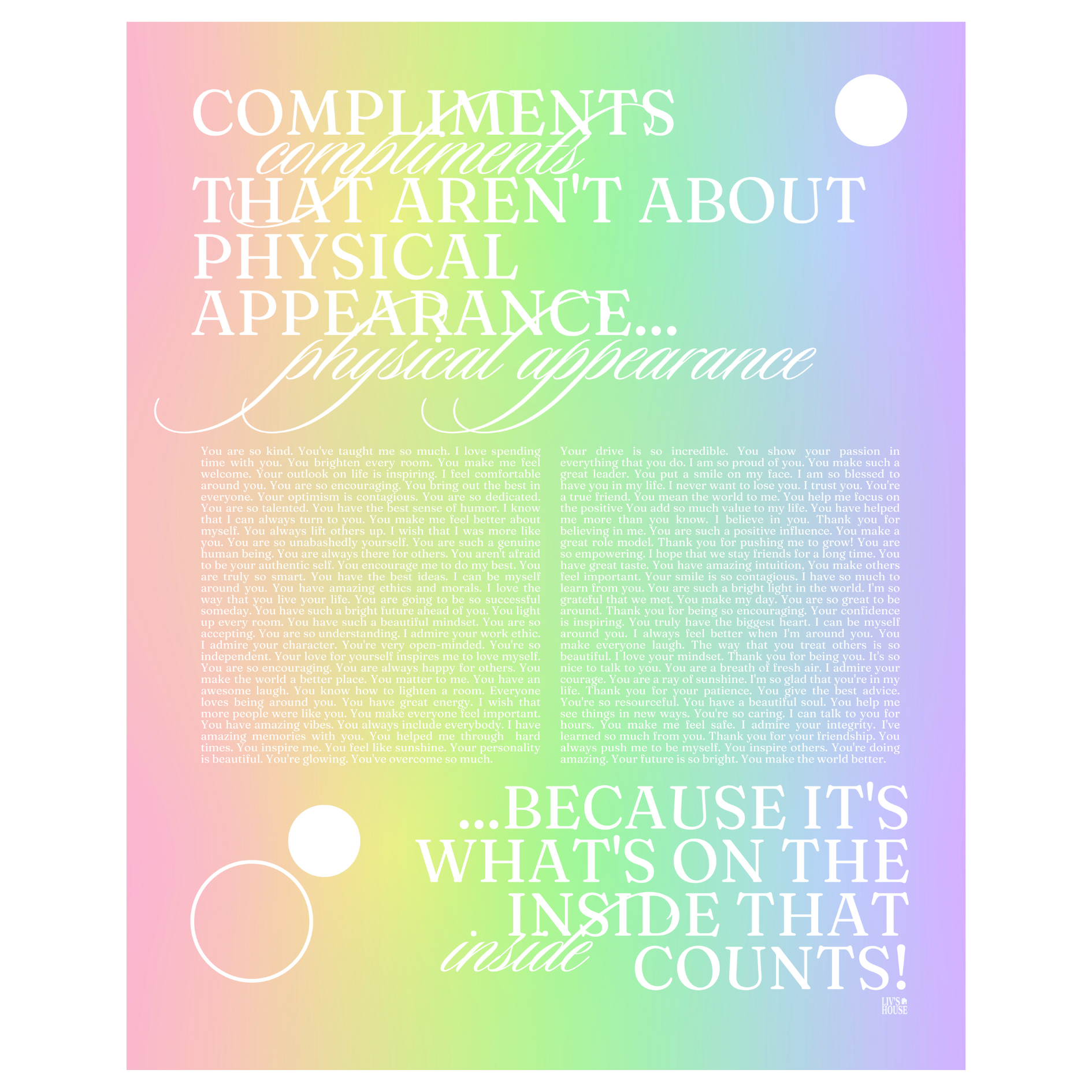 This print comes in rainbow, red, orange, pink, and yellow, and lists inspiring and motivational compliments about who you are on the inside.