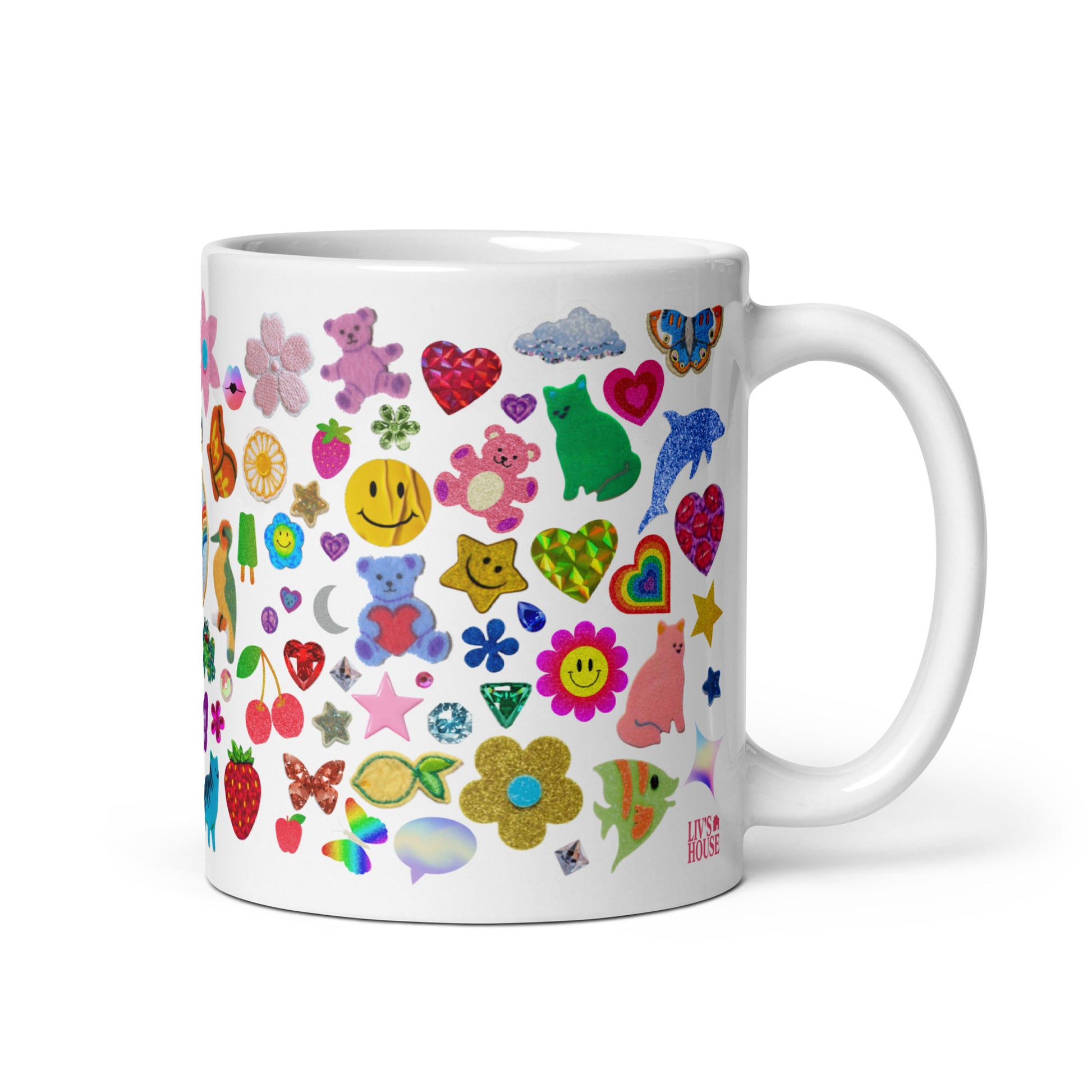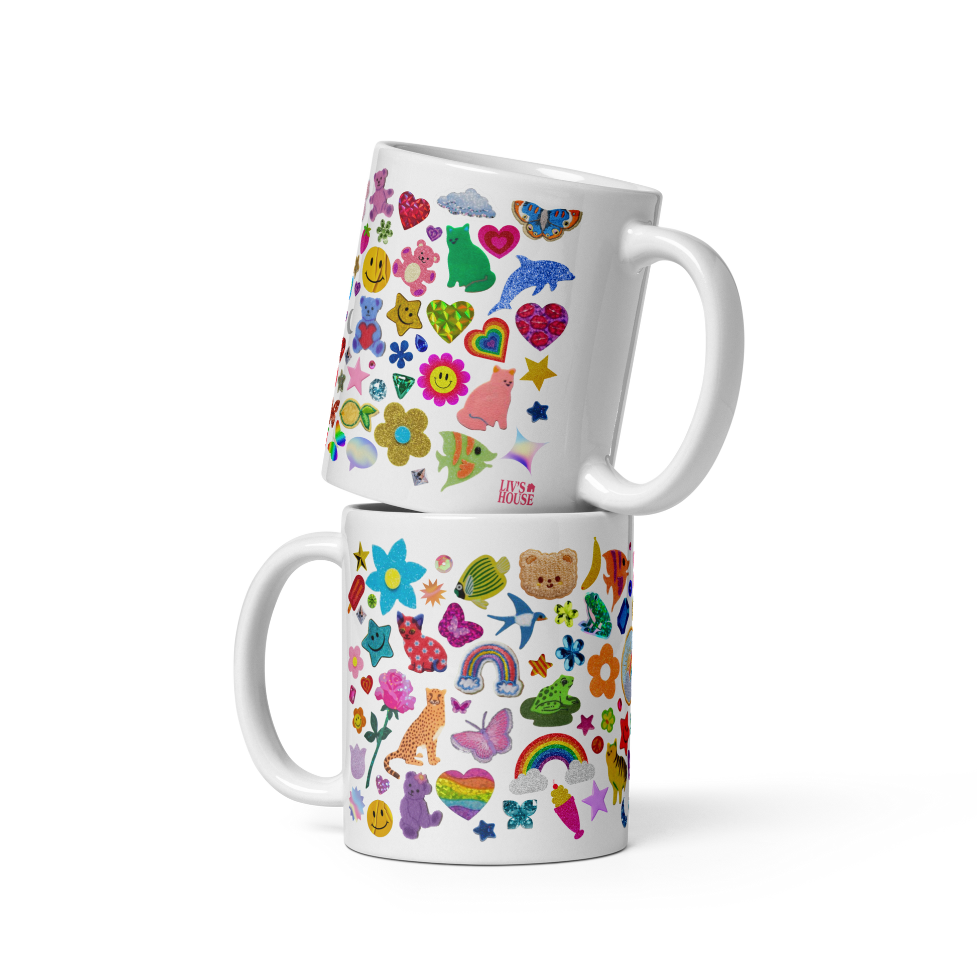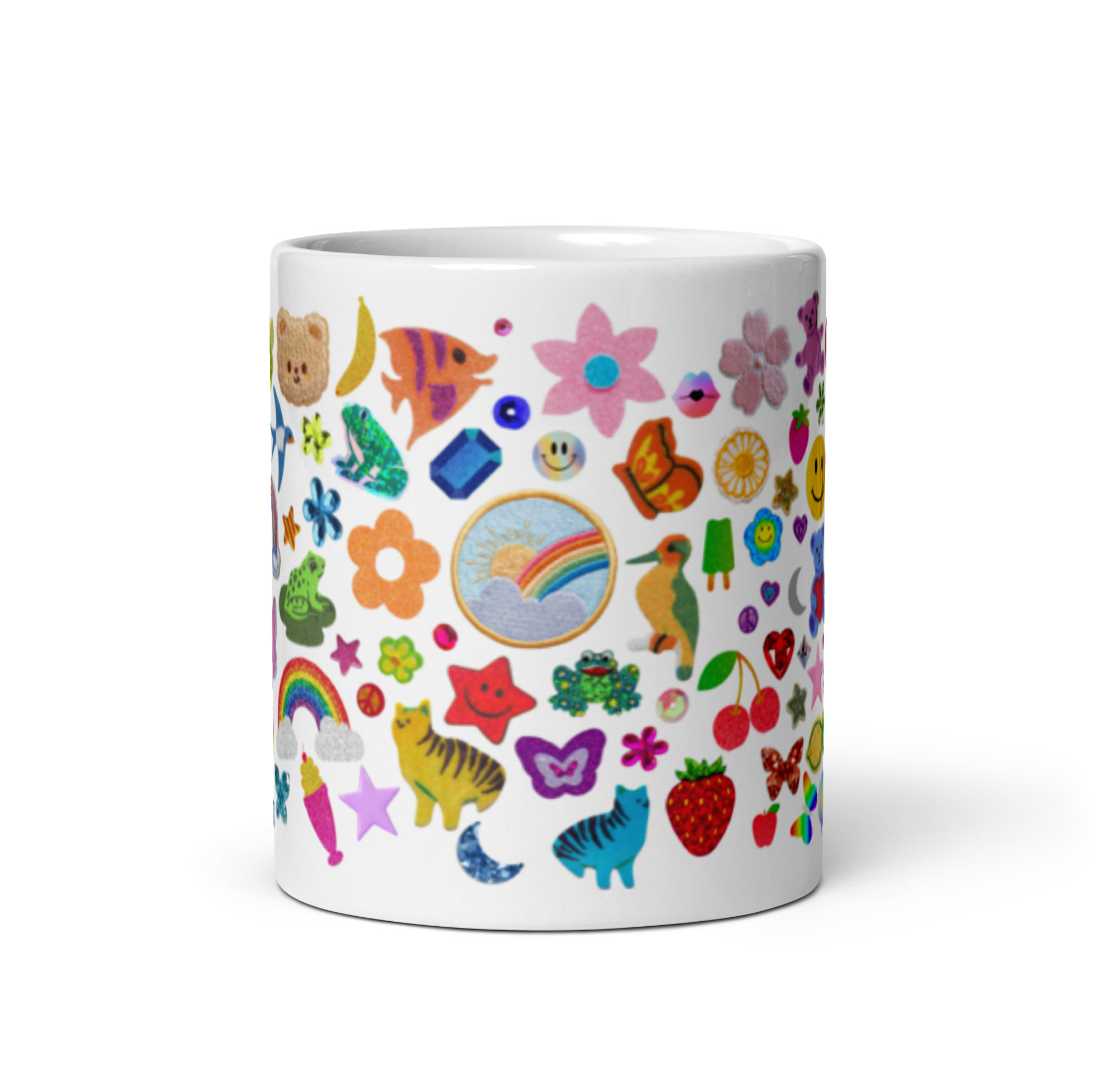 Design features an array of faux 'stickers' for a colorful, throwback, Y2K aesthetic. 'Stickers' include rainbows, flowers, teddy bears, frogs, stars, rhinestones, butterflies, and more!