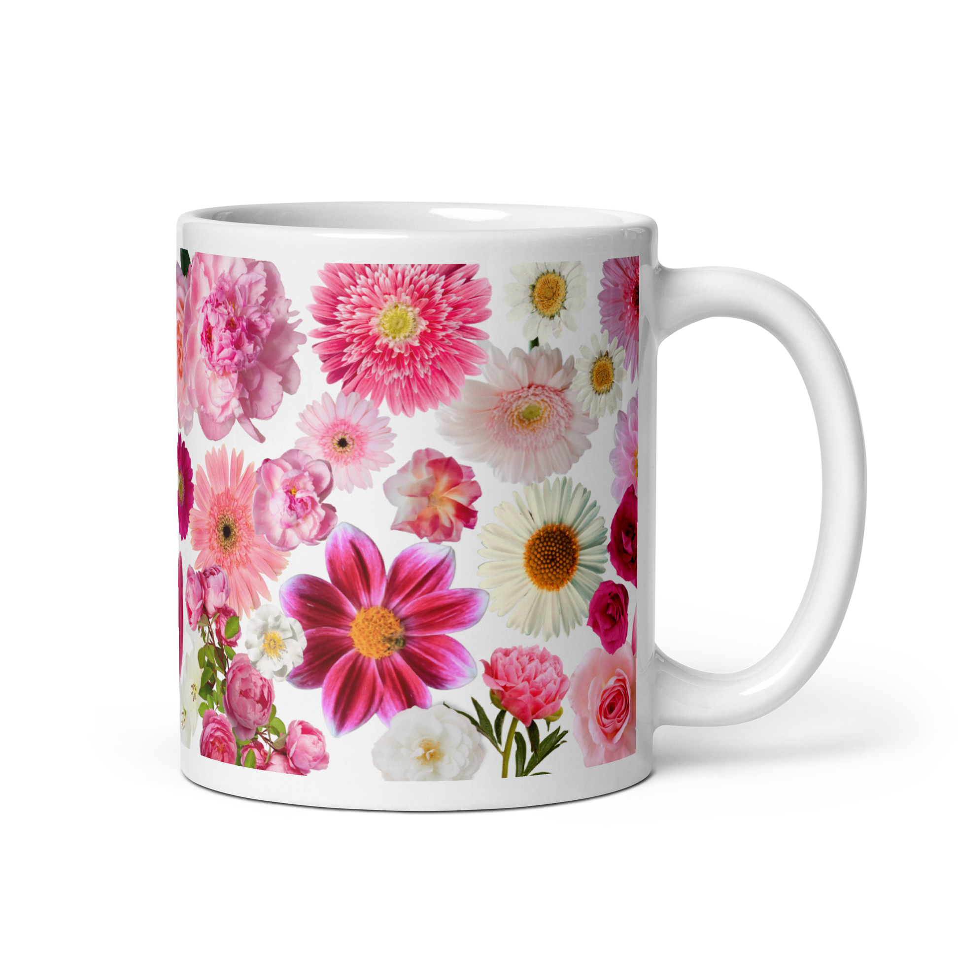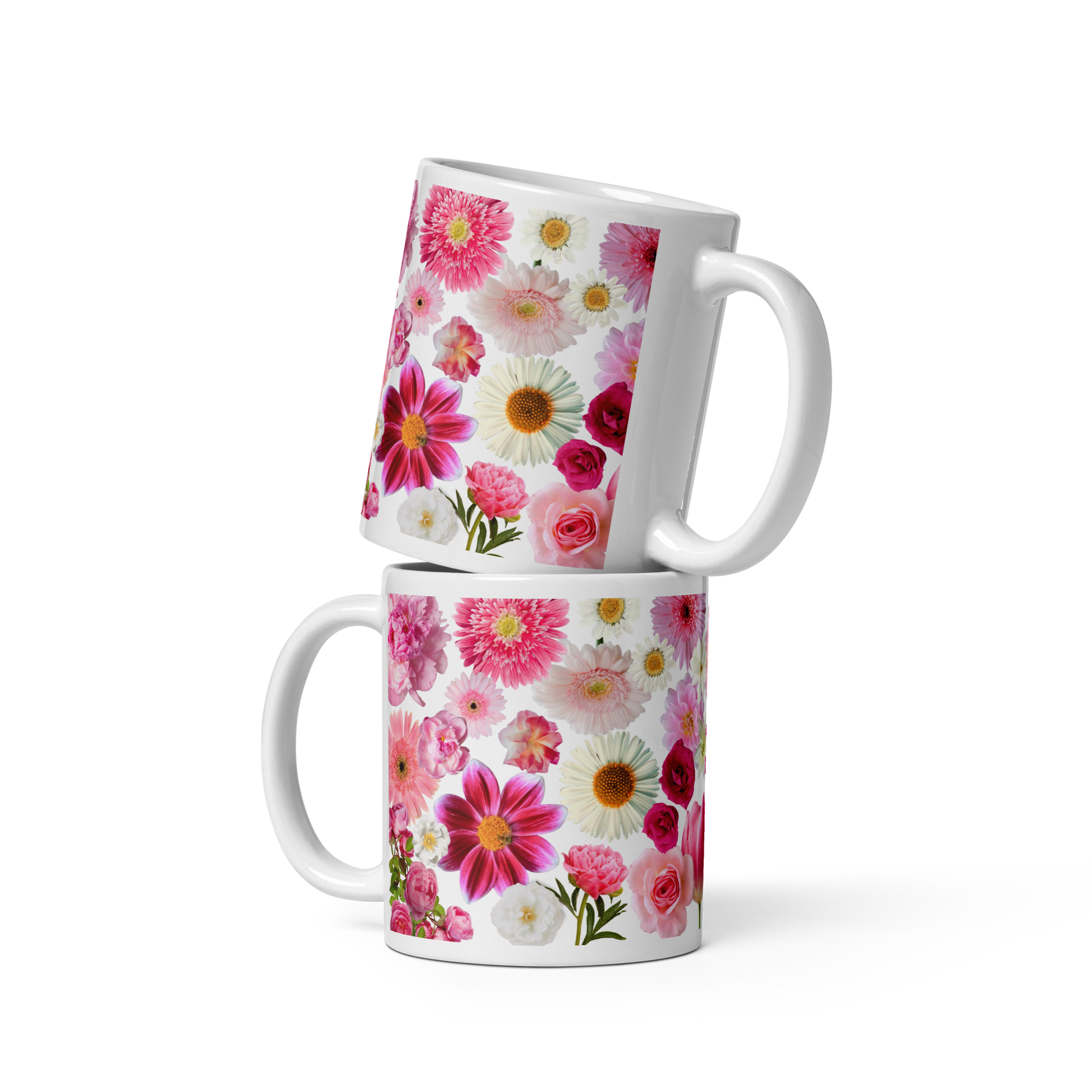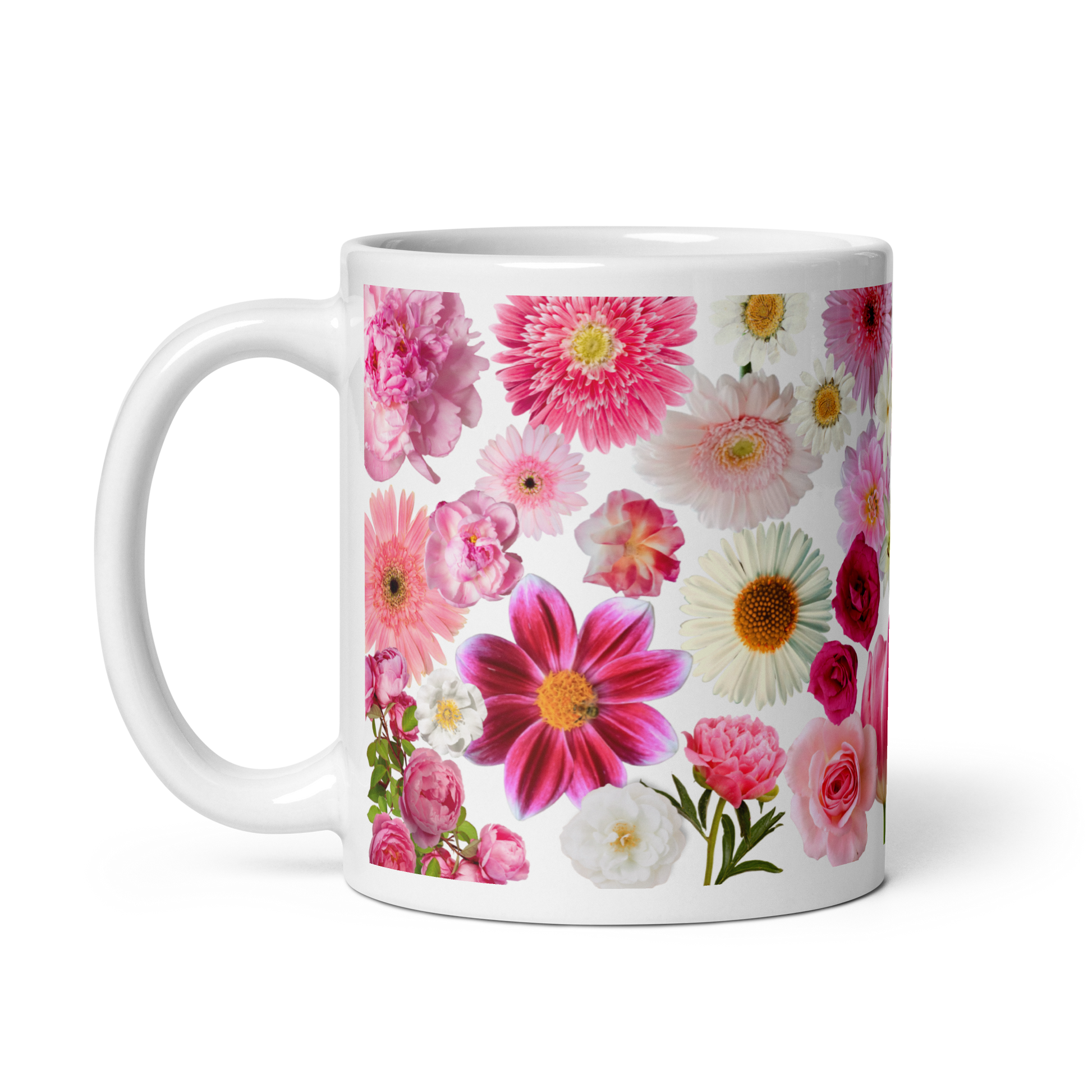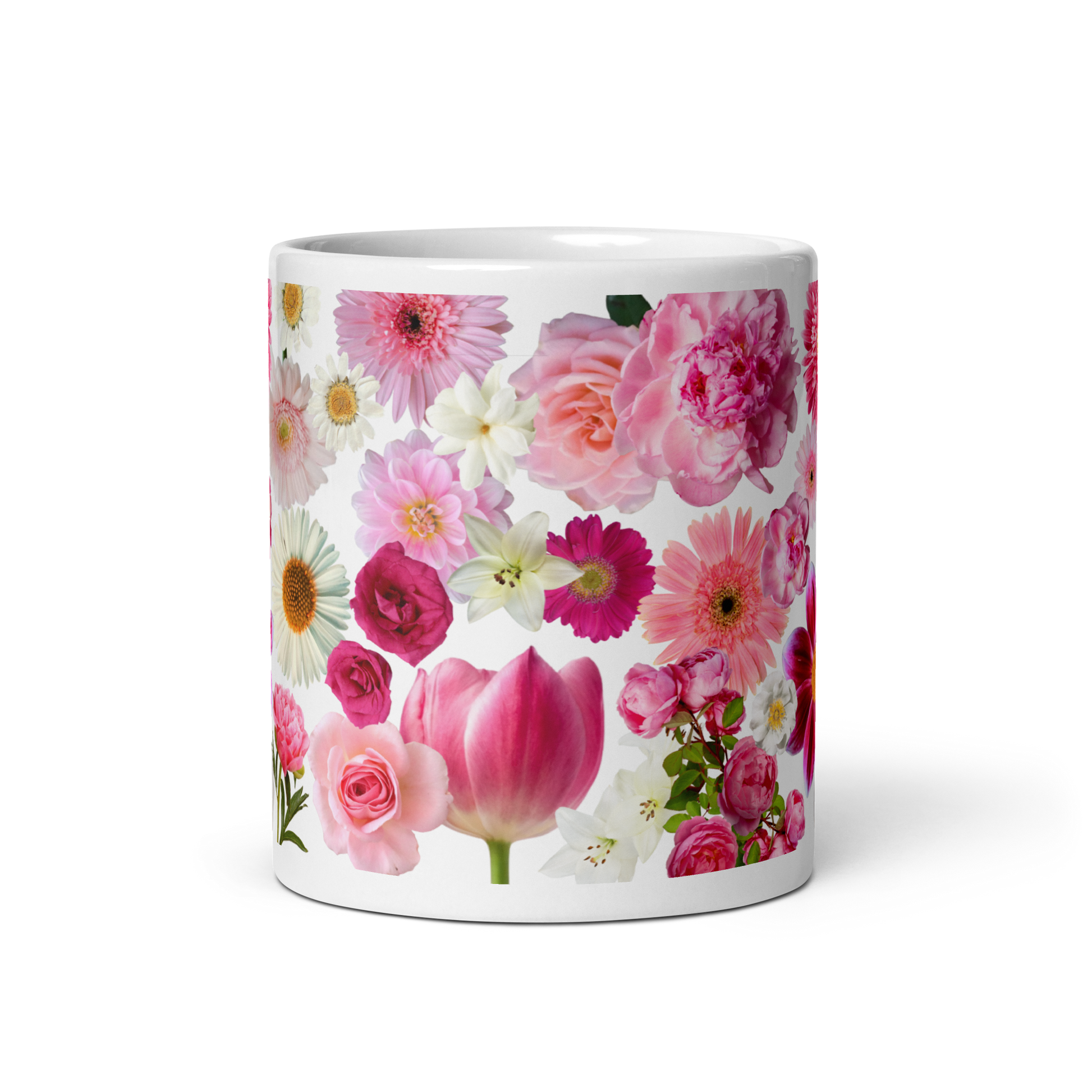 Features photo-real pink and white flowers including tulips, roses, lilies, daisies and more.