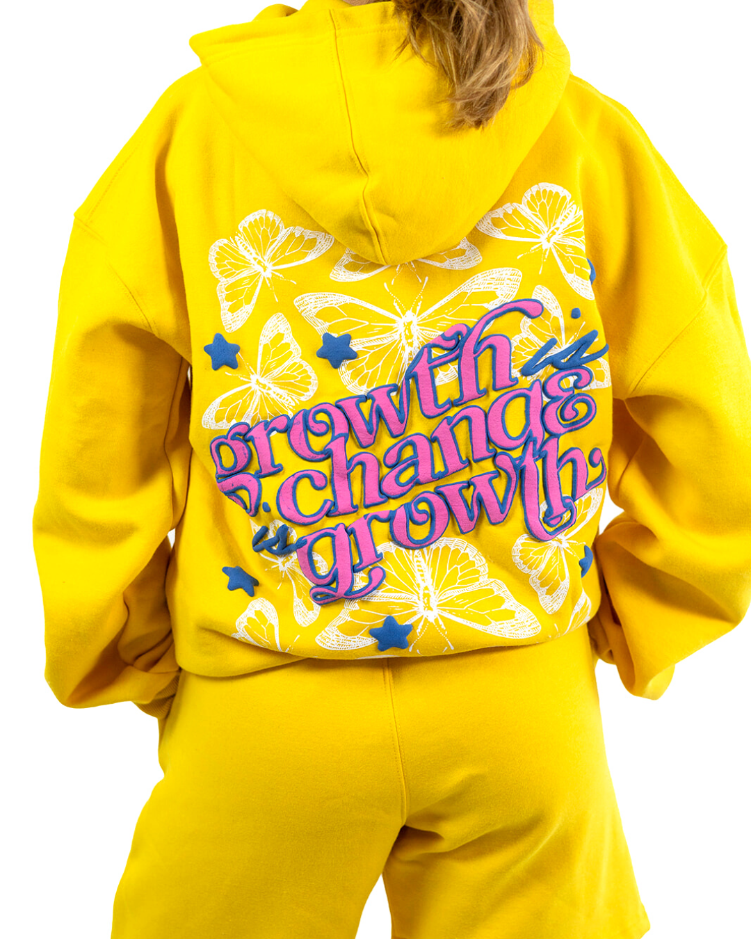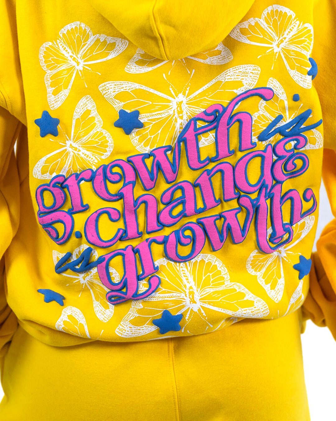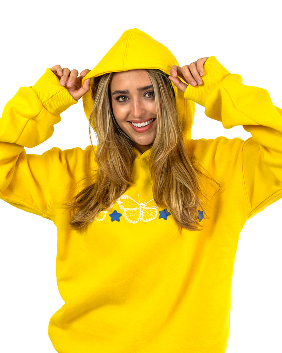 Made with super soft, heavy-weight fleece, 65% cotton, 35% polyester. This yellow unisex hoodie is durable, warm, and cozy - you'll never want to take it off. Features front print of white butterflies and blue stars, and large-scale back print with an inspiring message you can wear anywhere. Stars and pink text are in on-trend 3D puff print for a larger than life look.