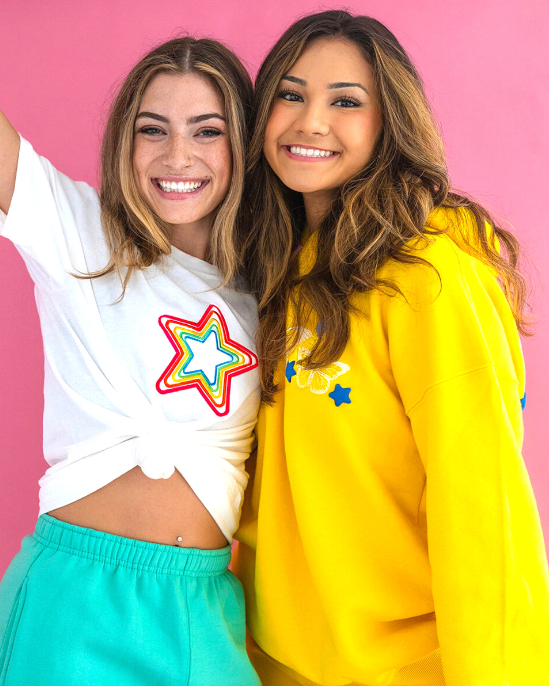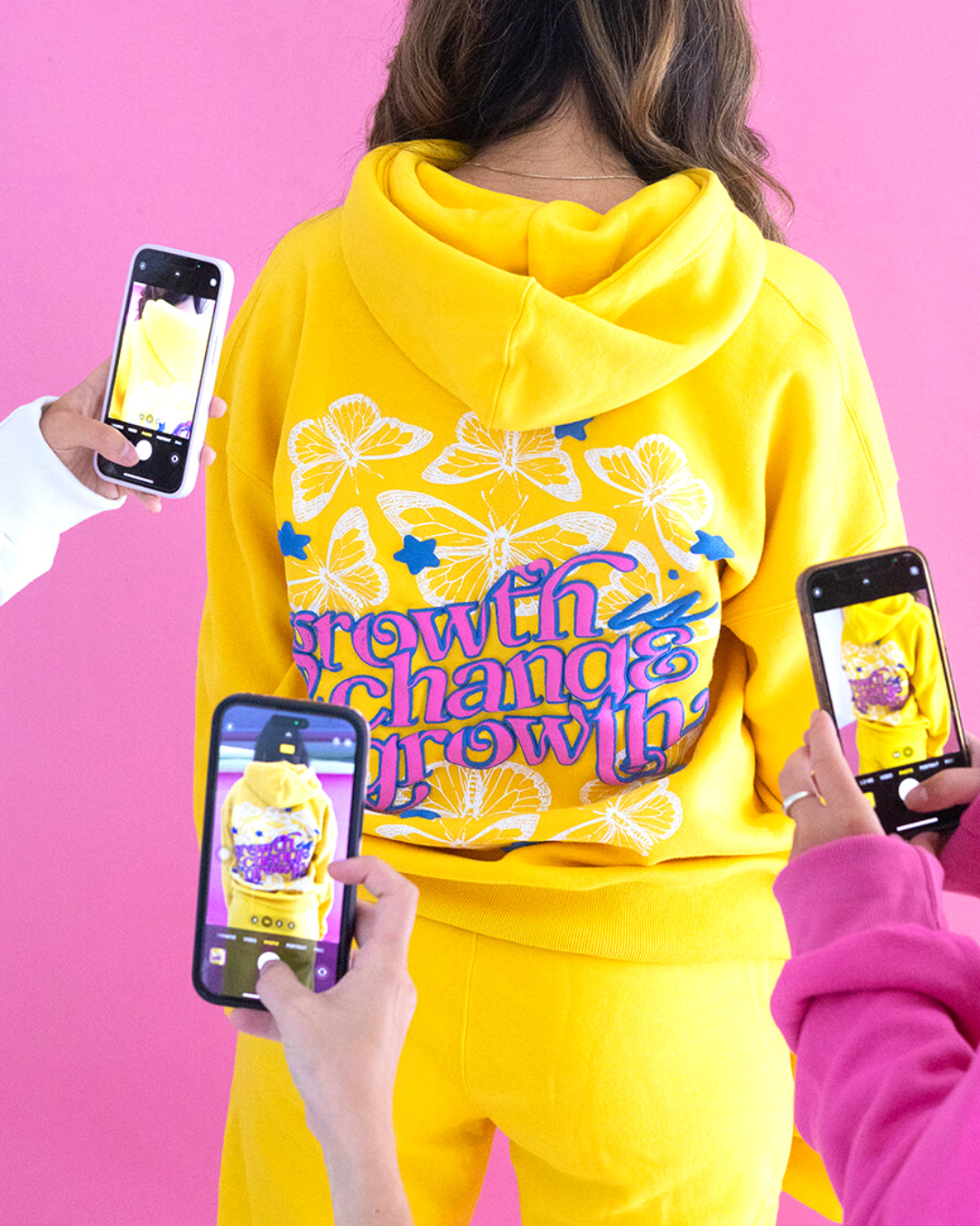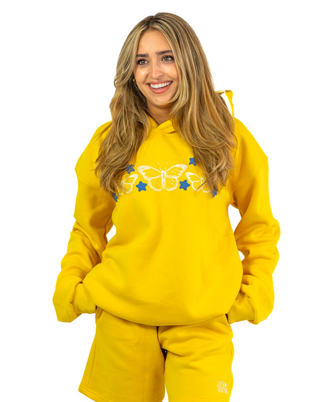 Made with super soft, heavy-weight fleece, 65% cotton, 35% polyester. This yellow unisex hoodie is durable, warm, and cozy - you'll never want to take it off. Features front print of white butterflies and blue stars, and large-scale back print with an inspiring message you can wear anywhere. Stars and pink text are in on-trend 3D puff print for a larger than life look.