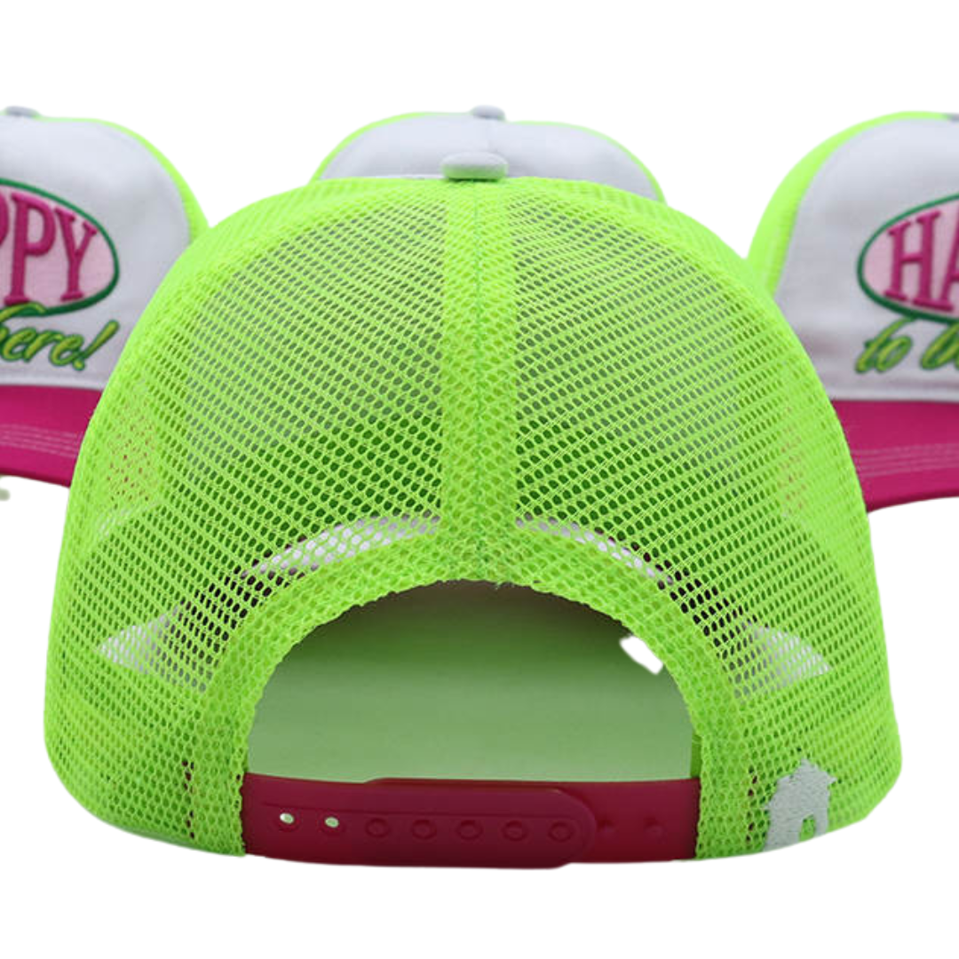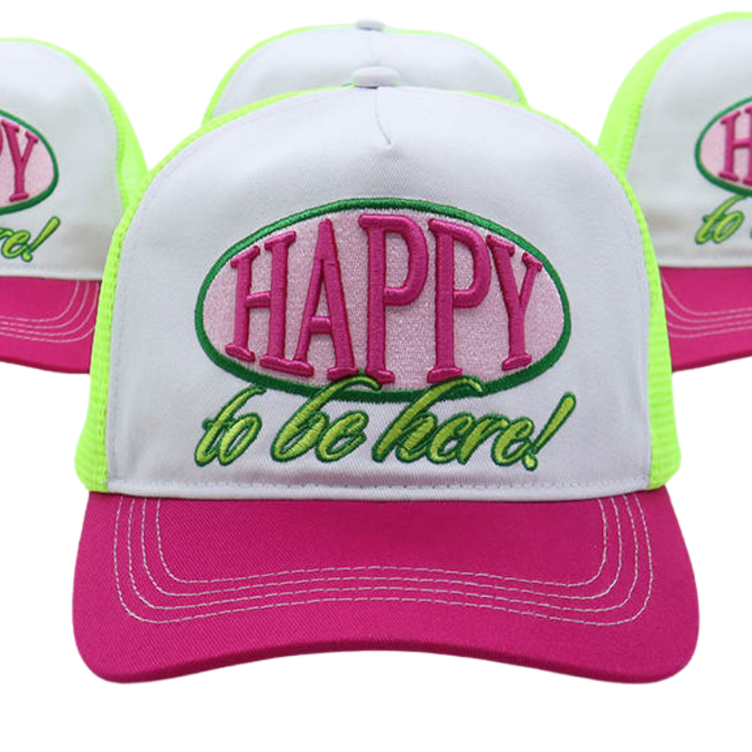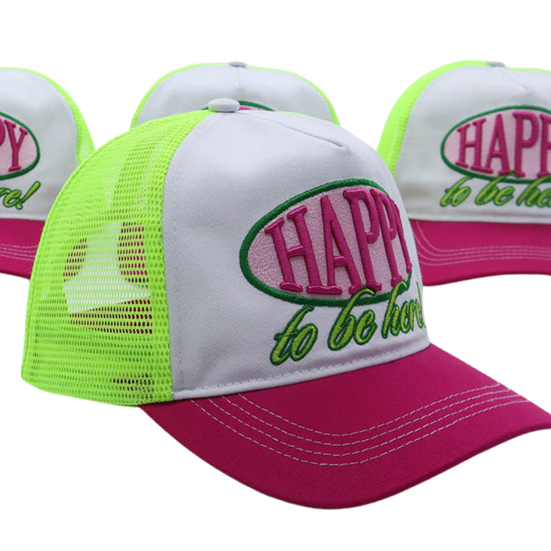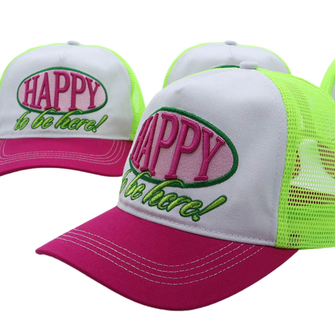 Whether you're accessorizing, getting some shade, or covering up a bad hair day, this trucker hat has got you covered. Mid-profile, unstructured front. High quality 3D embroidery front reads "Happy to be here!" in pink and green.