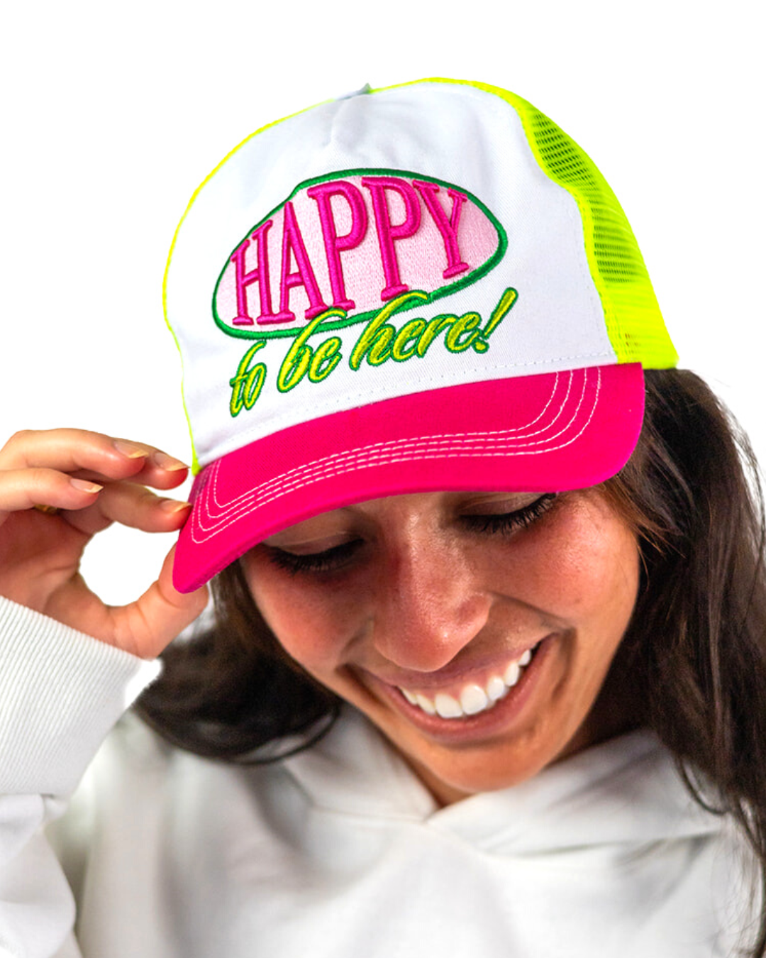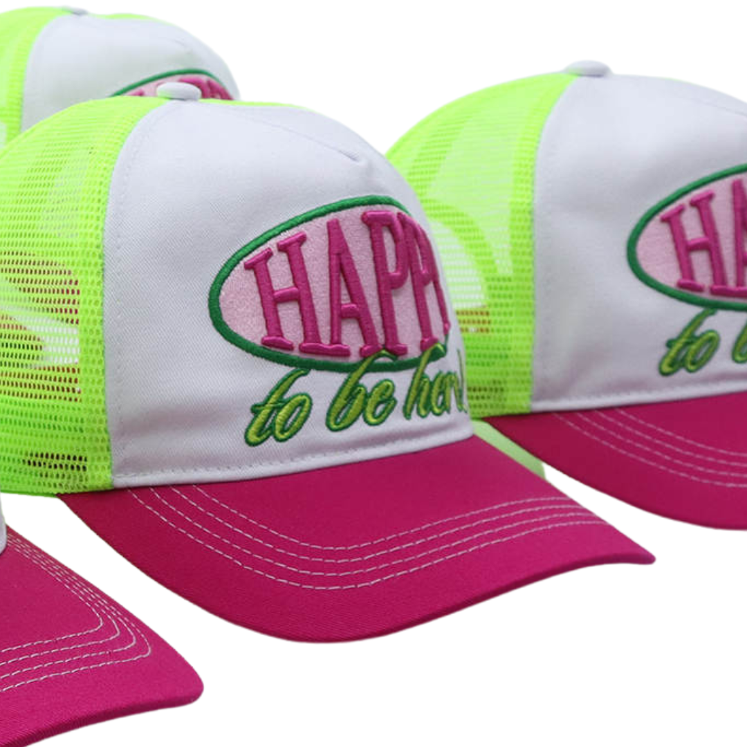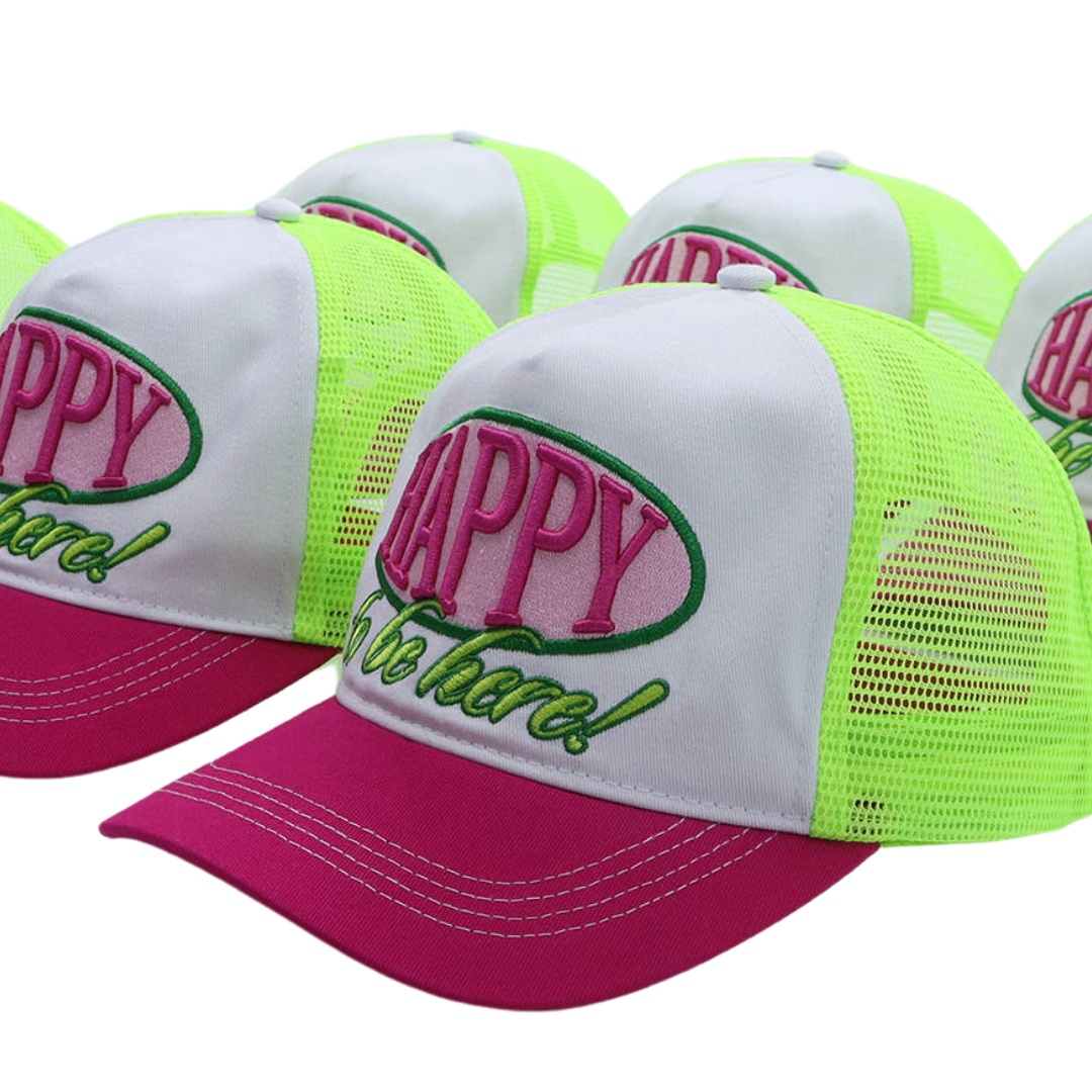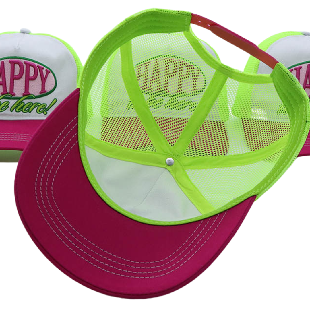 Whether you're accessorizing, getting some shade, or covering up a bad hair day, this trucker hat has got you covered. Mid-profile, unstructured front. High quality 3D embroidery front reads "Happy to be here!" in pink and green.