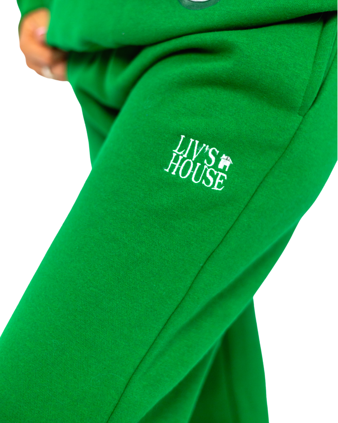Made with super soft, heavy-weight fleece, 65% cotton, 35% polyester. These green unisex sweats have a tapered boyfriend fit, and are durable, warm, and cozy - you'll never want to take them off. Features the Liv's House logo embroidered at the left hip, stretchy elastic waistband, and side pockets. Inseam 30" on size M.