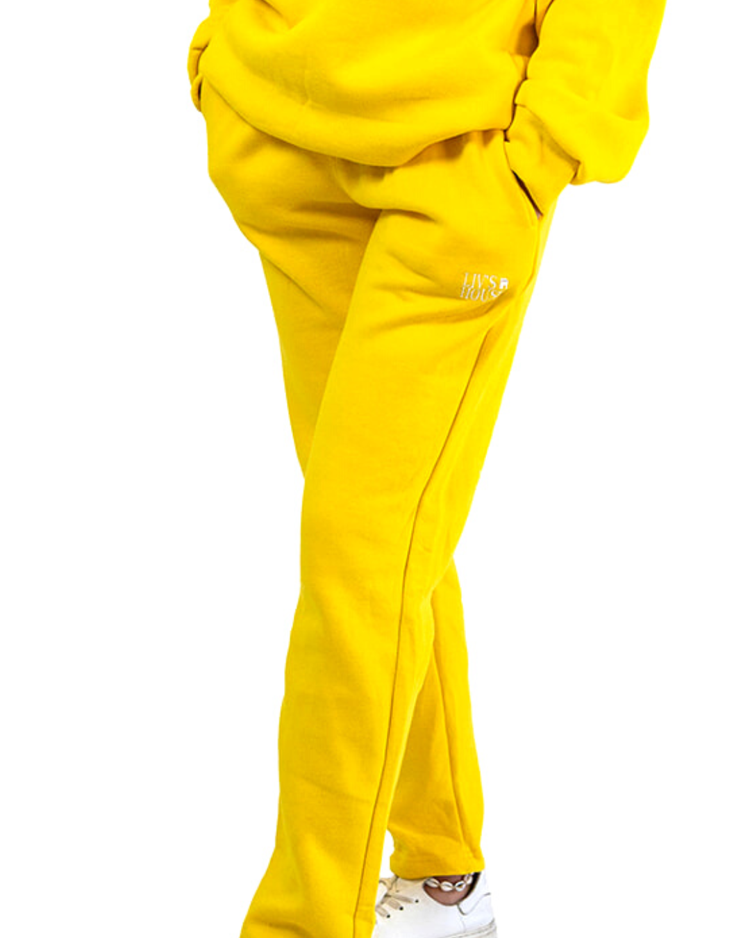 Made with super soft, heavy-weight fleece, 65% cotton, 35% polyester. These yellow unisex sweats have a tapered boyfriend fit, and are durable, warm, and cozy - you'll never want to take them off. Features the Liv's House logo embroidered at the left hip, stretchy elastic waistband, and side pockets. Inseam 30" on size M.