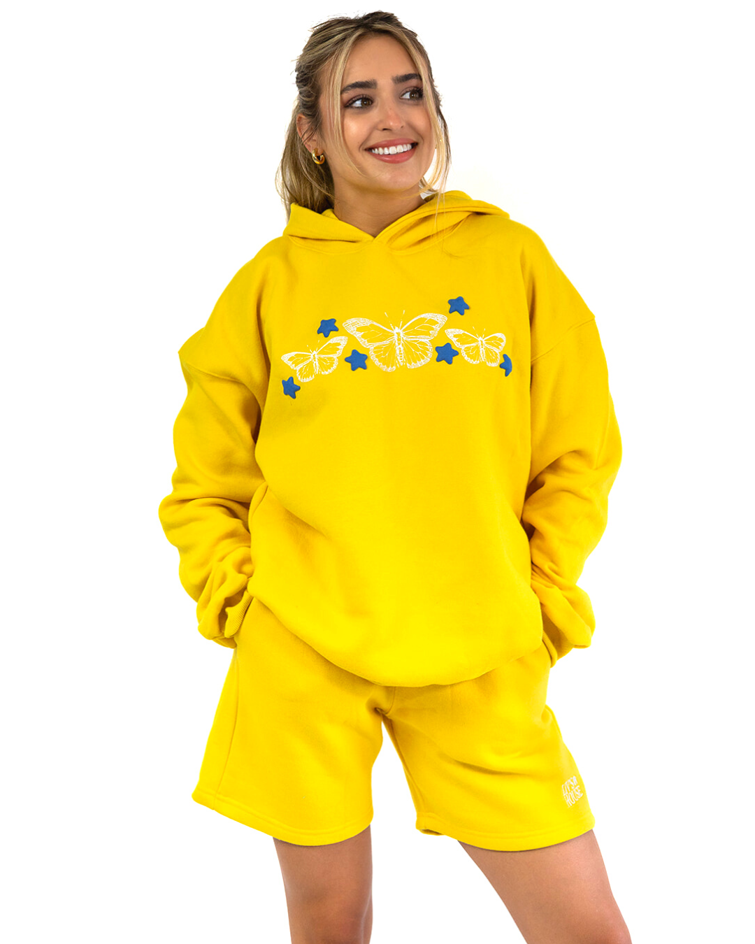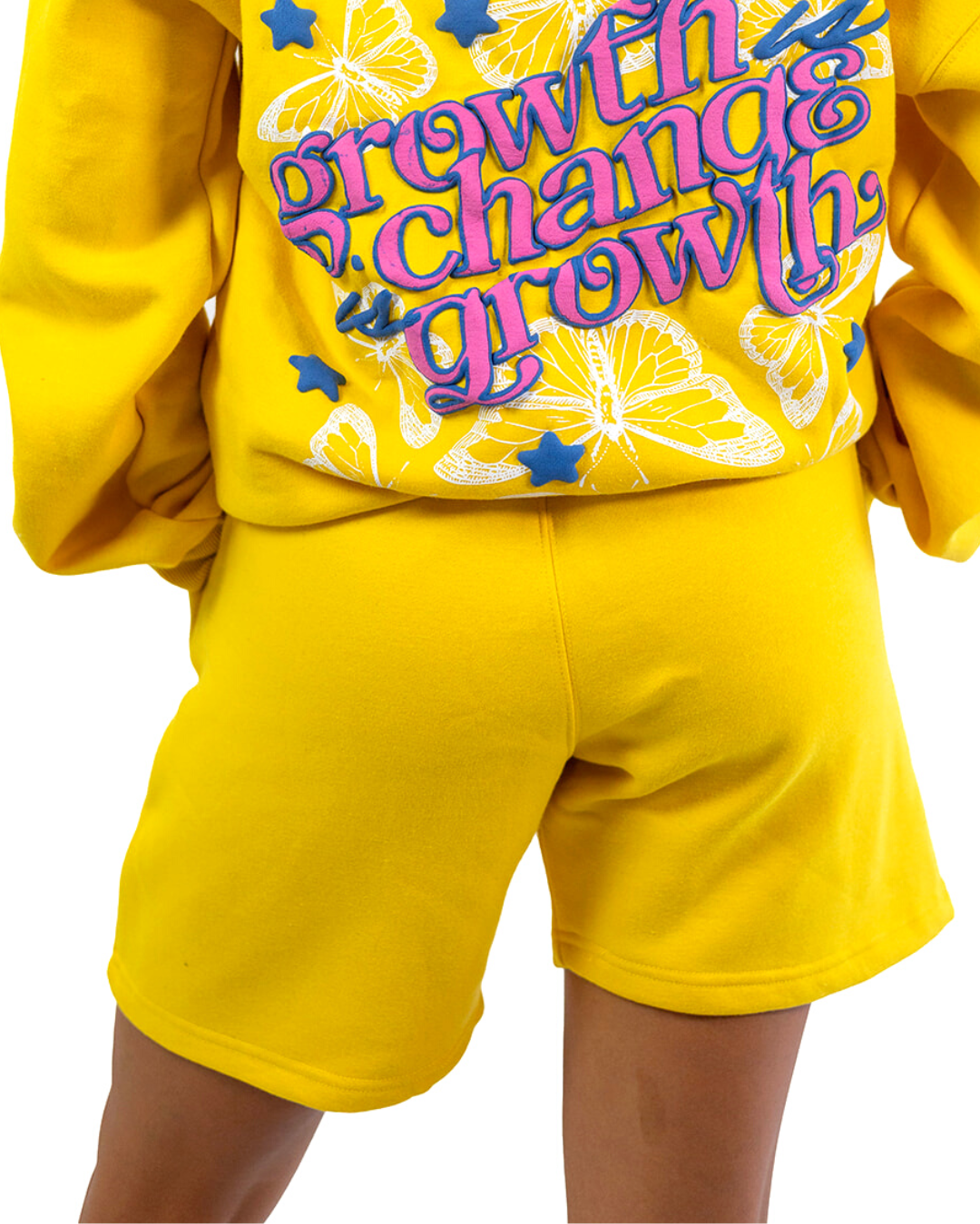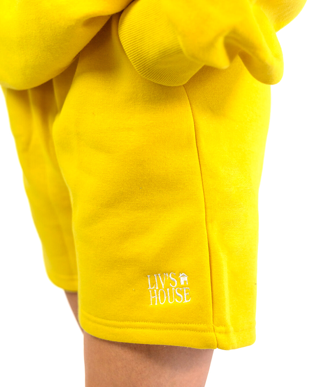 Made with super soft, heavy-weight fleece, 65% cotton, 35% polyester. These yellow unisex shorts have a boyfriend fit, and are durable, warm, and cozy - you'll never want to take them off. Features the Liv's House logo embroidered at the left hip, finished hem, stretchy elastic waistband, and side pockets. Inseam 6.5" on size M.