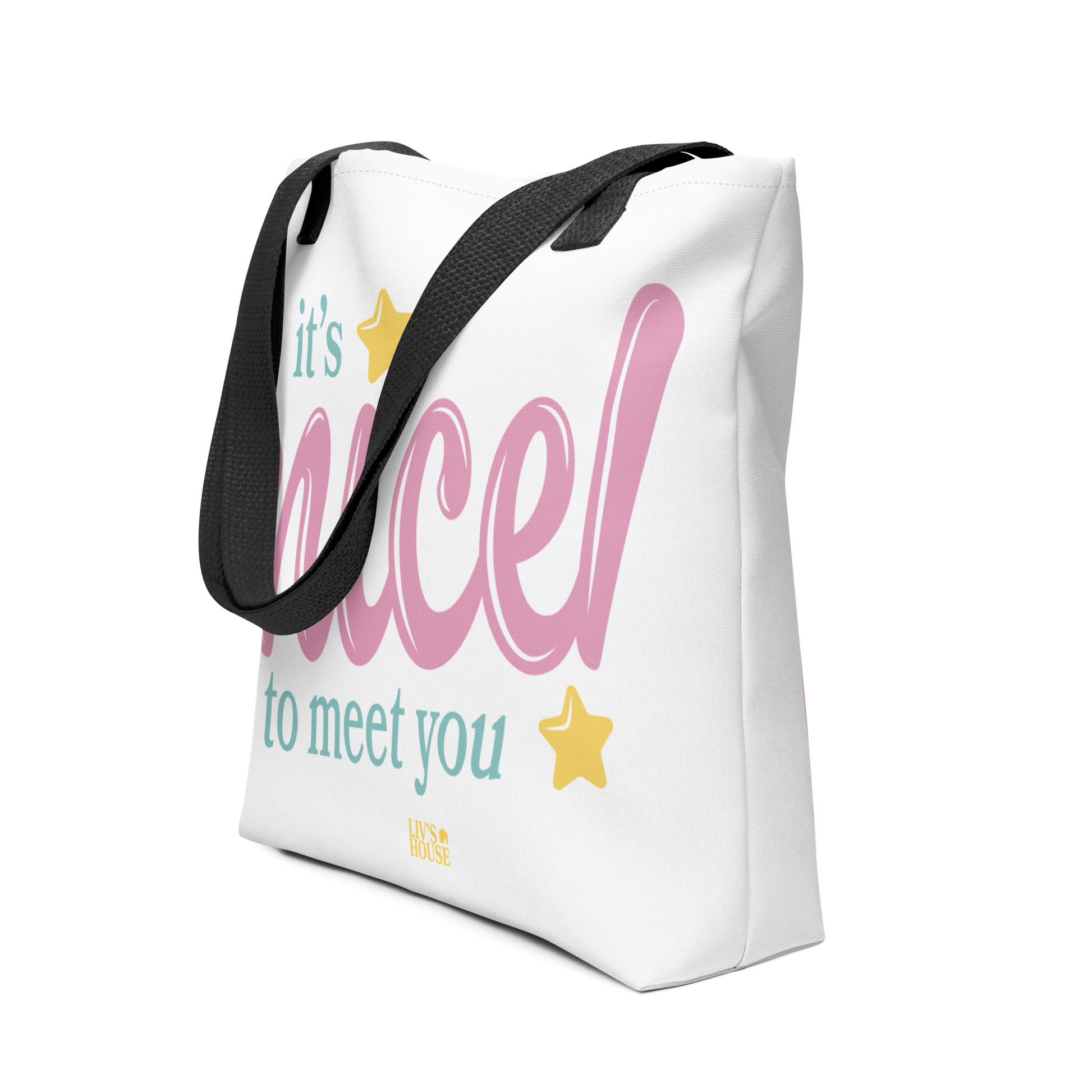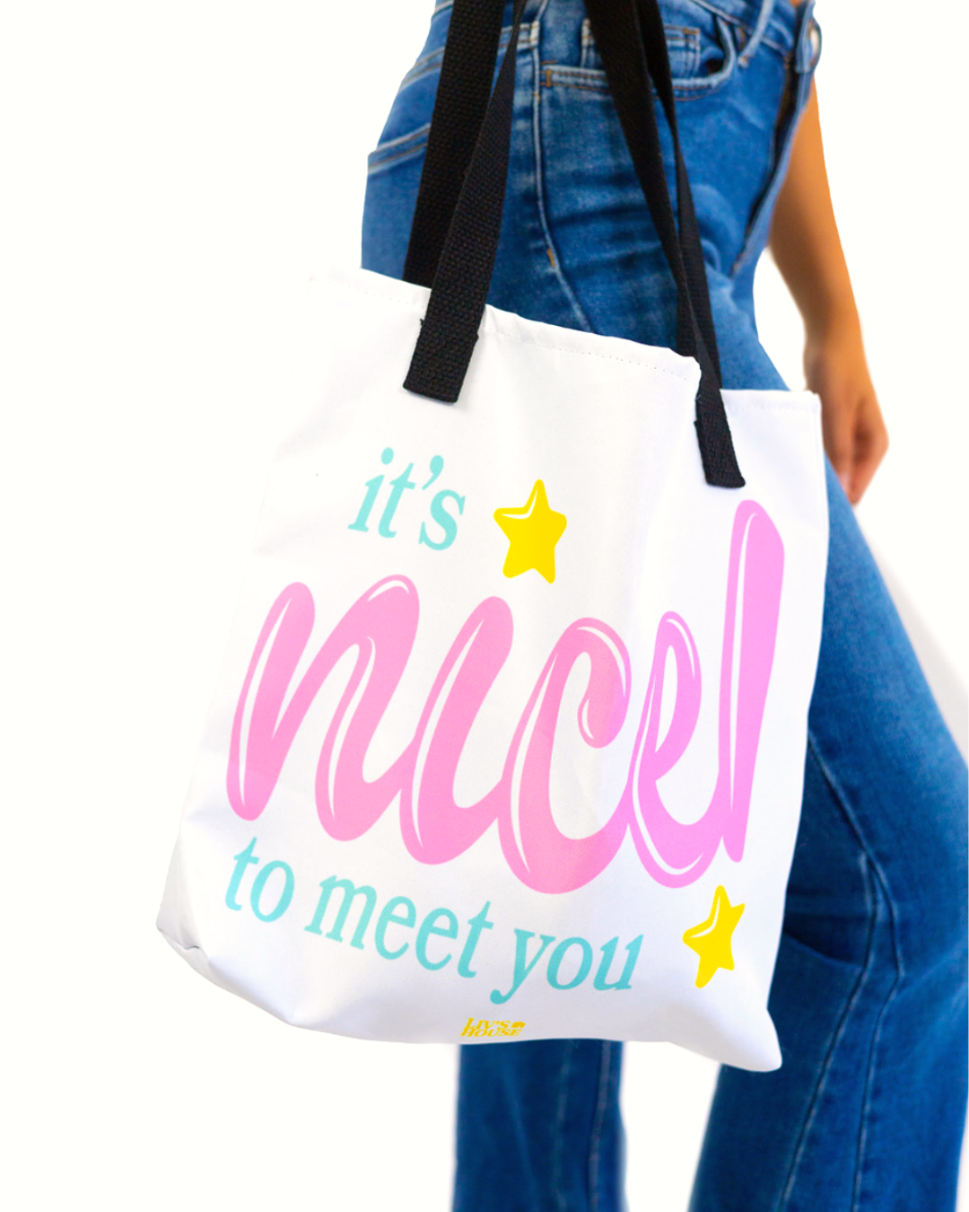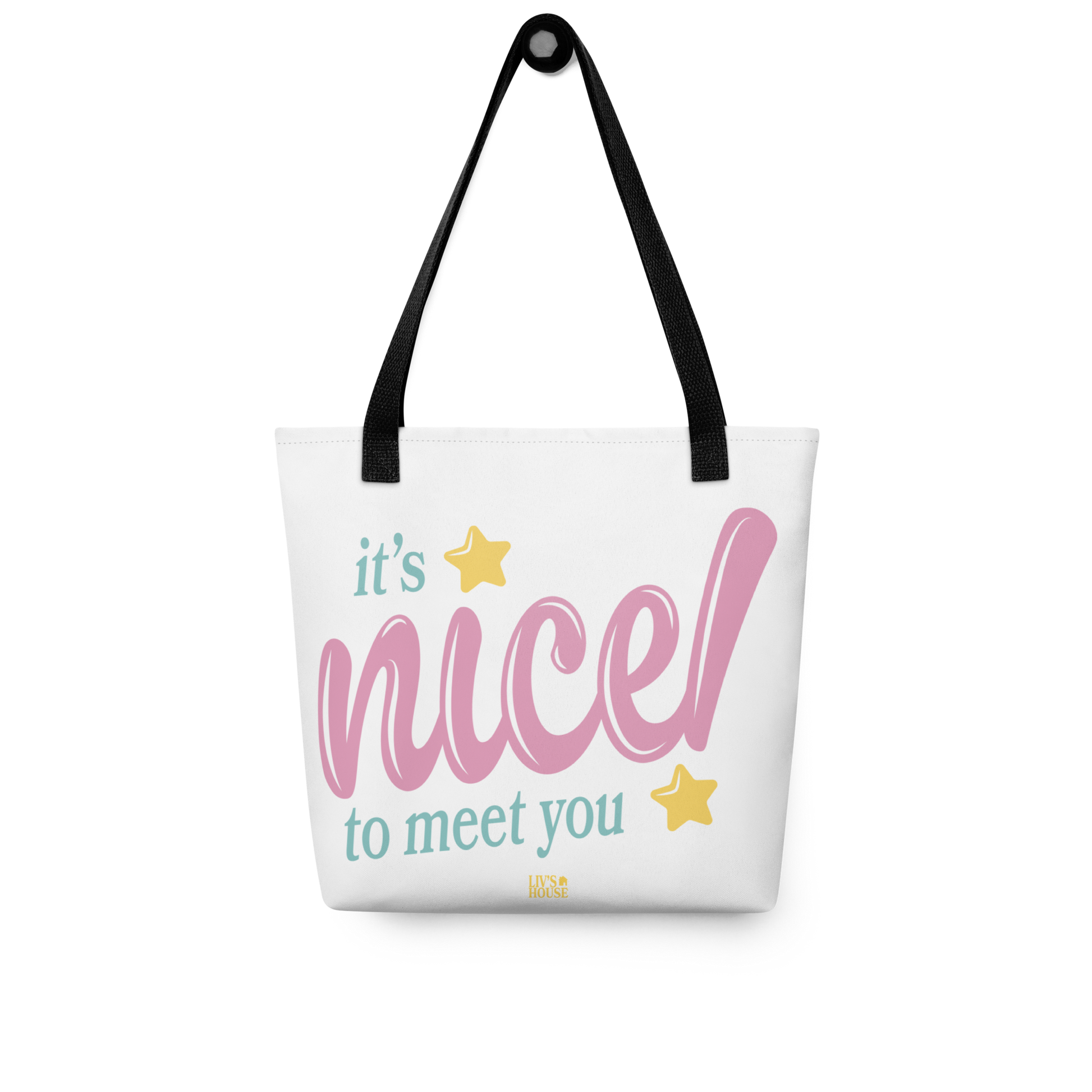 Whether you're walking to class, out on the town with friends, grocery shopping, or heading to work, this bag is perfect for toting along everything that you need for your best day ever. Tote features pink and blue text reading "It's nice to meet you!" with yellow star accents.