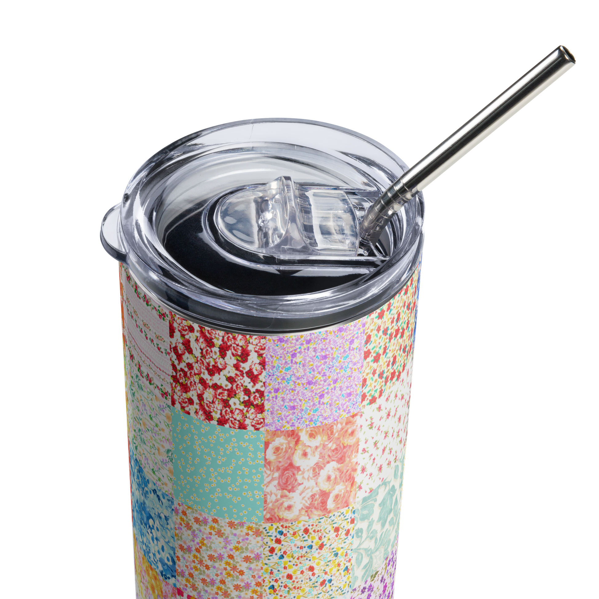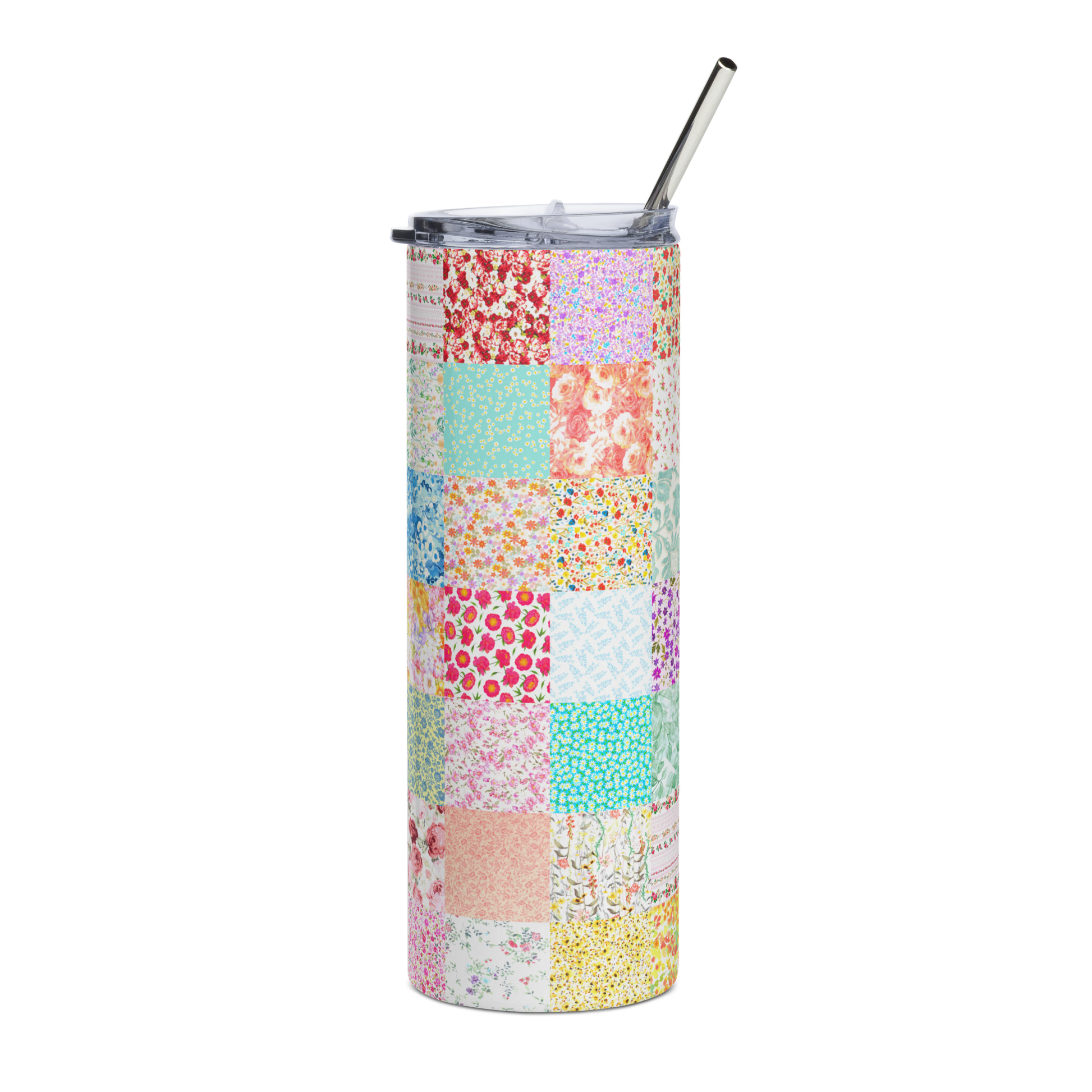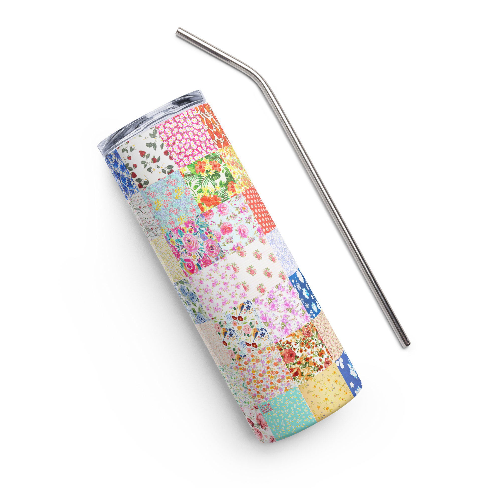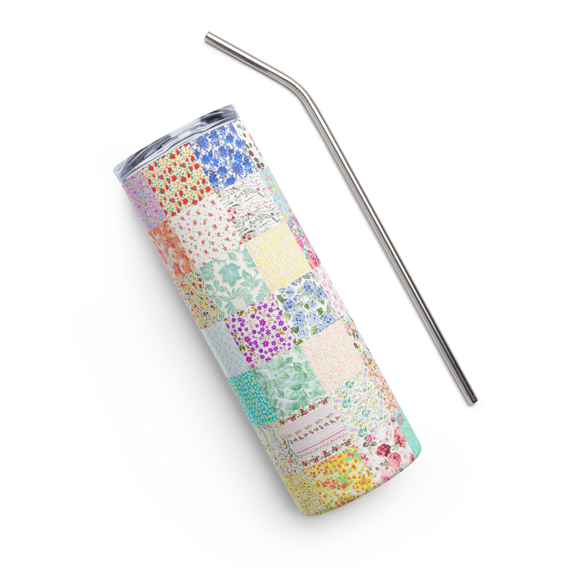 Patchwork design features a variety of colorful floral fabric patterns in a quilt-inspired style.