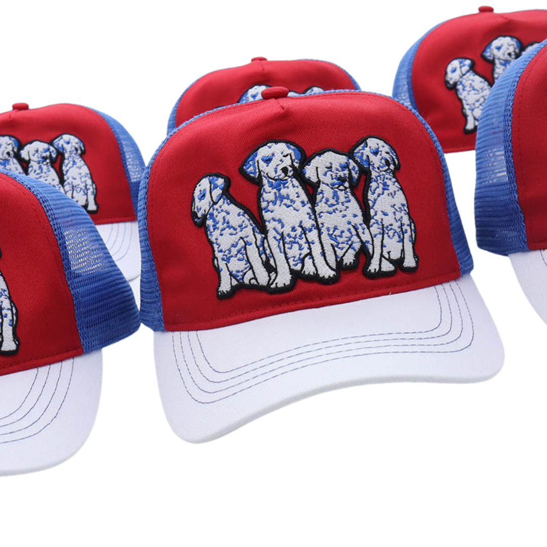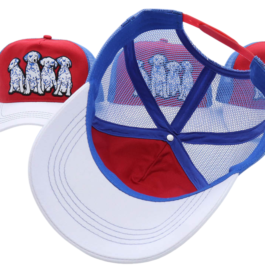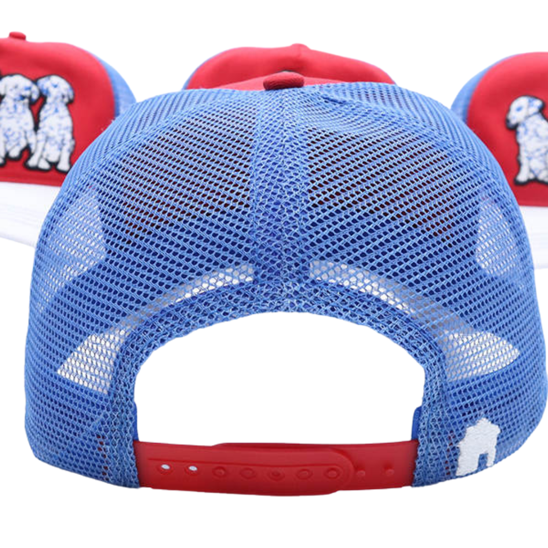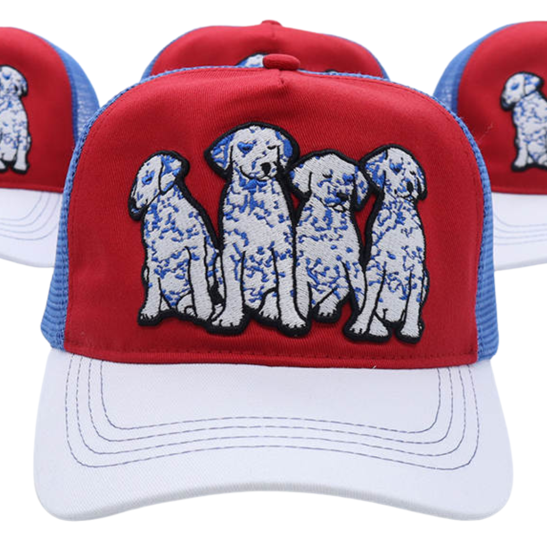 Whether you're accessorizing, getting some shade, or covering up a bad hair day, this trucker has got you covered. Mid-profile, unstructured front. Features high quality embroidery front depicting the cutest Dalmatian puppies in blue, white, and black, for all of the dog lovers and pet parents out there.