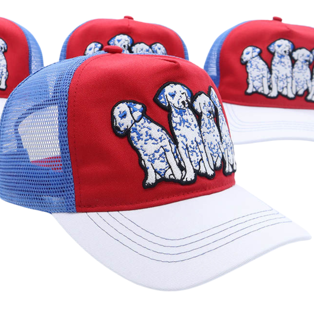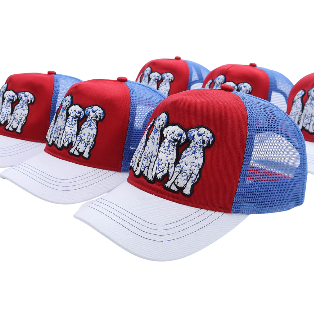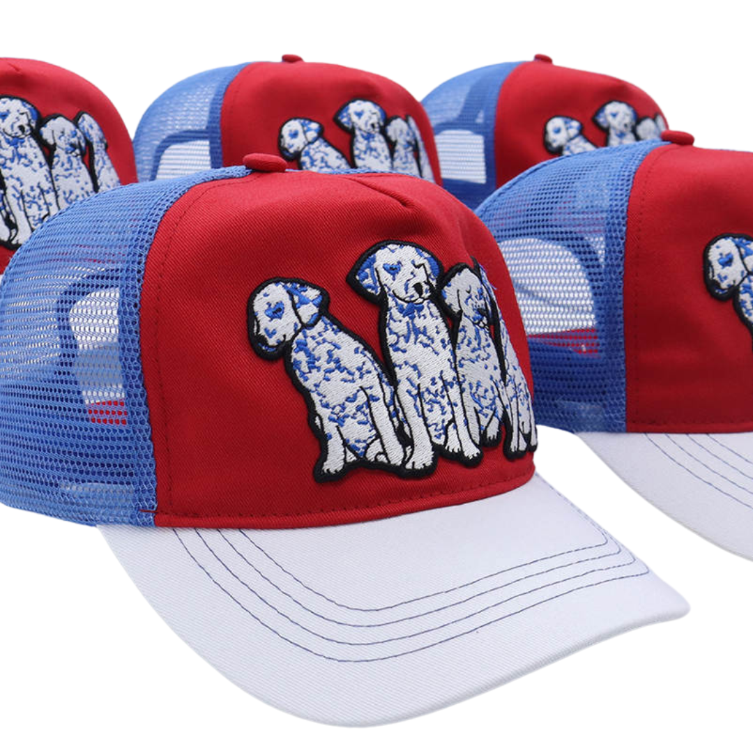 Whether you're accessorizing, getting some shade, or covering up a bad hair day, this trucker has got you covered. Mid-profile, unstructured front. Features high quality embroidery front depicting the cutest Dalmatian puppies in blue, white, and black, for all of the dog lovers and pet parents out there.