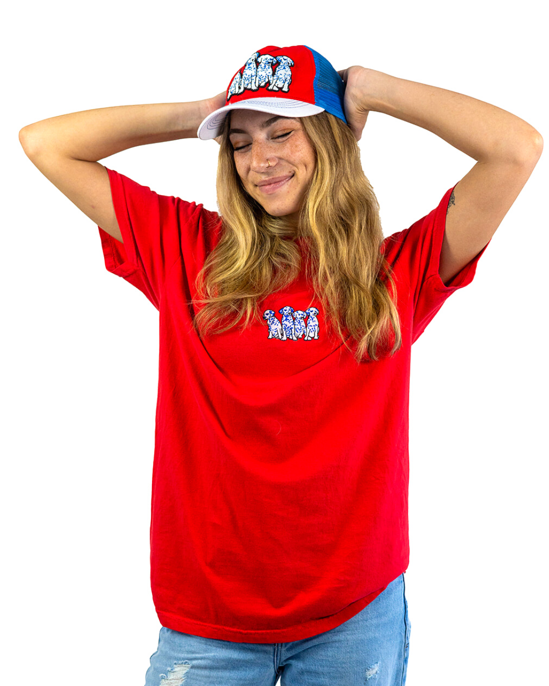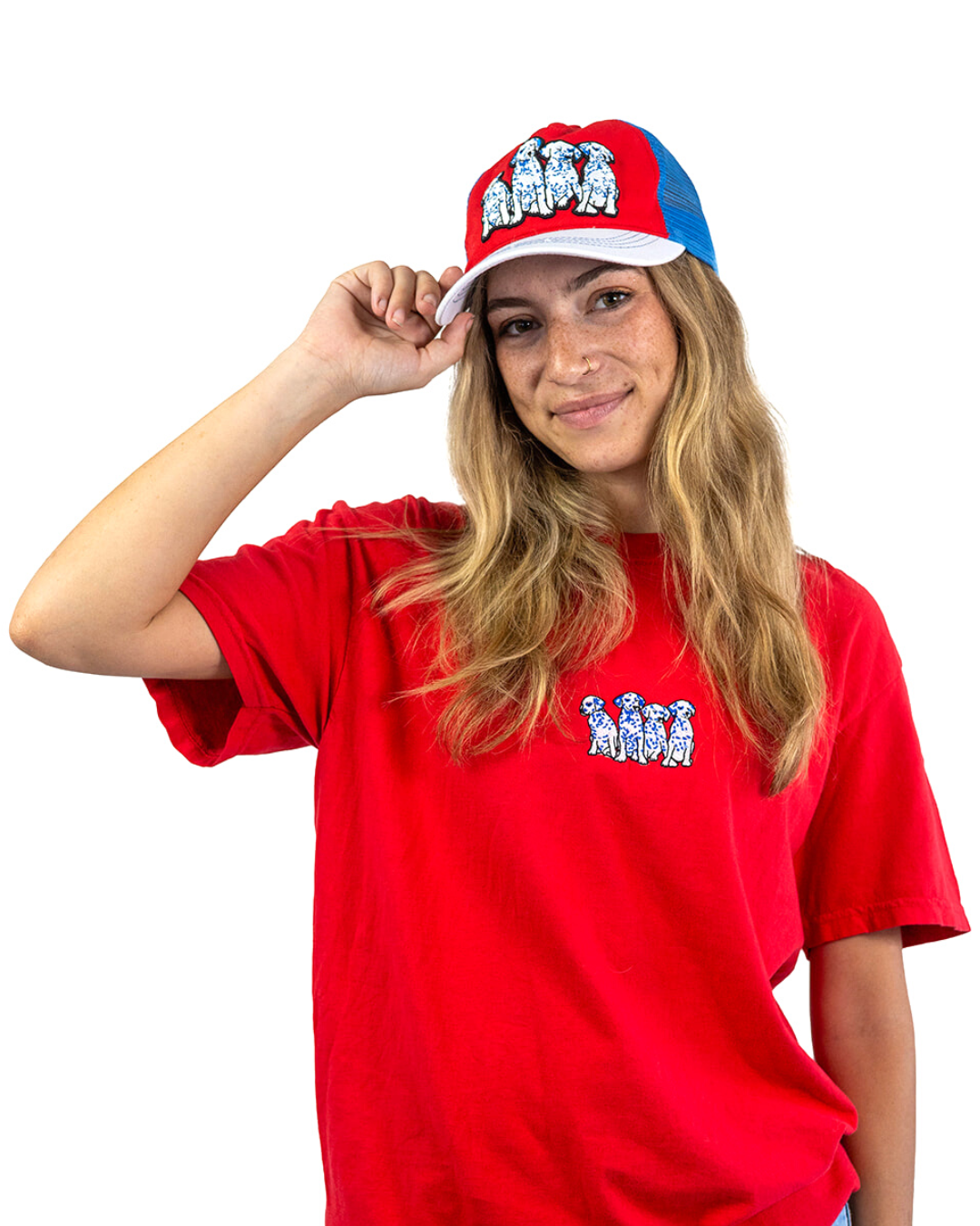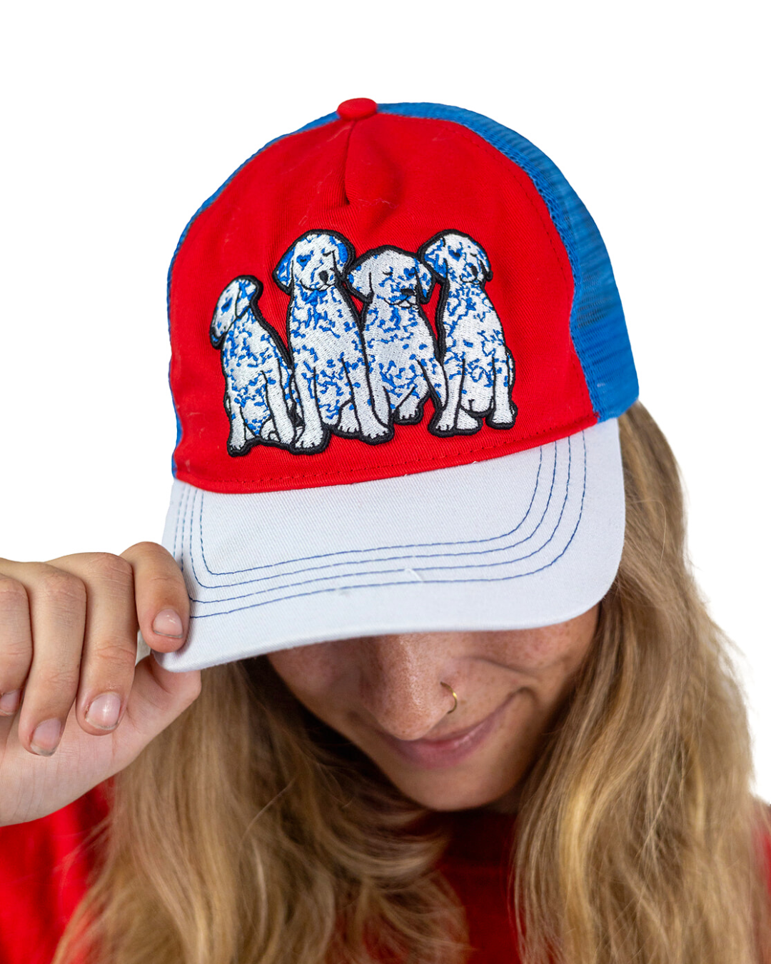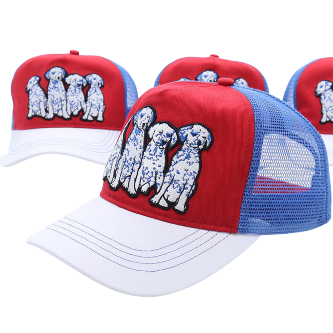 Whether you're accessorizing, getting some shade, or covering up a bad hair day, this trucker has got you covered. Mid-profile, unstructured front. Features high quality embroidery front depicting the cutest Dalmatian puppies in blue, white, and black, for all of the dog lovers and pet parents out there.
