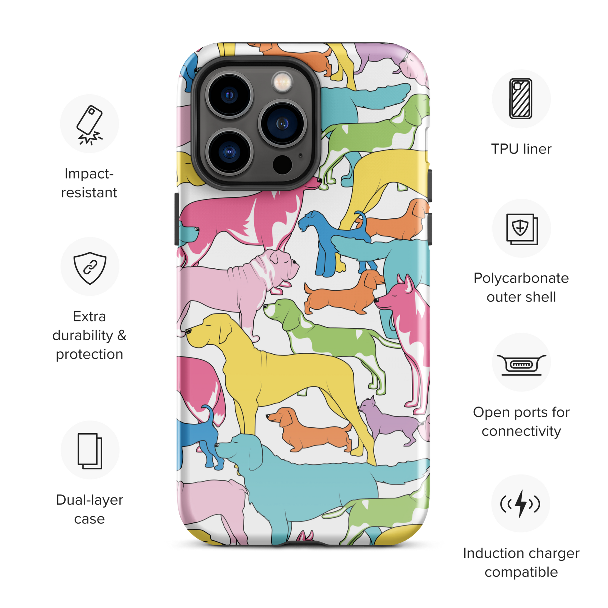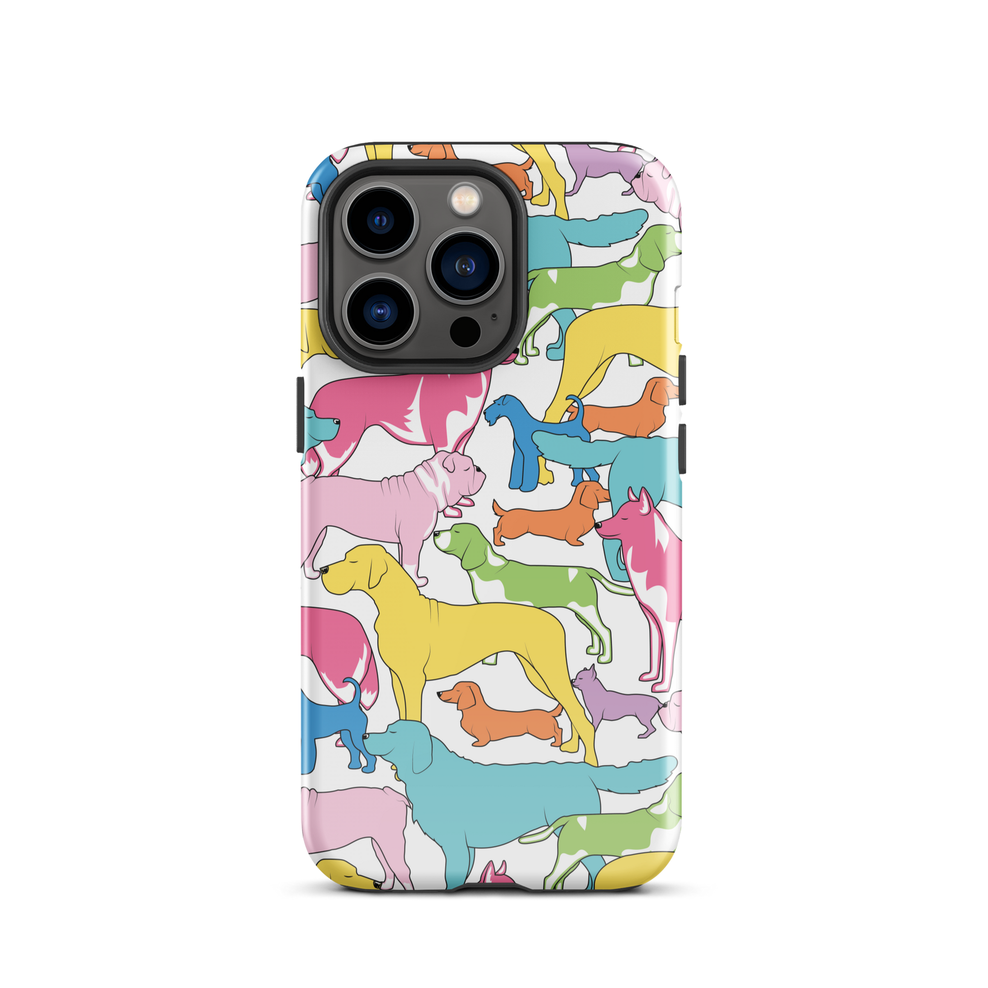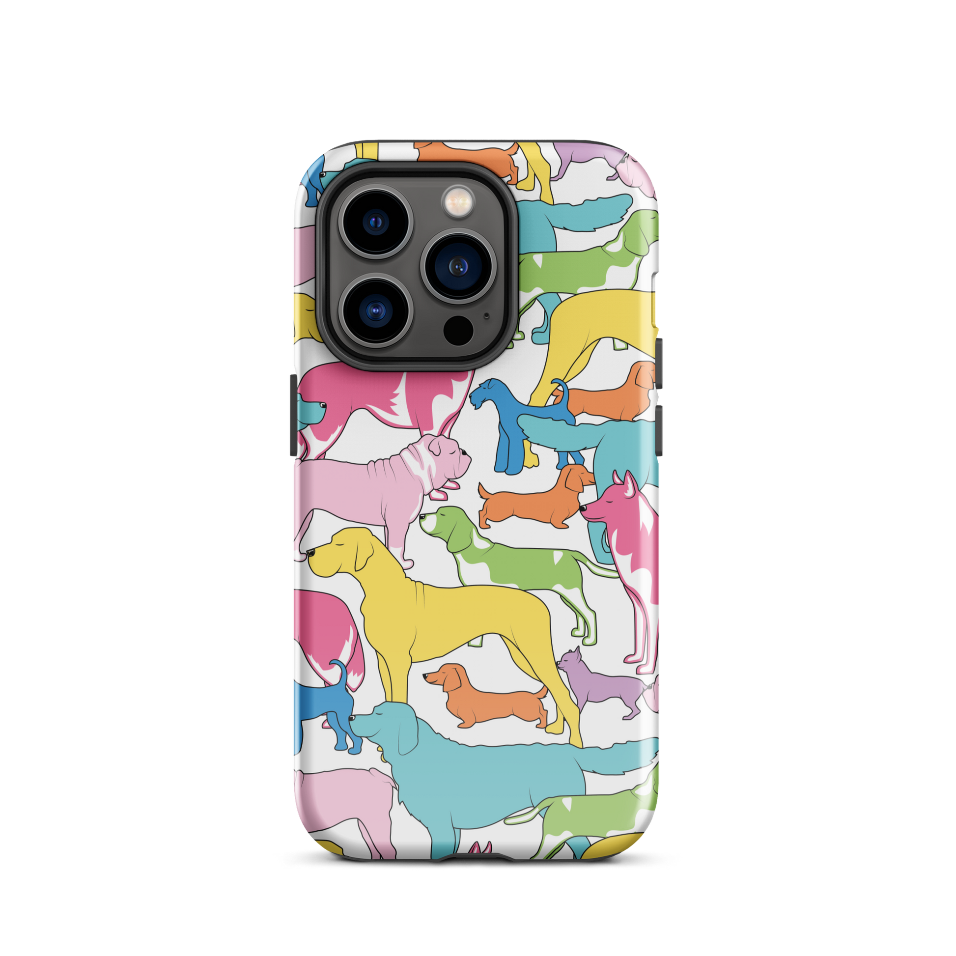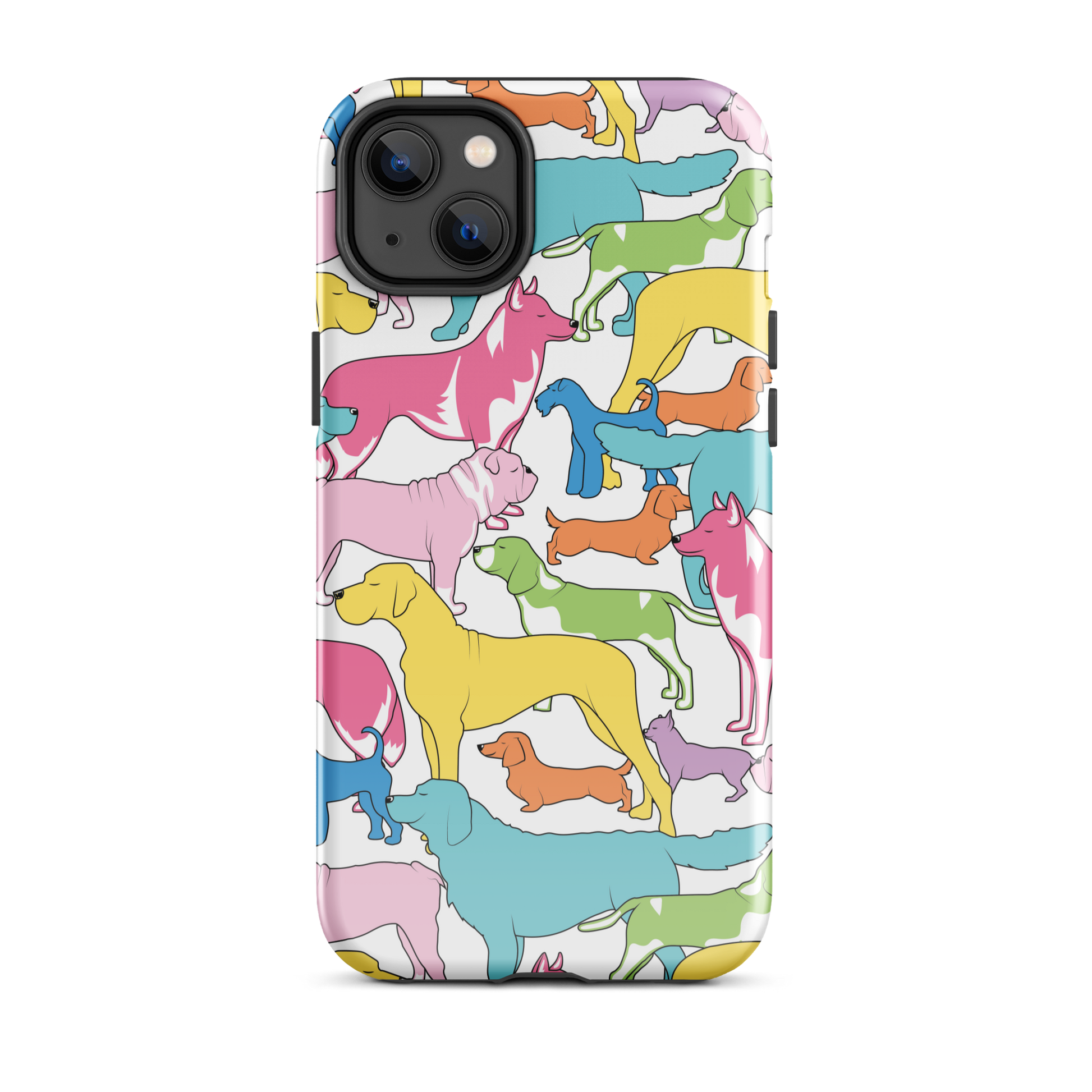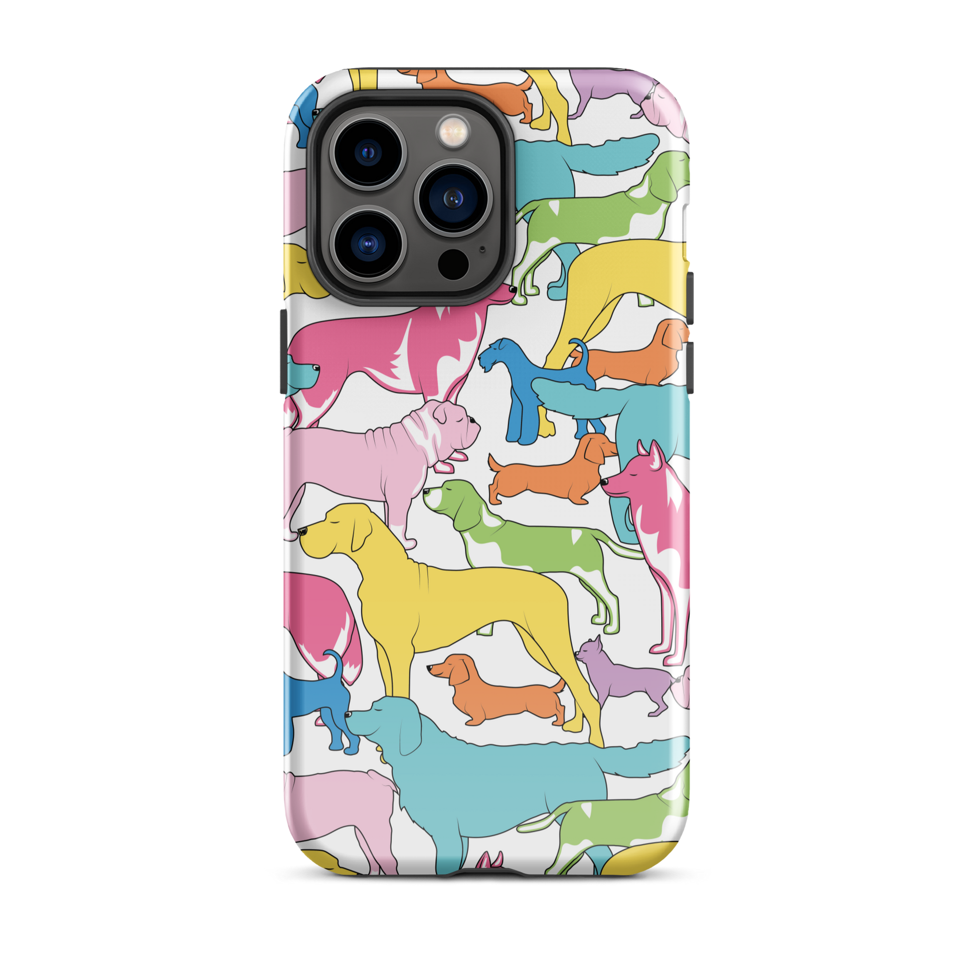 Design features a rainbow of dogs in a variety of breeds, including Great Danes, huskies, golden retrievers, Dachshunds, beagles, chihuahuas, terriers, and bulldogs. Perfect for dog lovers and pet parents!