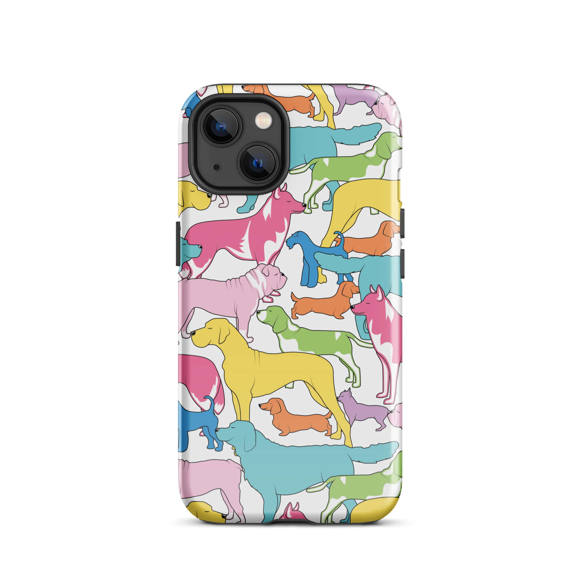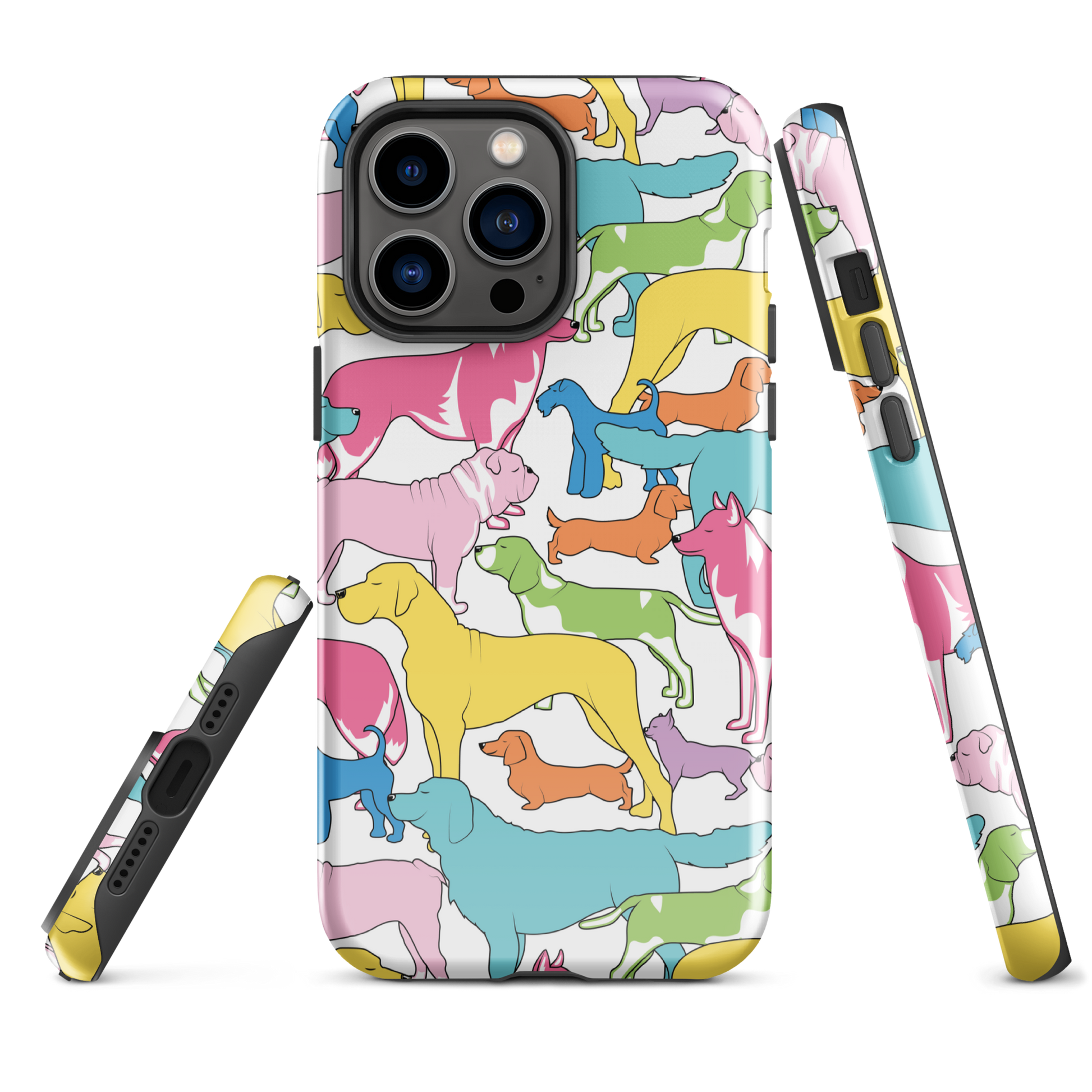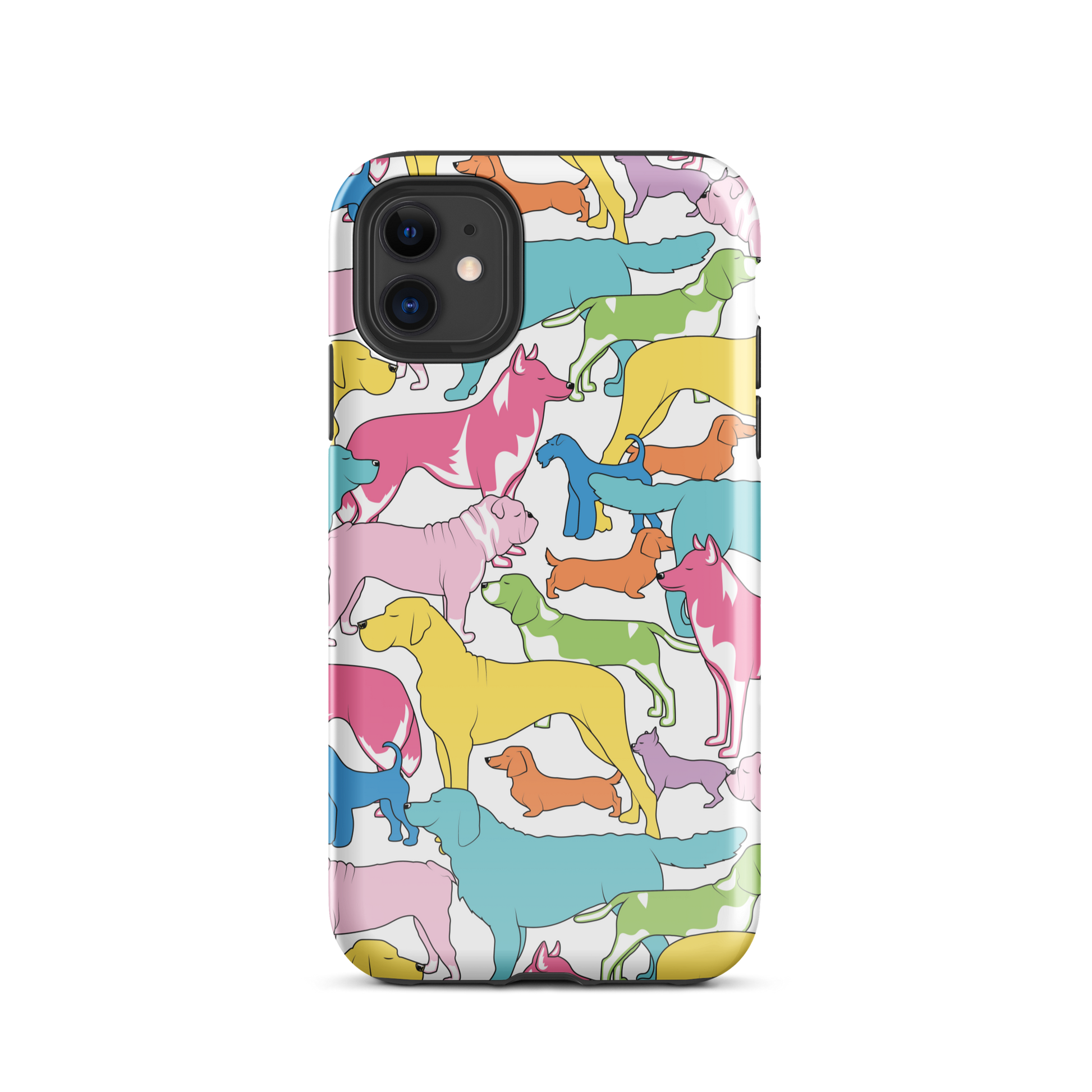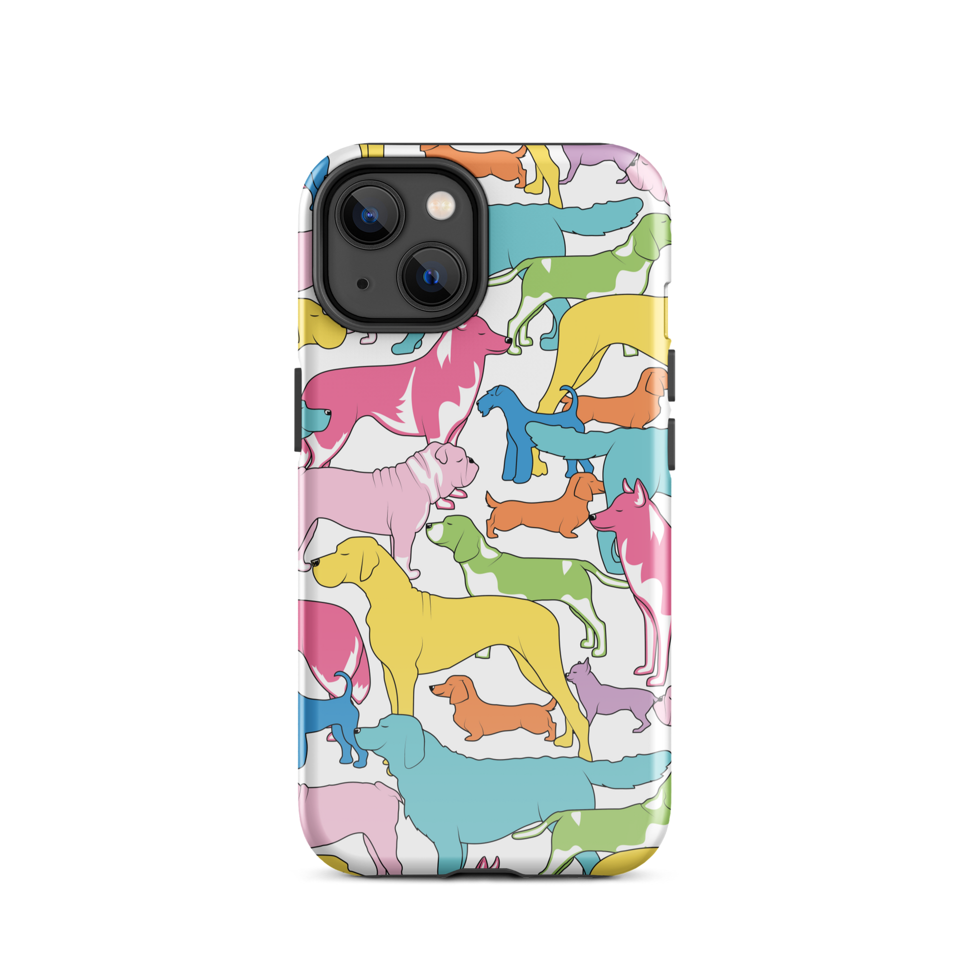 Design features a rainbow of dogs in a variety of breeds, including Great Danes, huskies, golden retrievers, Dachshunds, beagles, chihuahuas, terriers, and bulldogs. Perfect for dog lovers and pet parents!