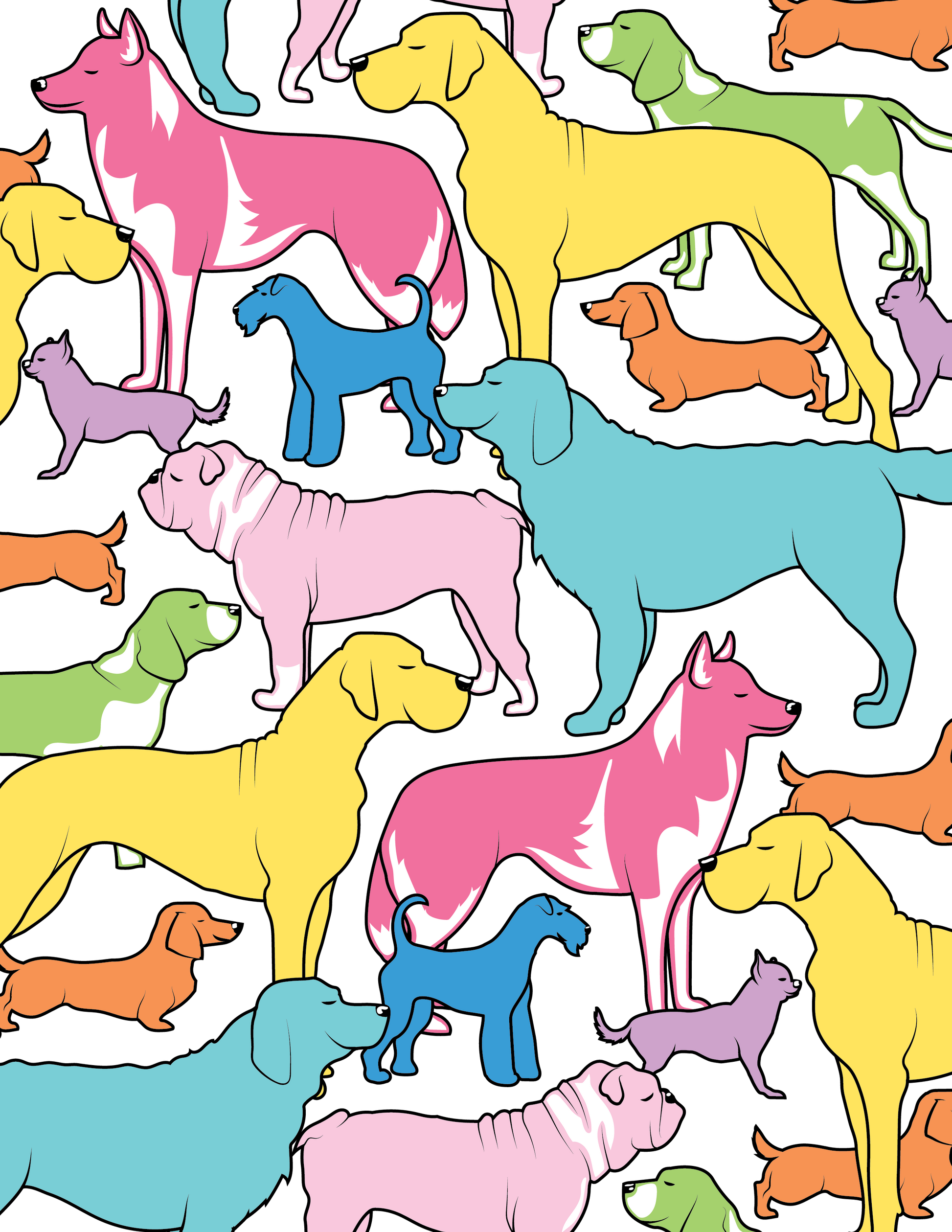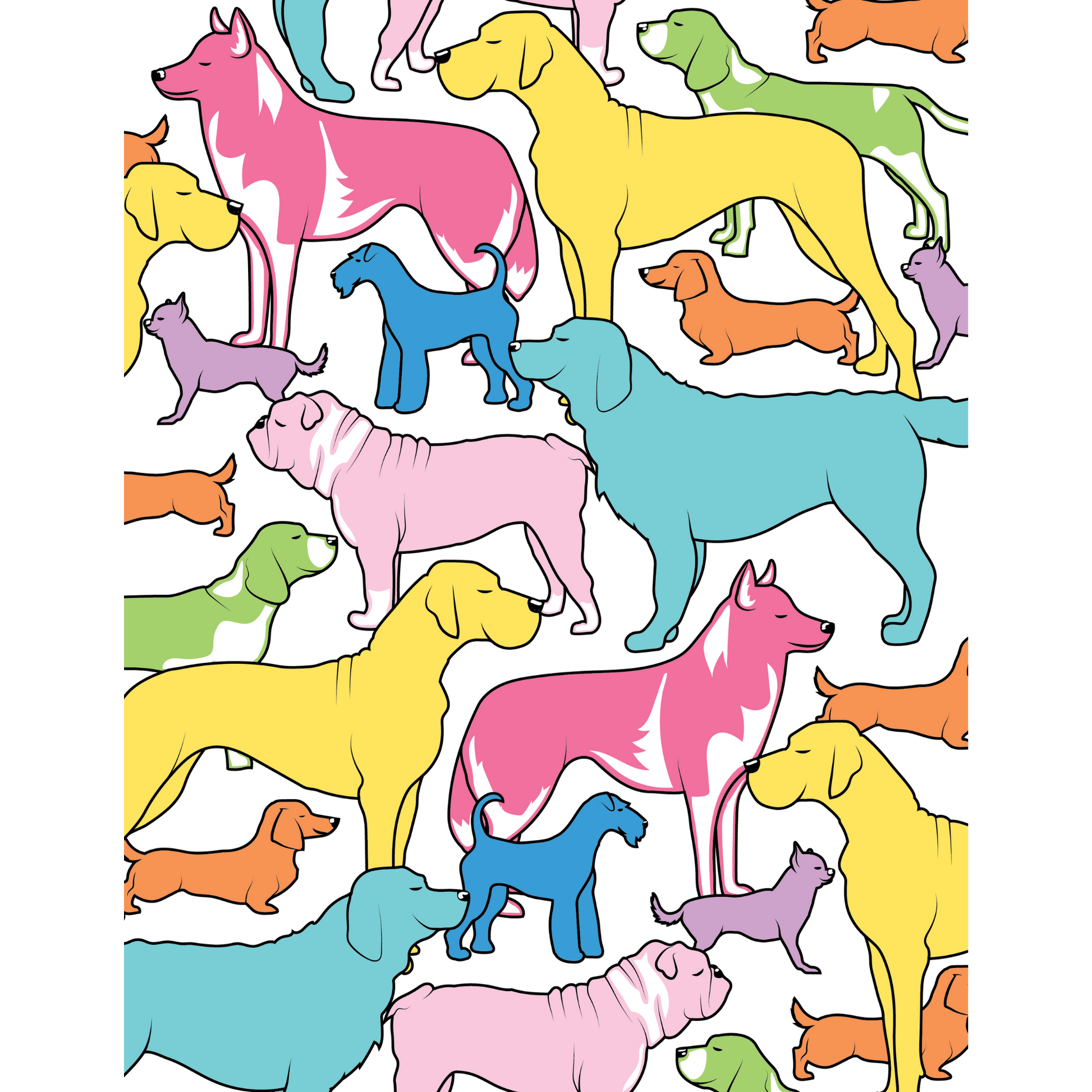 Design features a rainbow of dogs in a variety of breeds, including Great Danes, huskies, golden retrievers, Dachshunds, beagles, chihuahuas, terriers, and bulldogs. Perfect for dog lovers and pet parents.