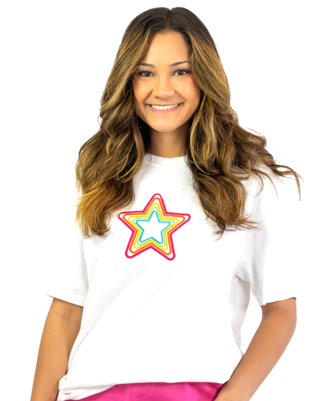 Embroidered on heavy-weight, high quality Comfort Colors tees with a relaxed fit and structured look. Size up for an oversized fit! This shirt is durable and long-lasting, made of 100% preshrunk ring-spun cotton. Embroidery features concentric stars in pink, orange, yellow, green, and blue - a full rainbow!