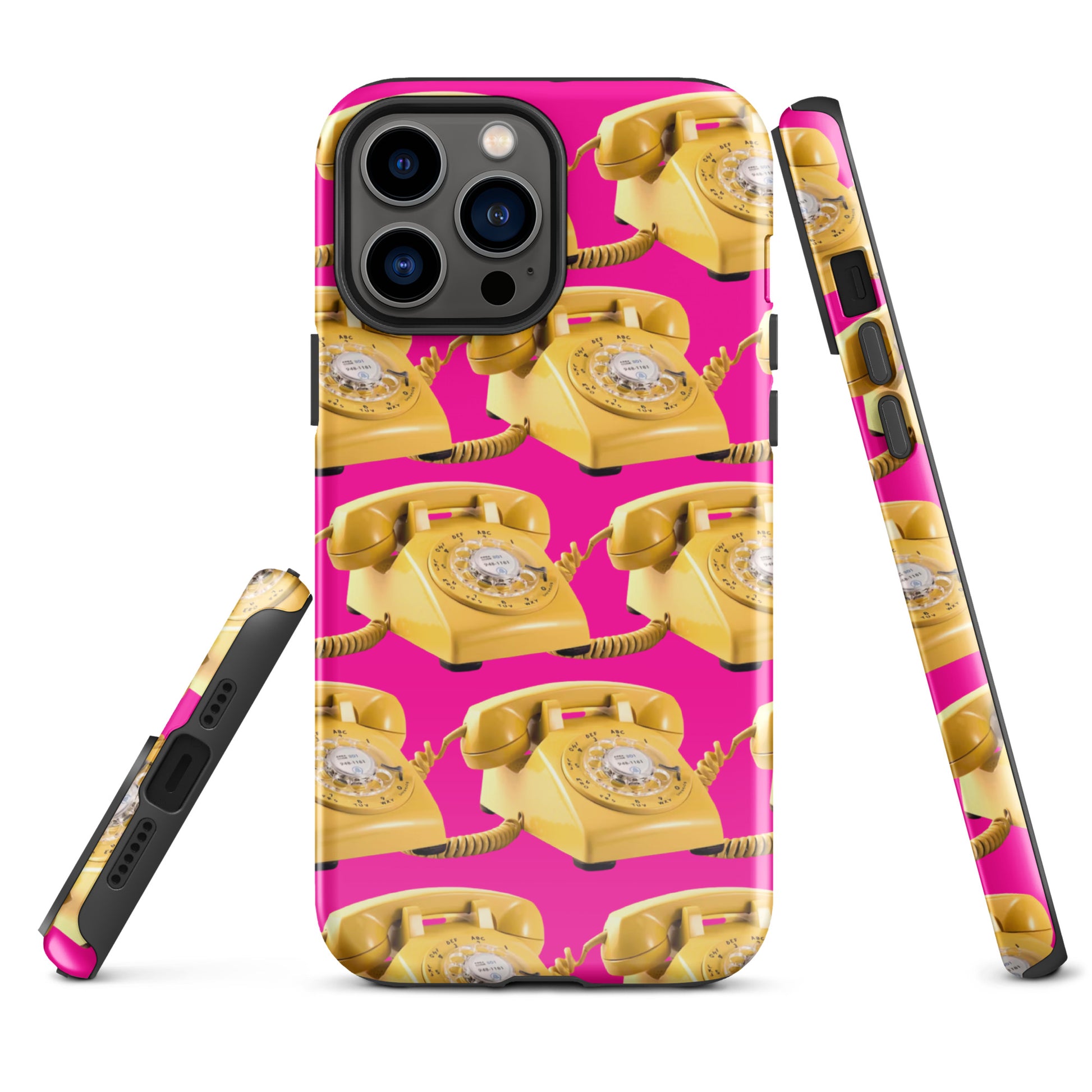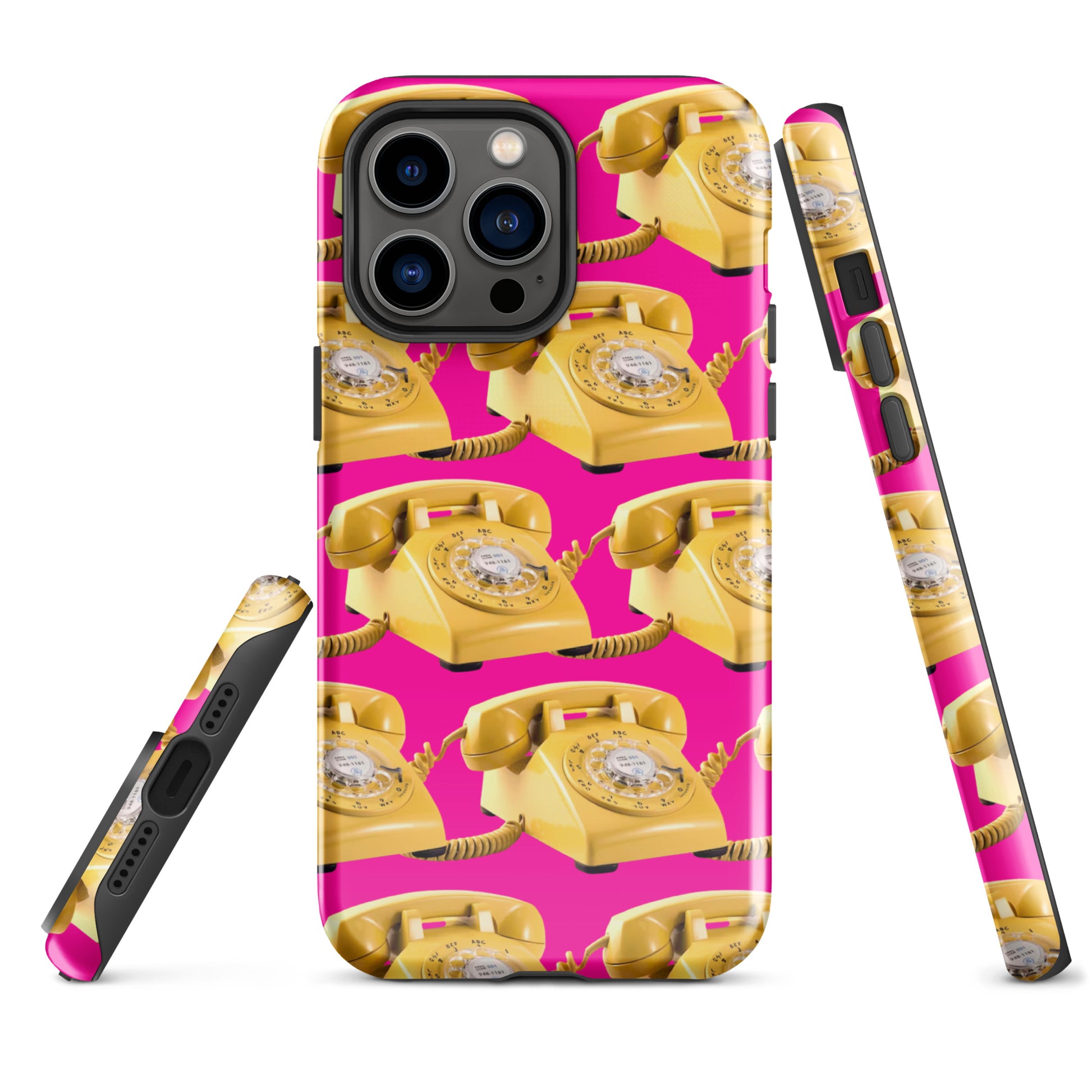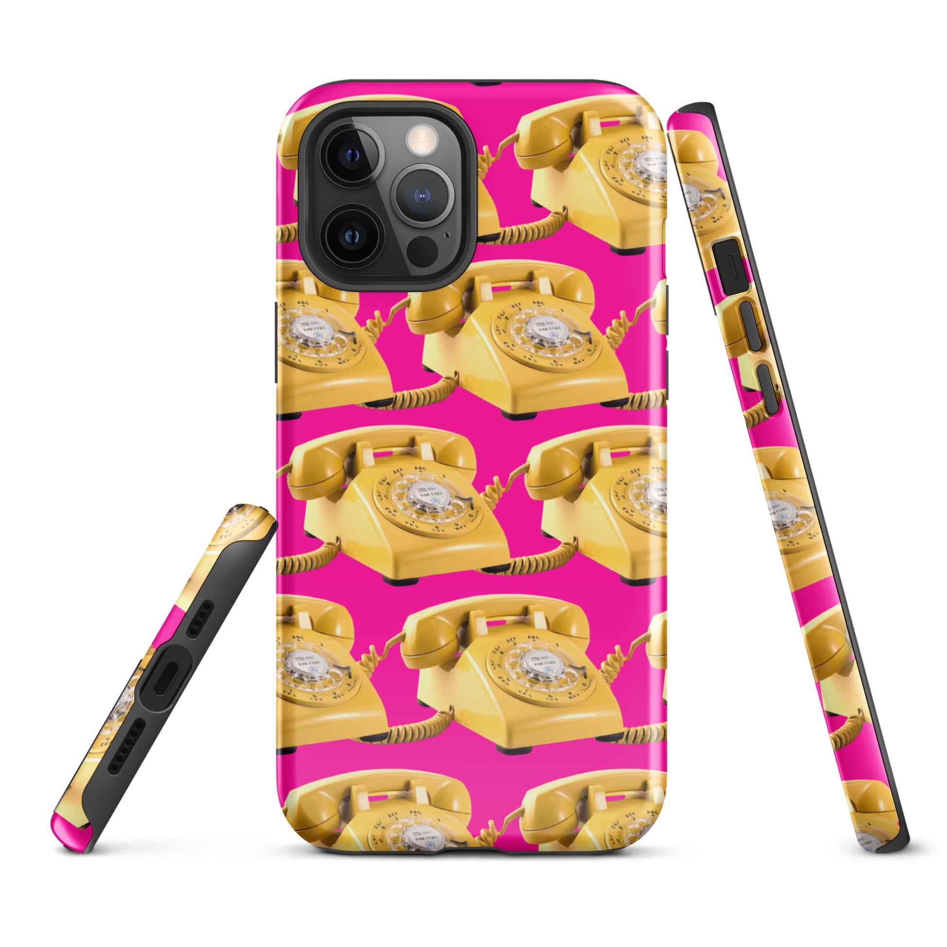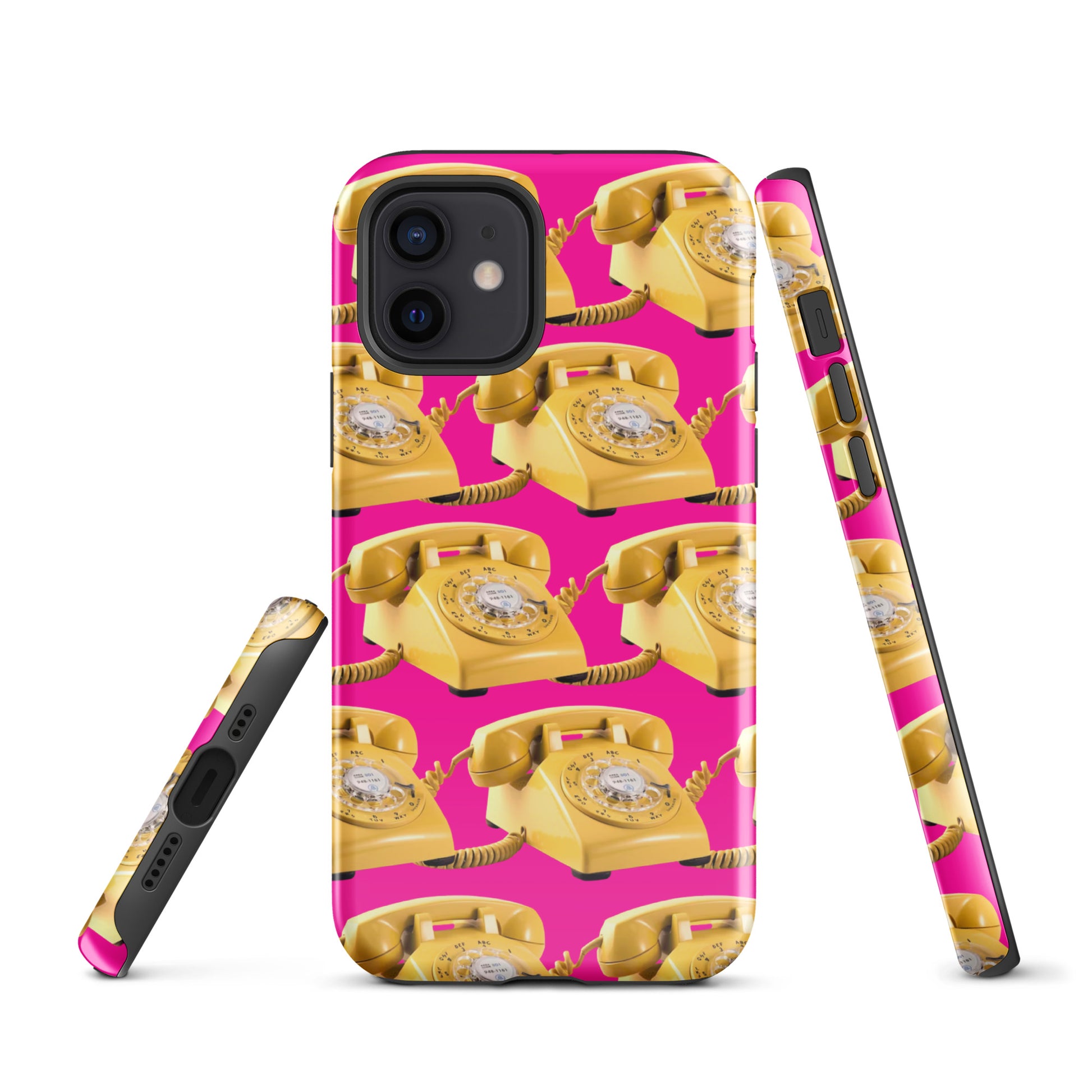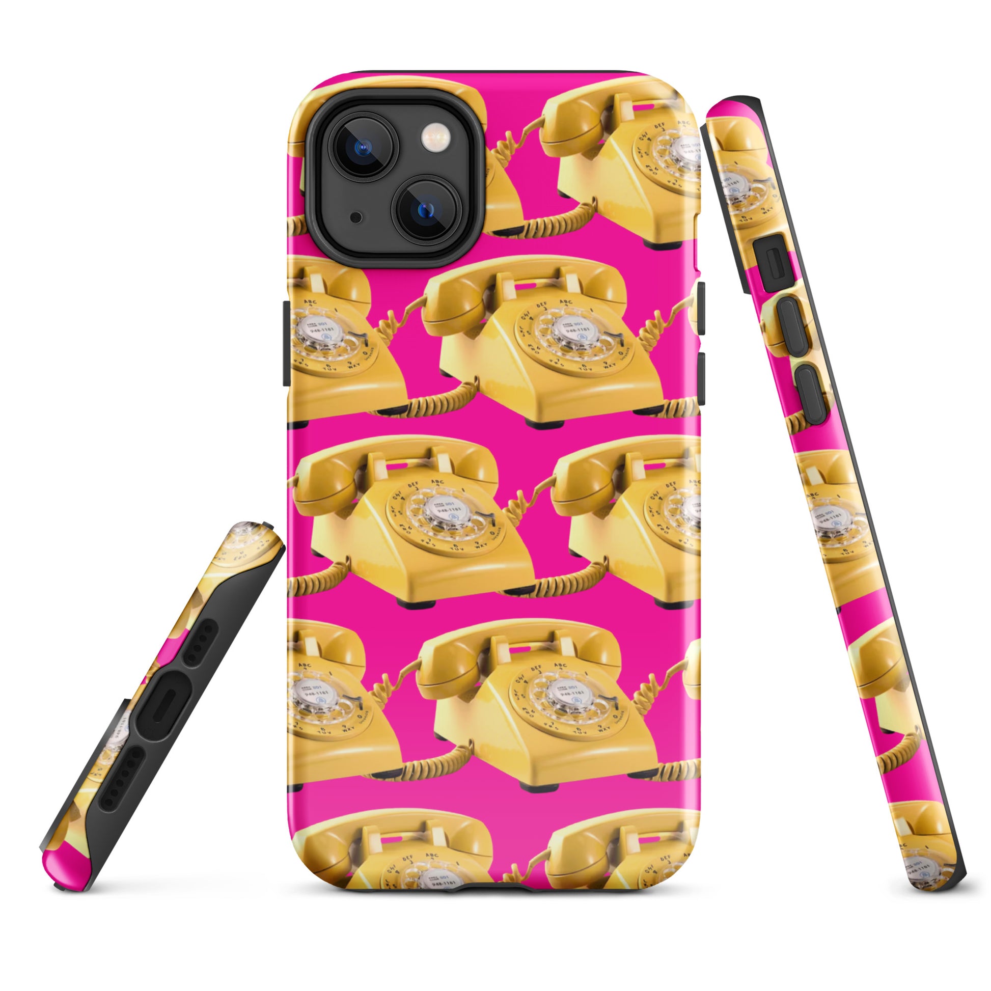 Design features vintage yellow rotary phone over pink or blue background - so retro! What a throwback!