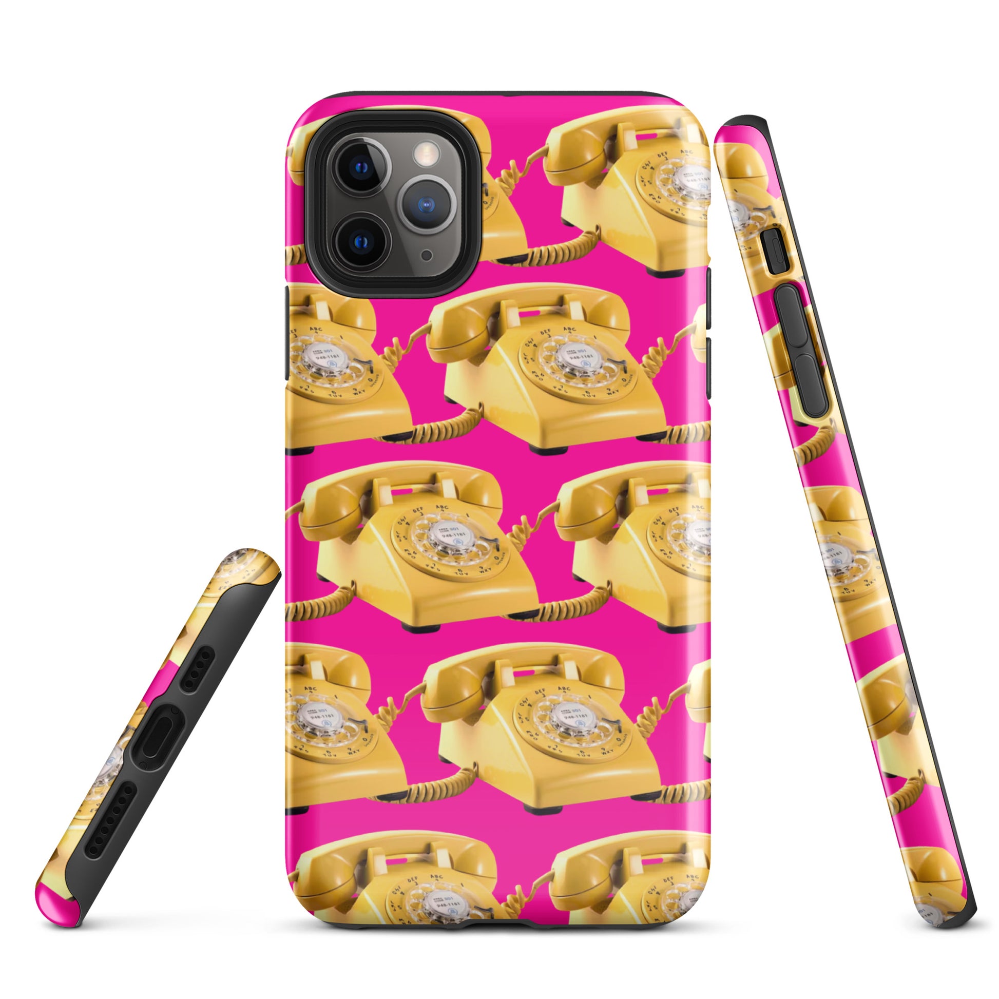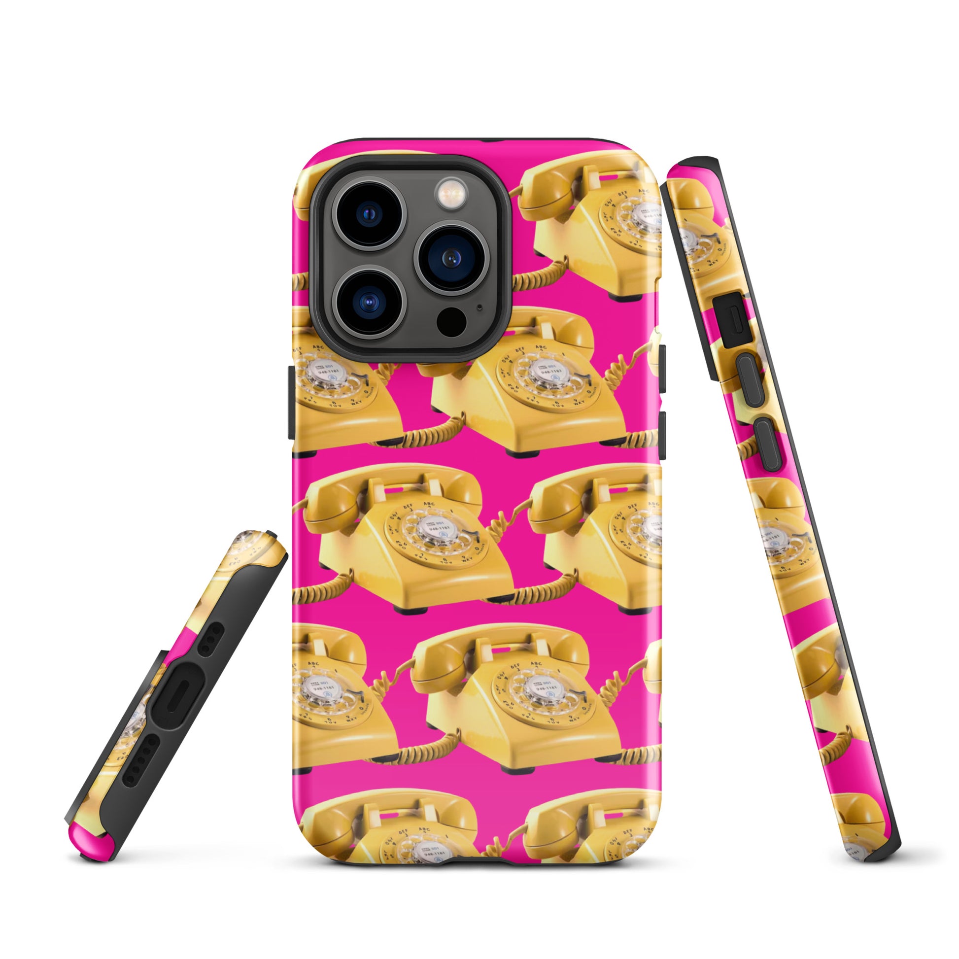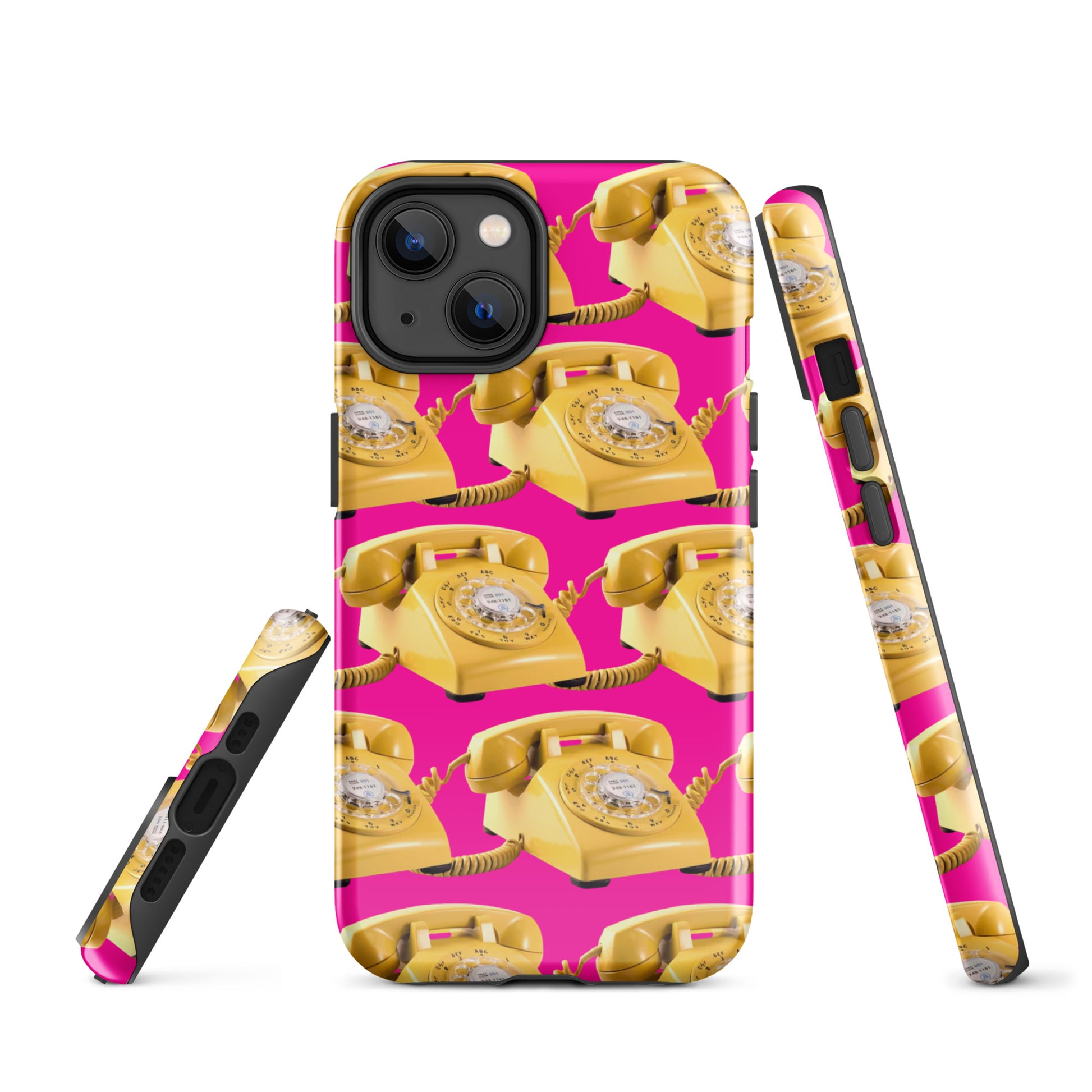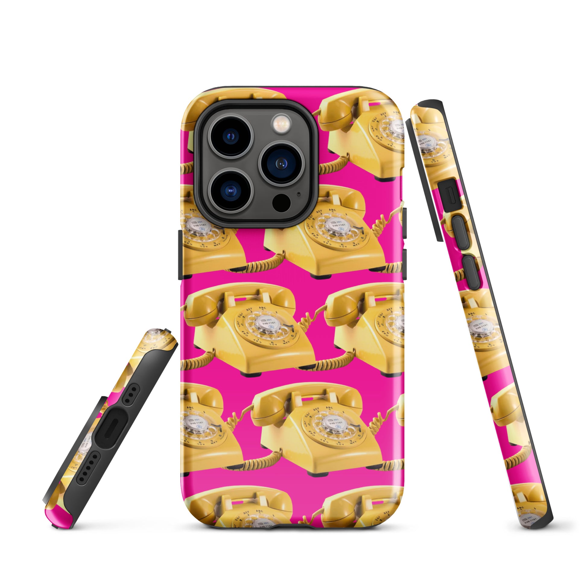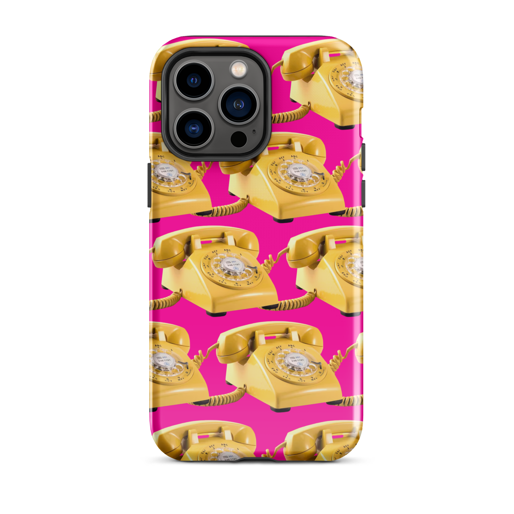 Design features vintage yellow rotary phone over pink or blue background - so retro! What a throwback!