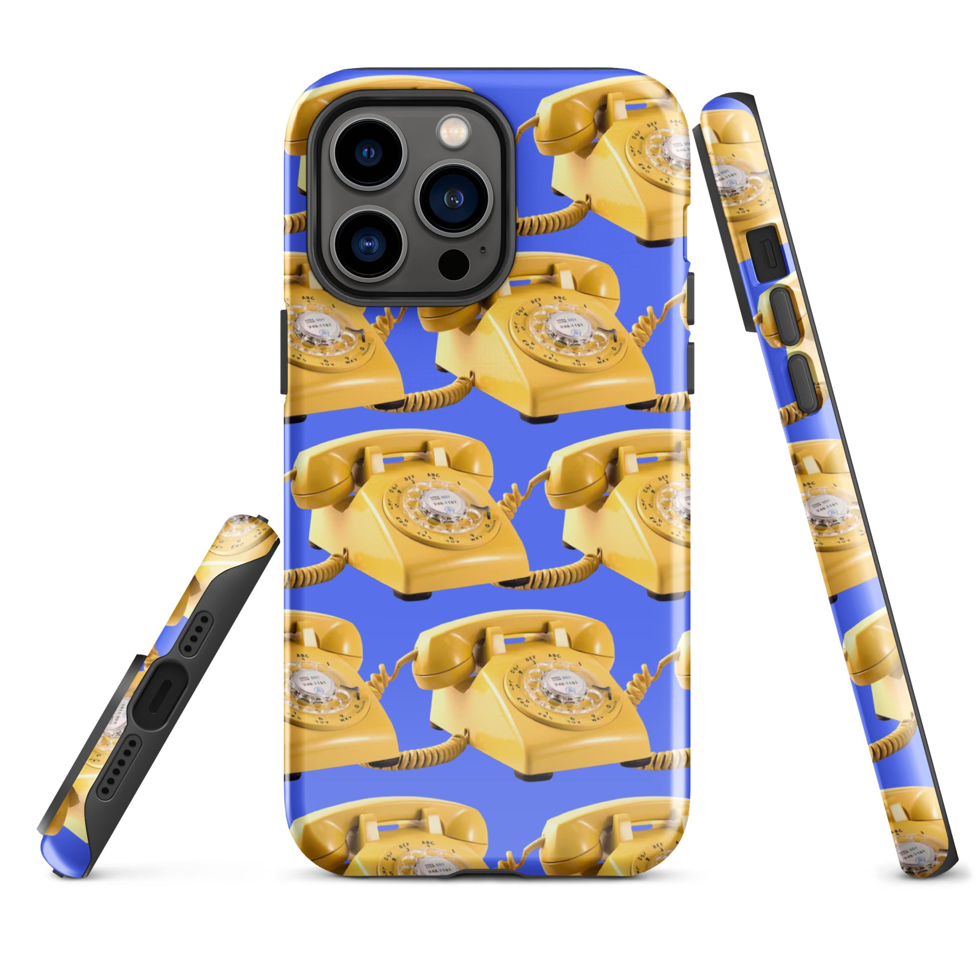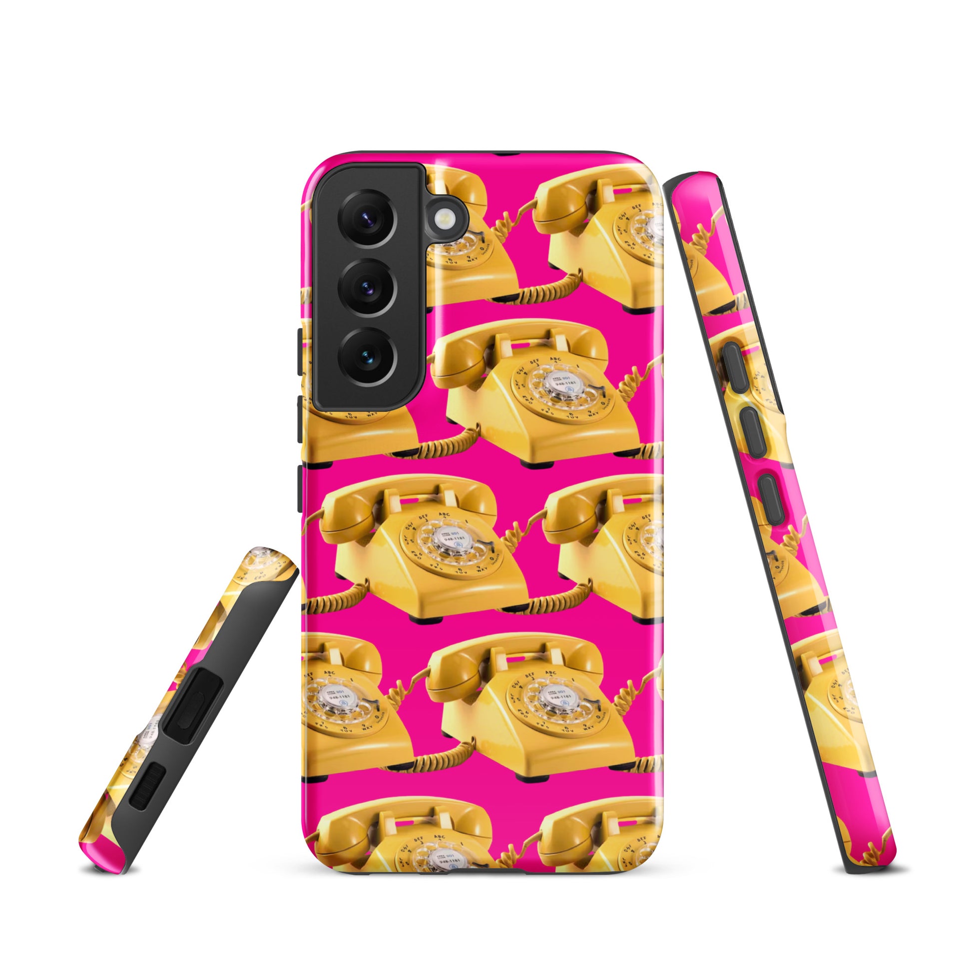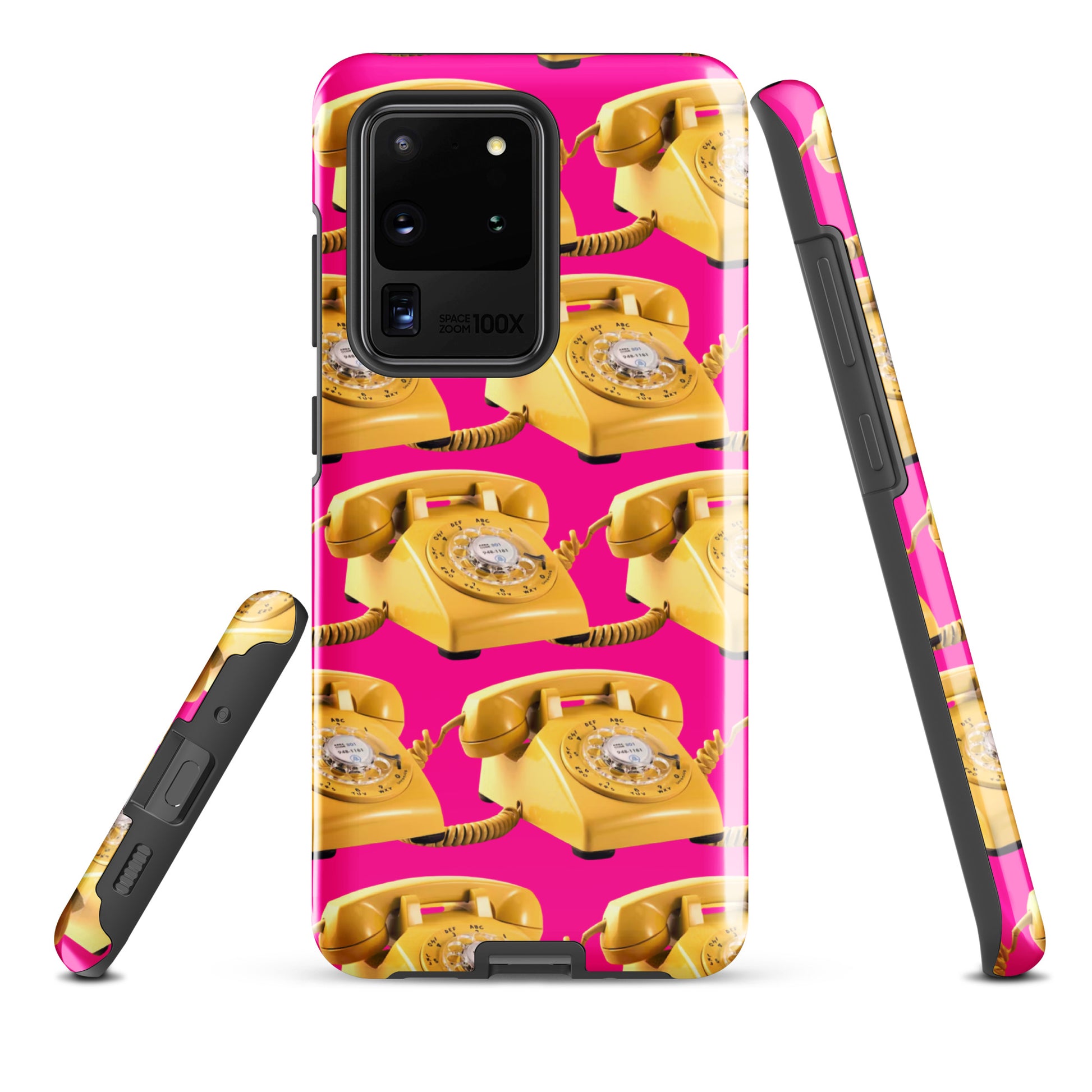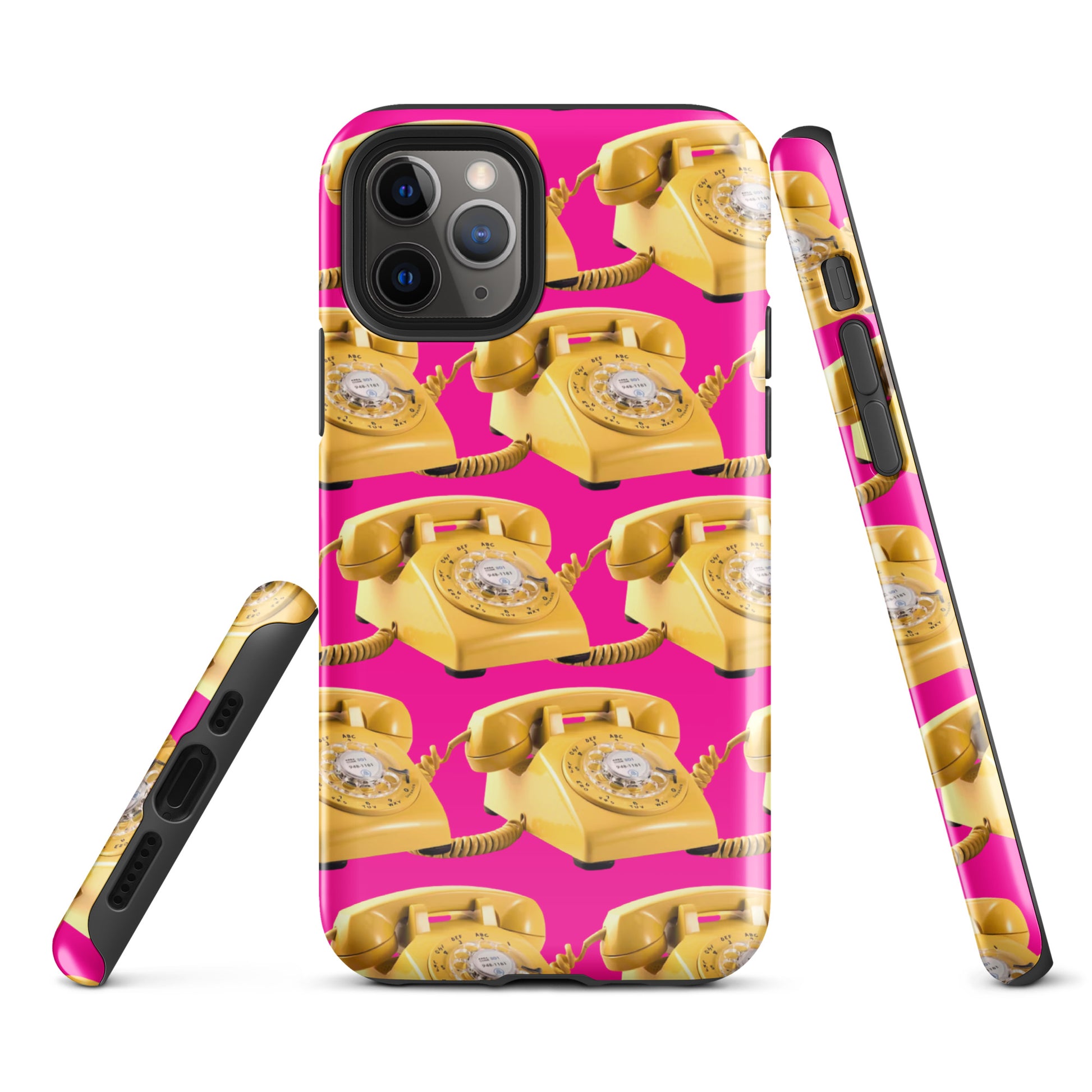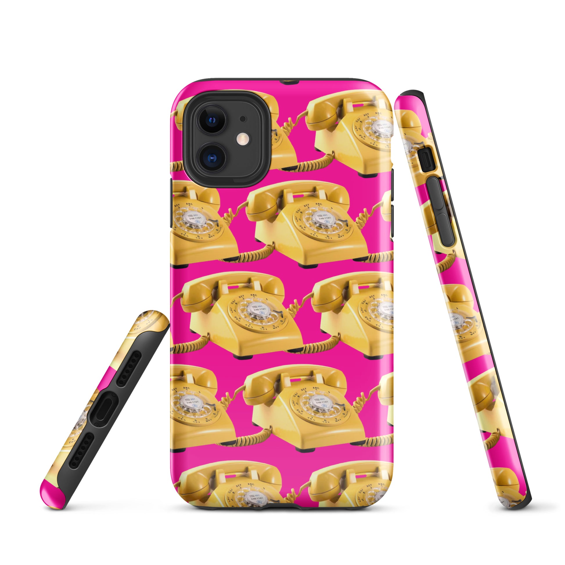 Design features vintage yellow rotary phone over pink or blue background - so retro! What a throwback!