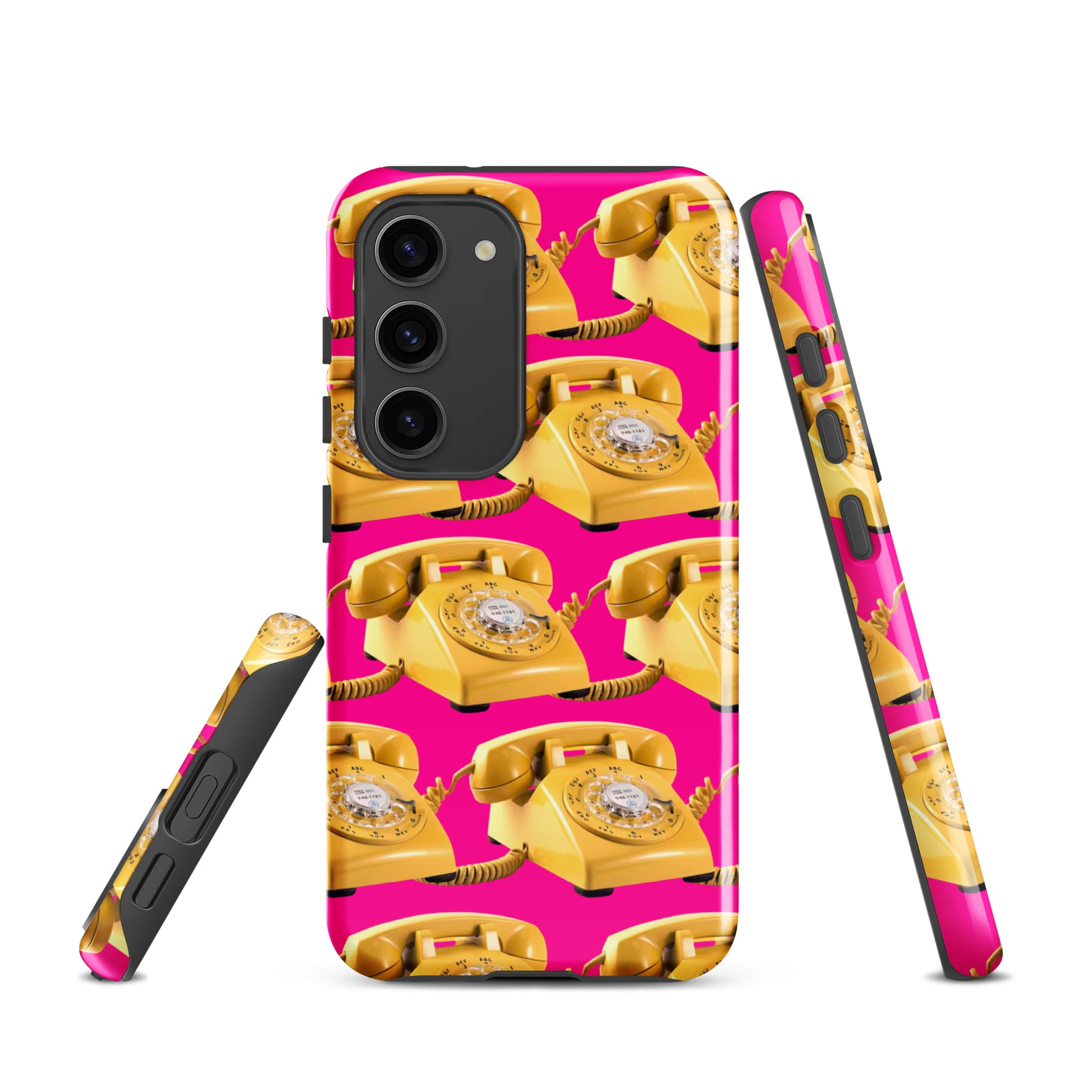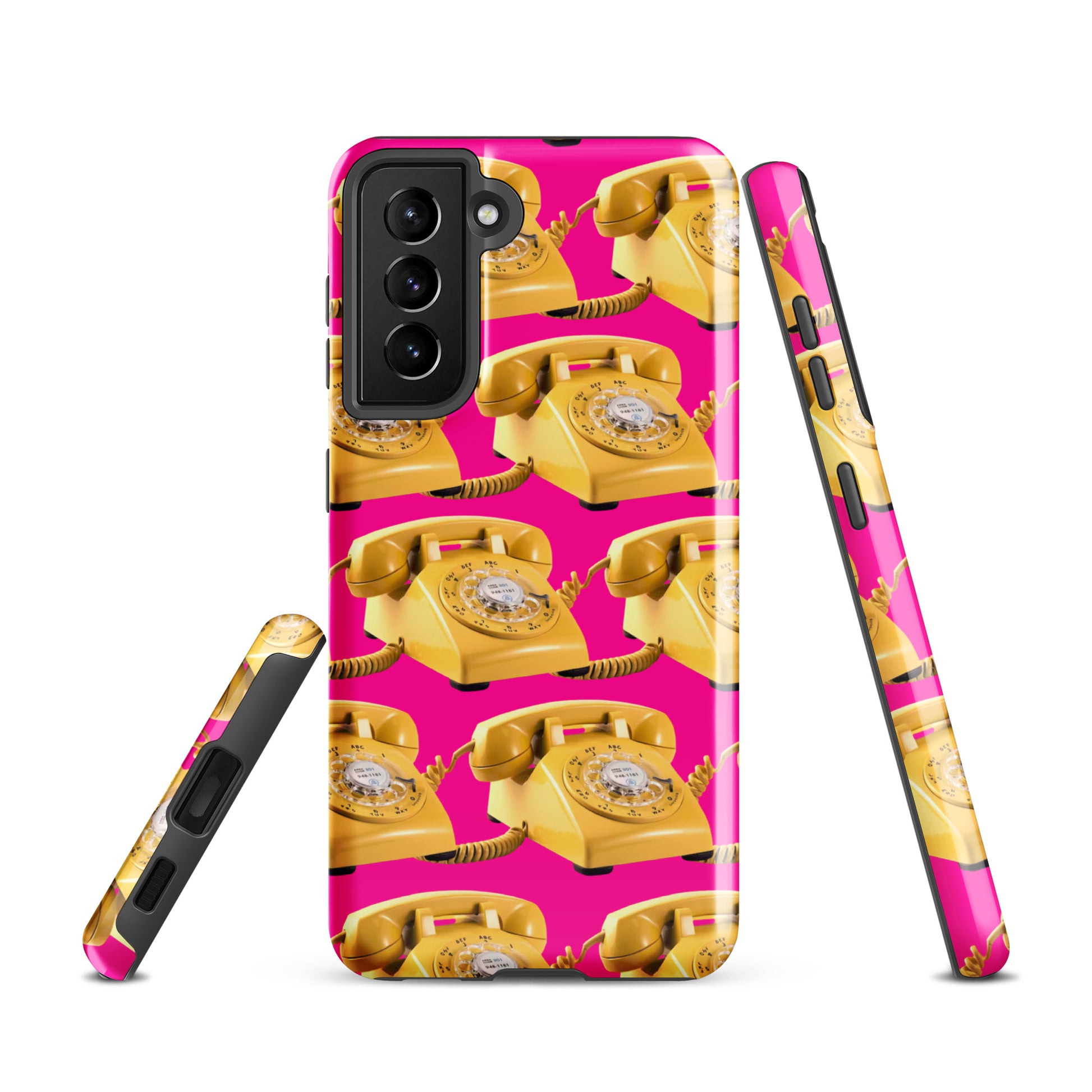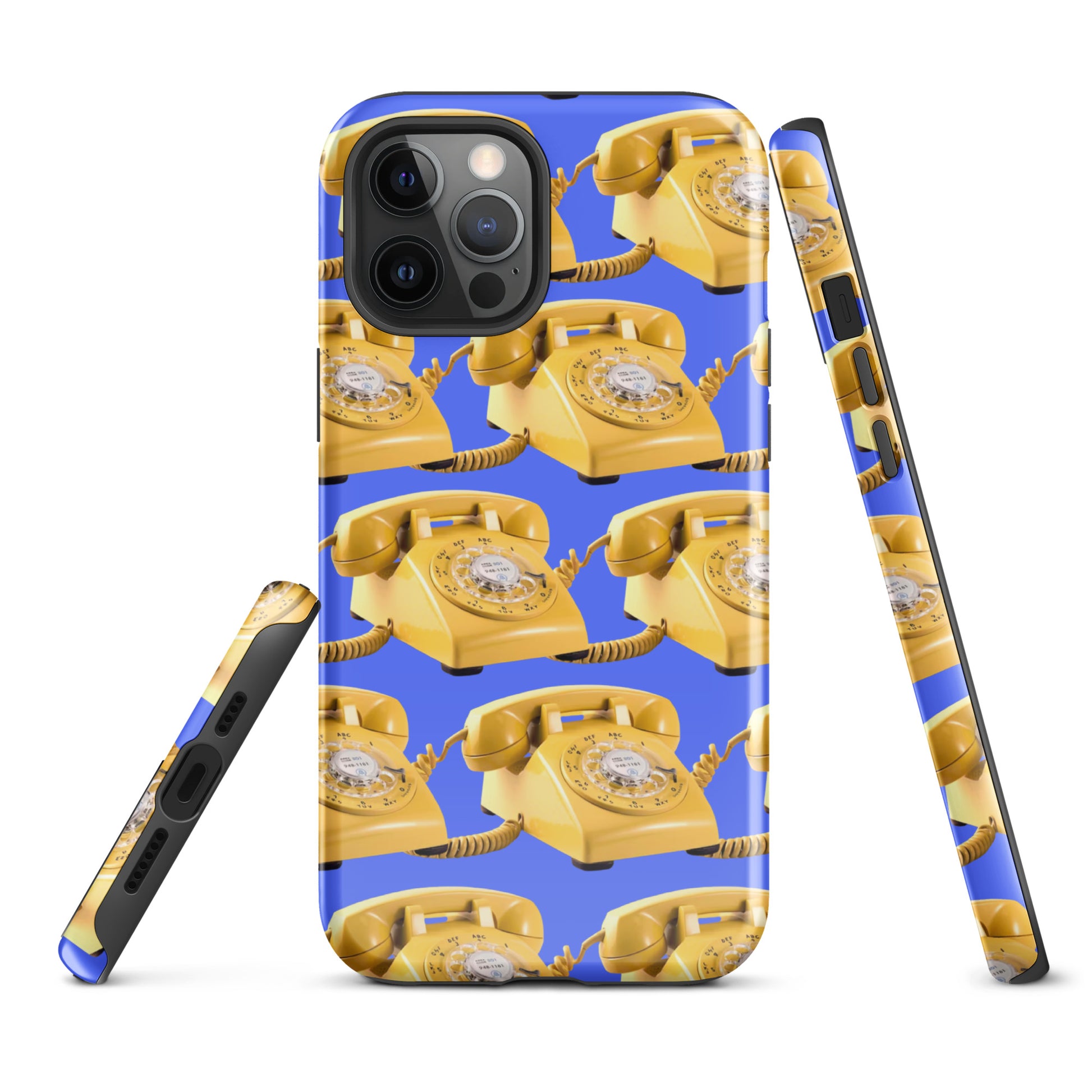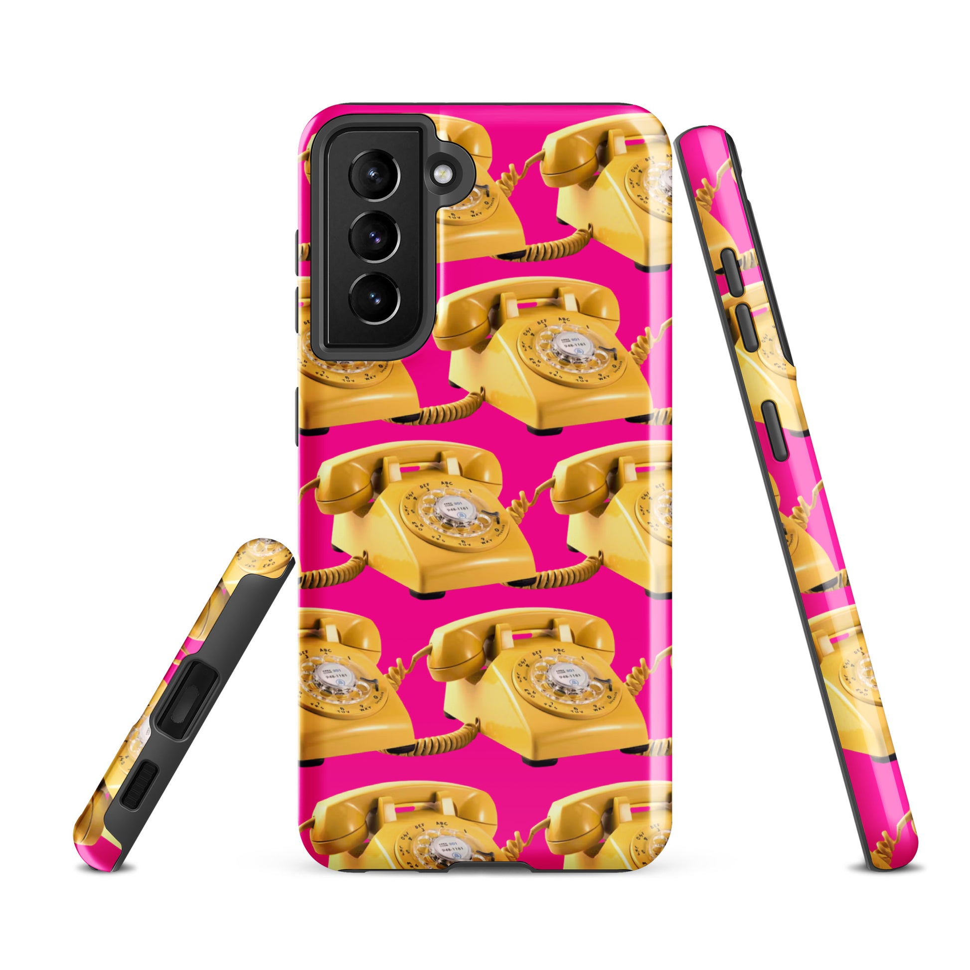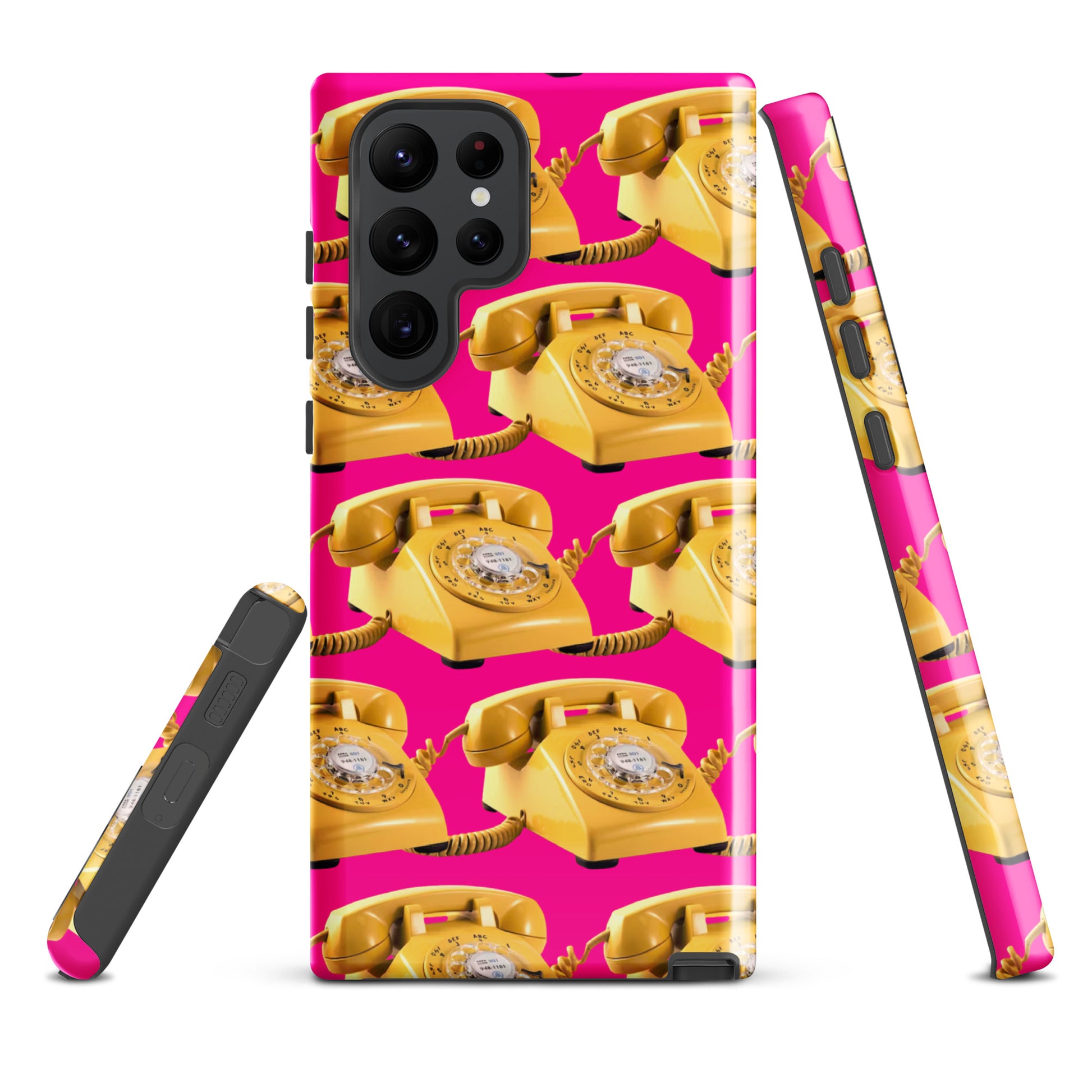 Design features vintage yellow rotary phone over pink or blue background - so retro! What a throwback!