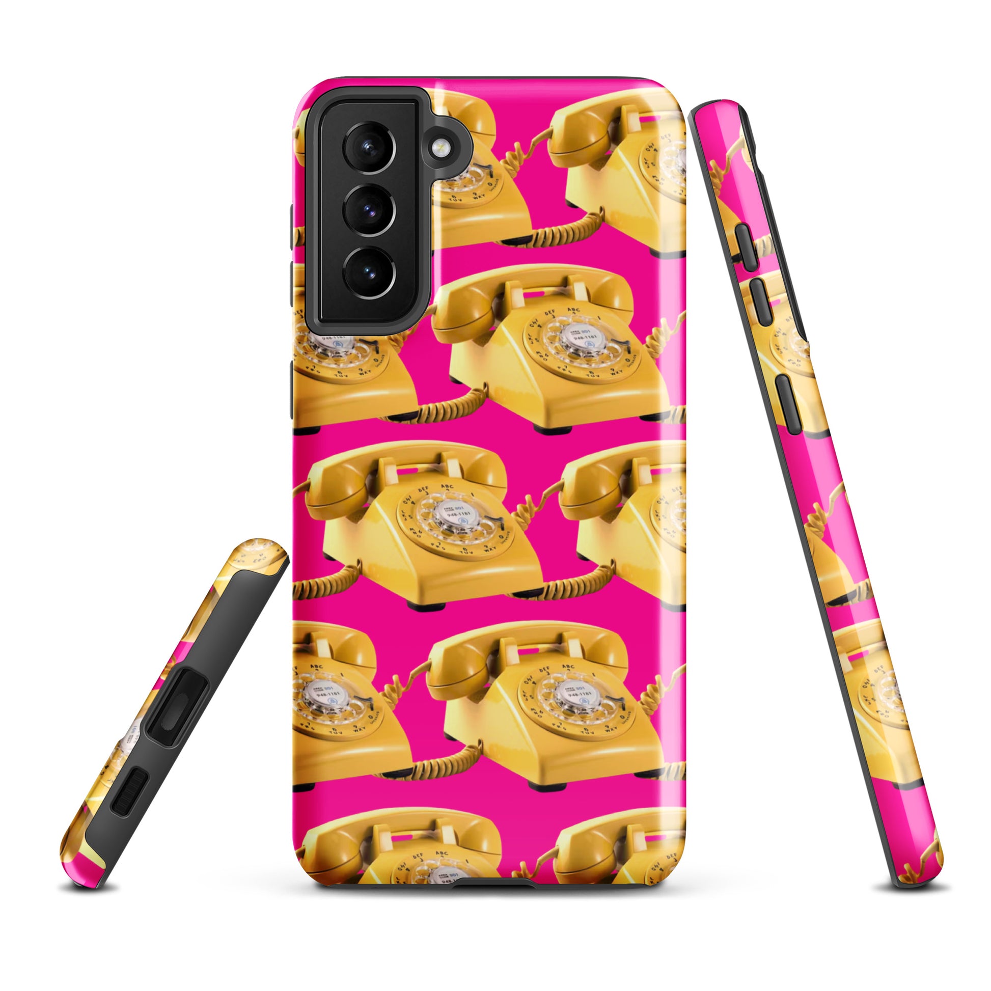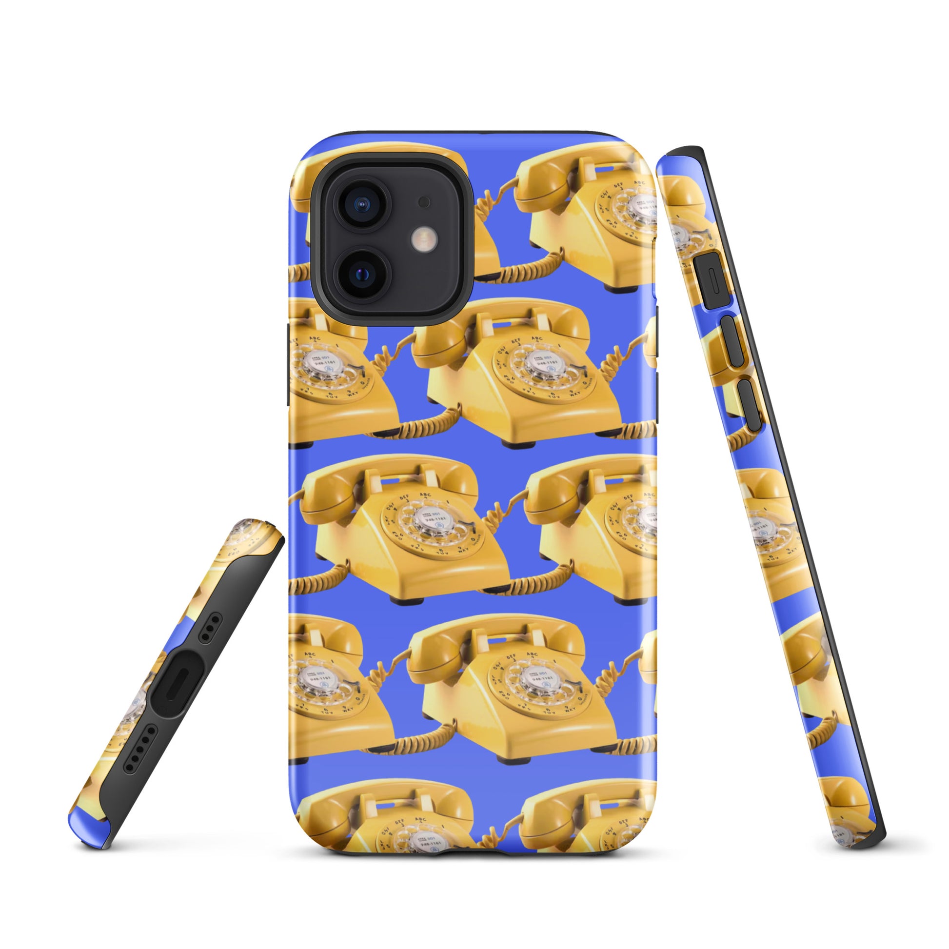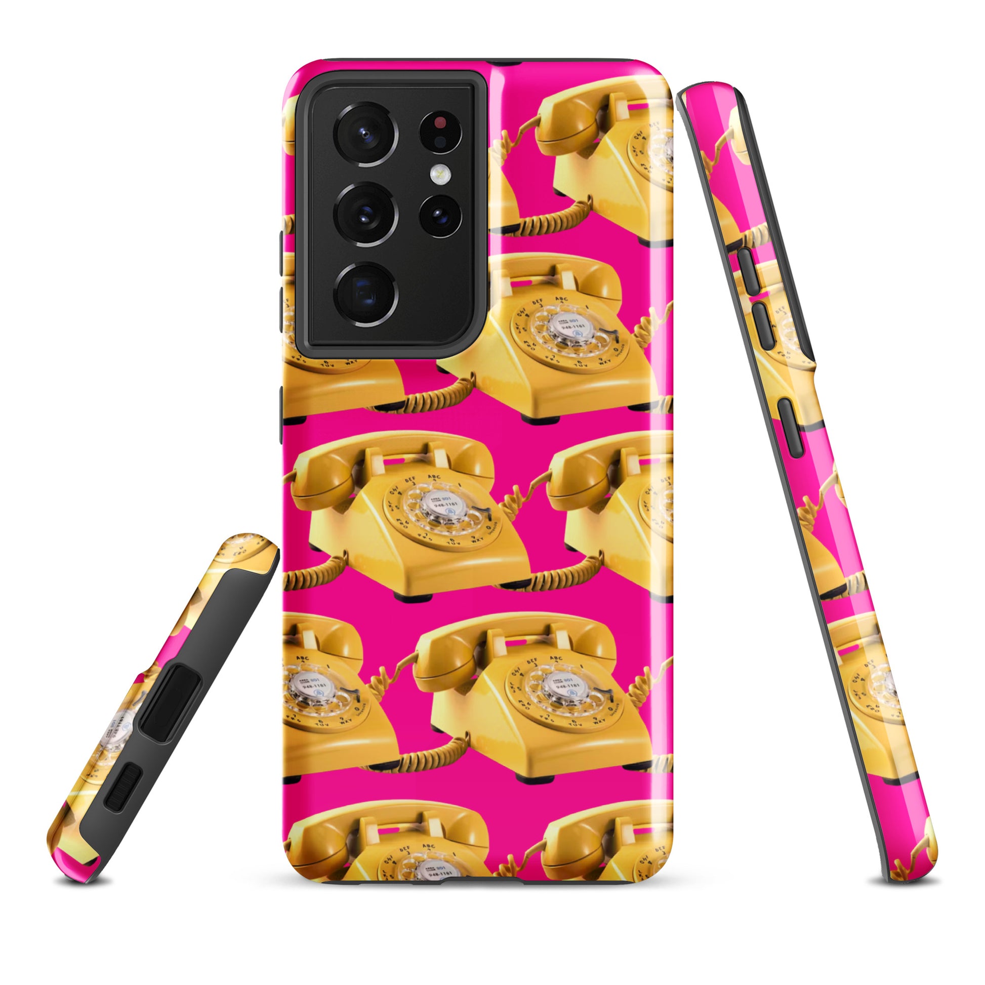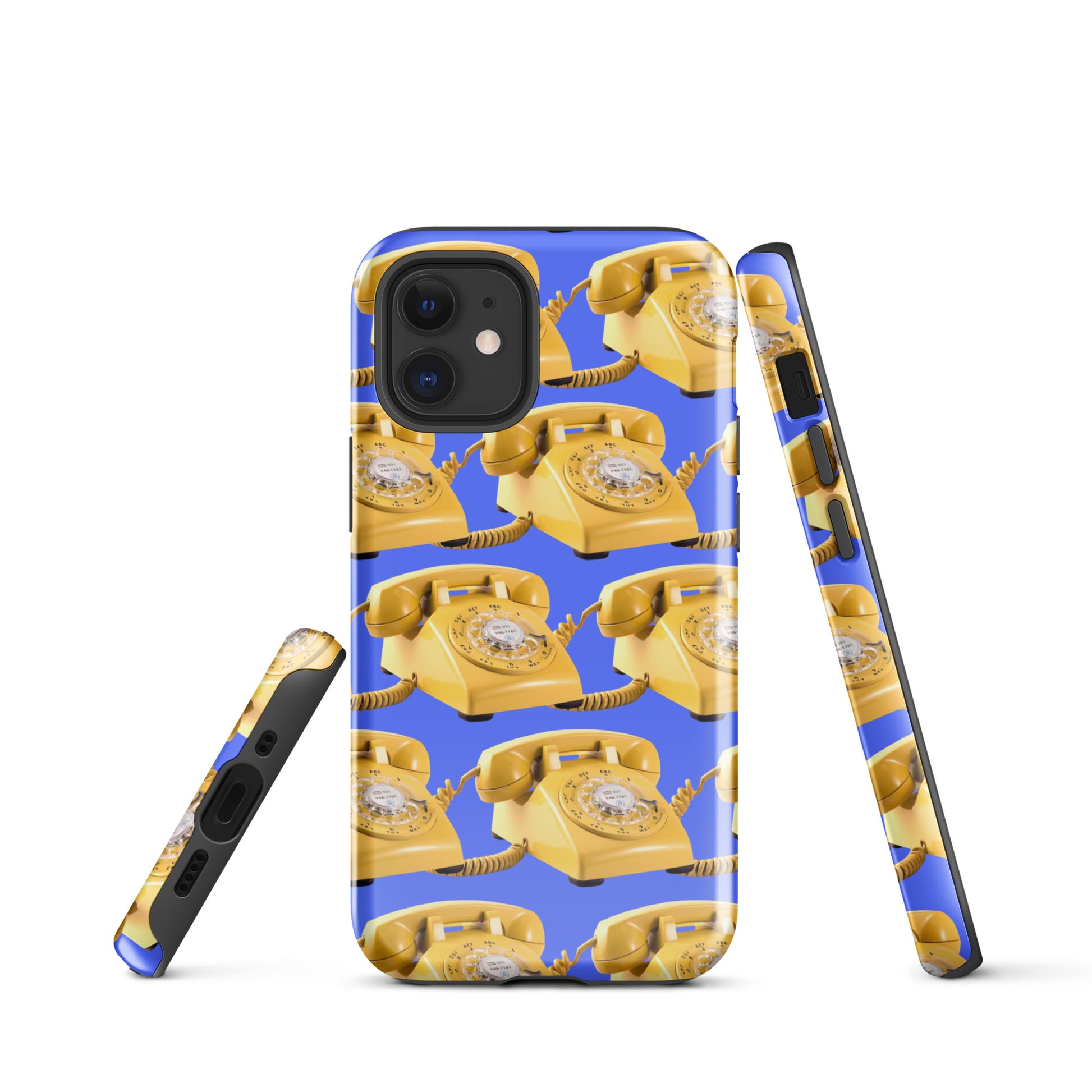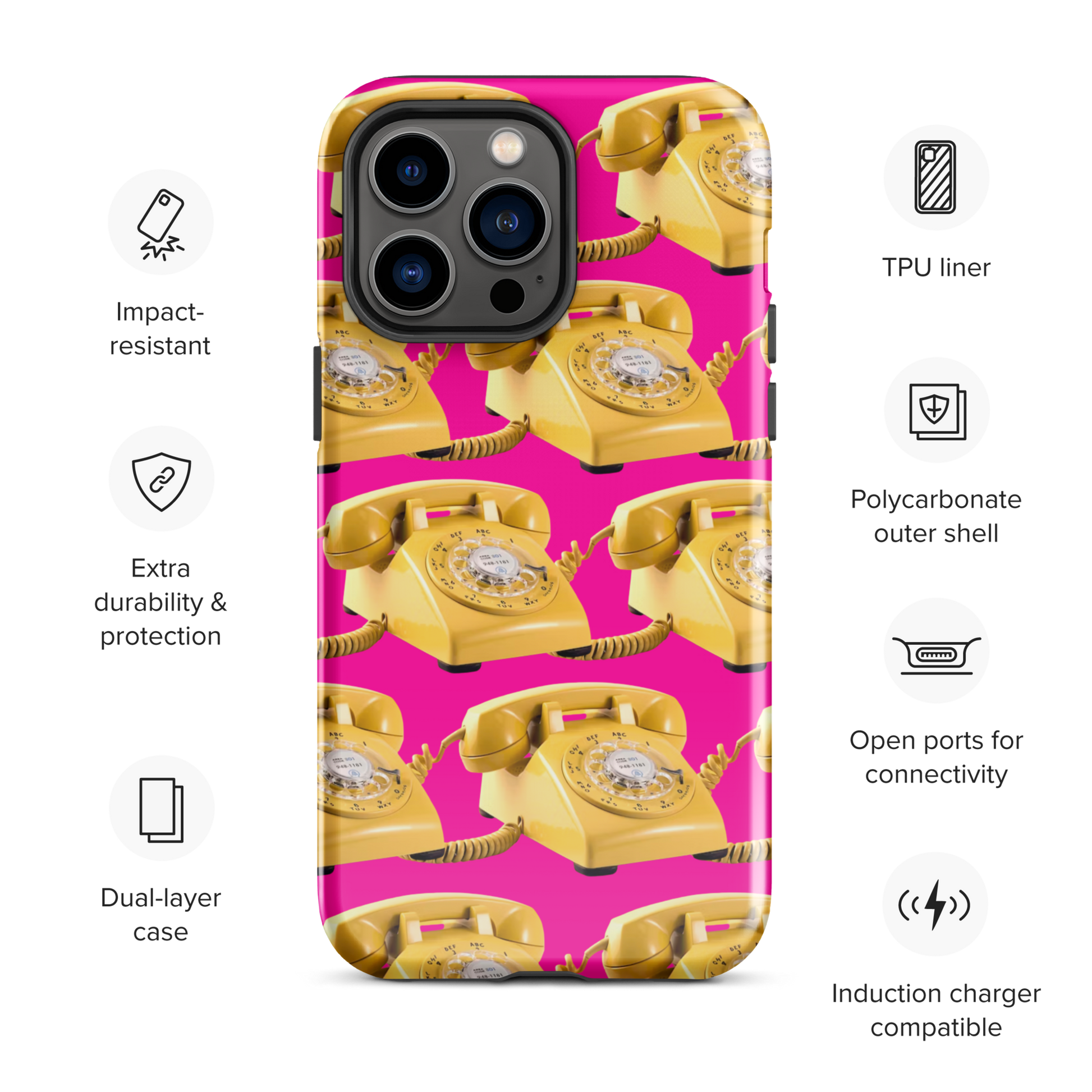 Design features vintage yellow rotary phone over pink or blue background - so retro! What a throwback!