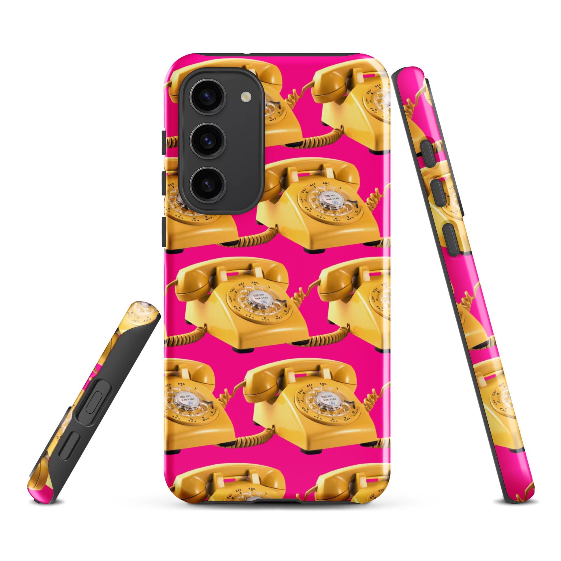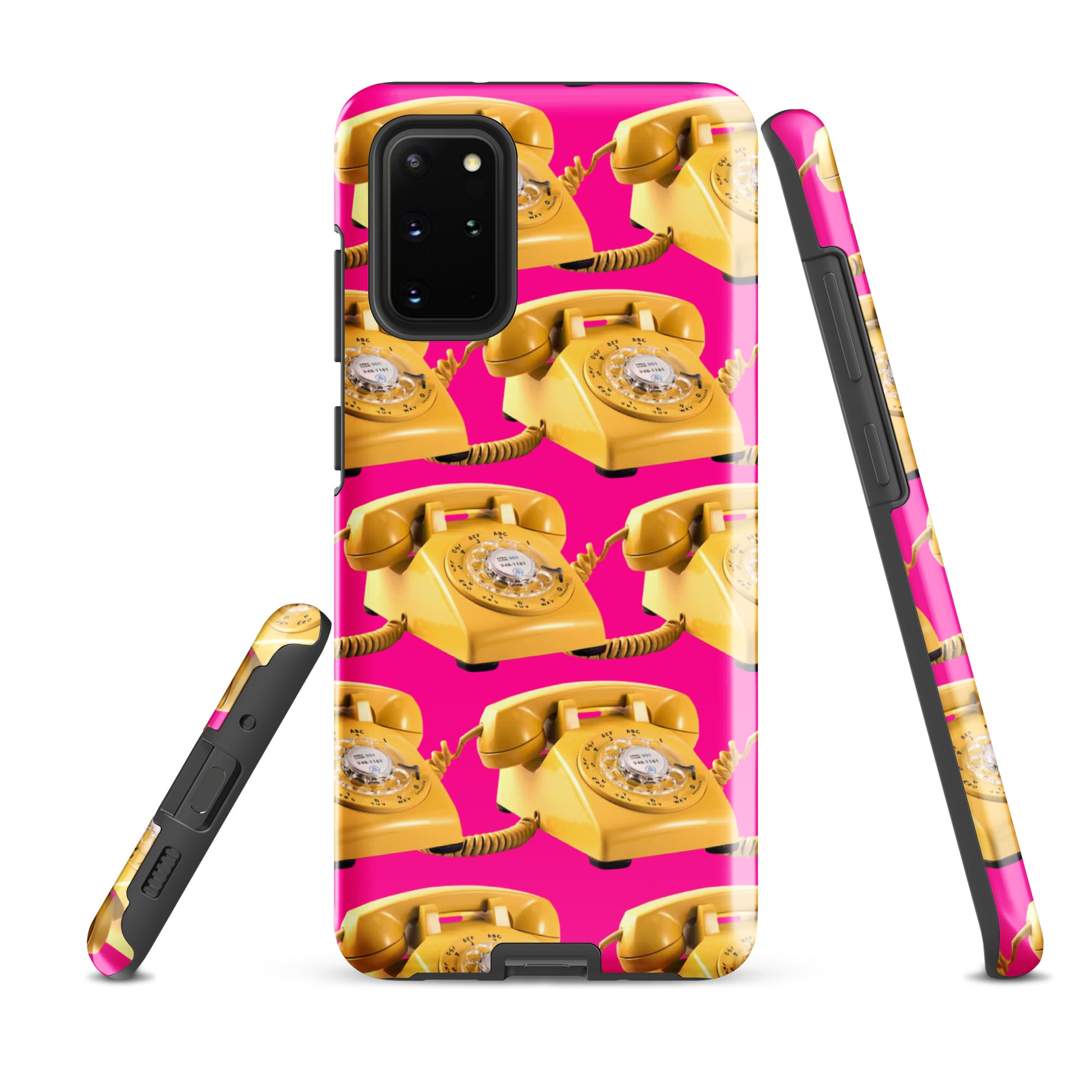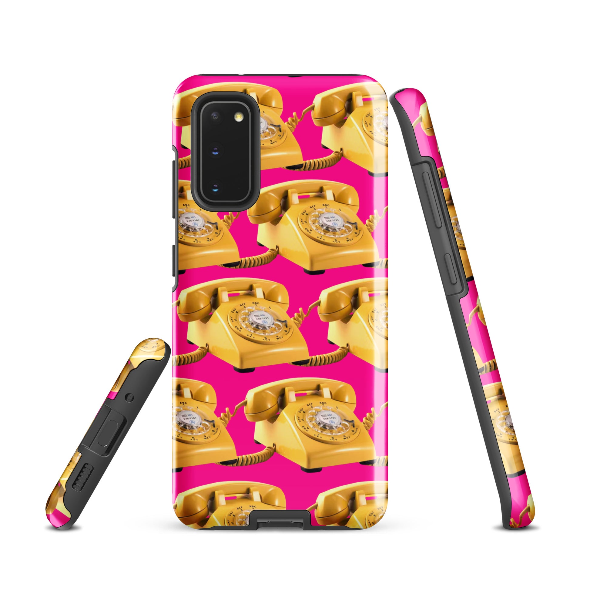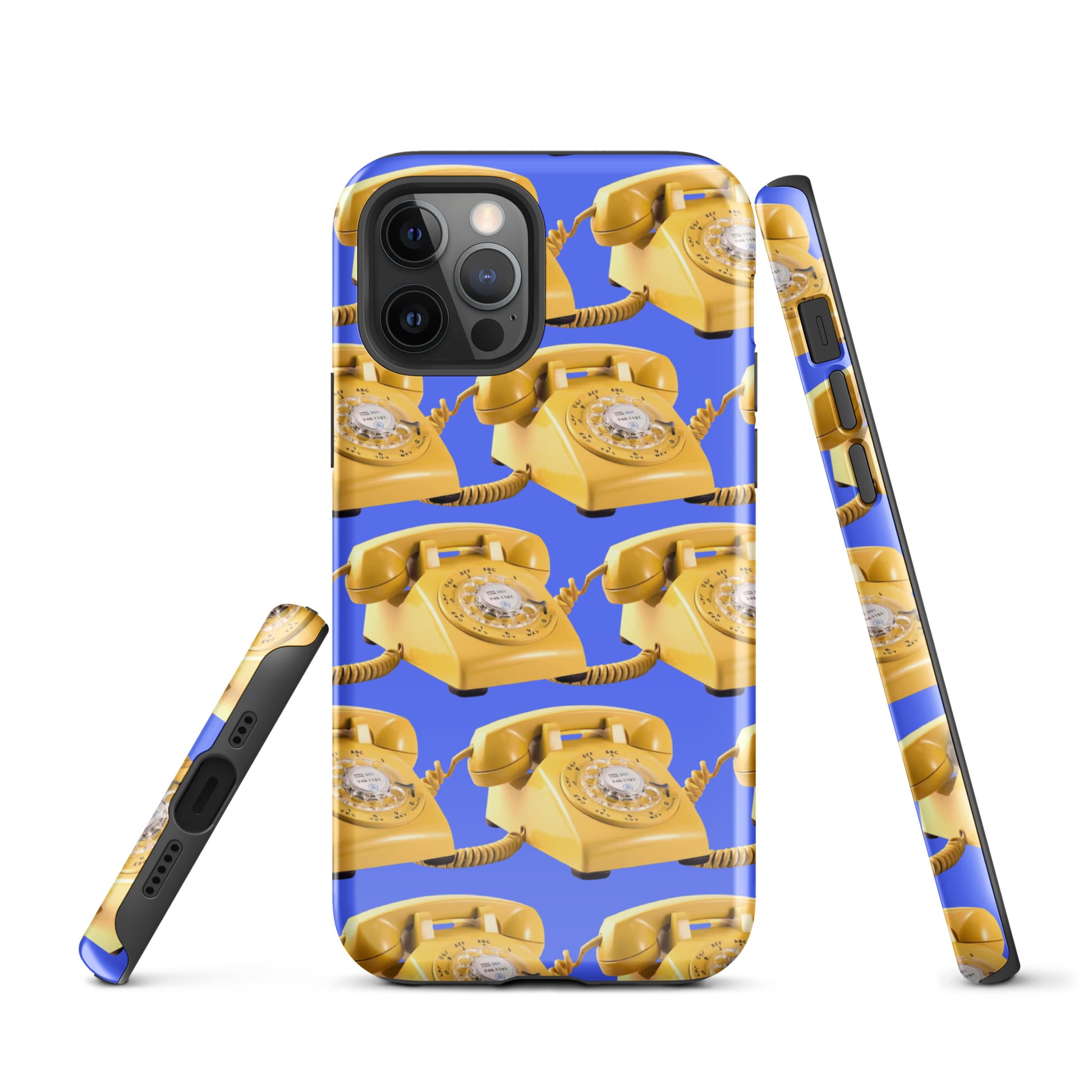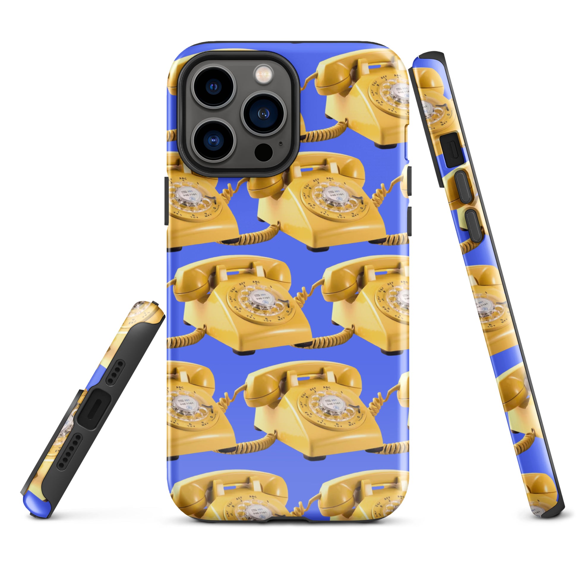 Design features vintage yellow rotary phone over pink or blue background - so retro! What a throwback!