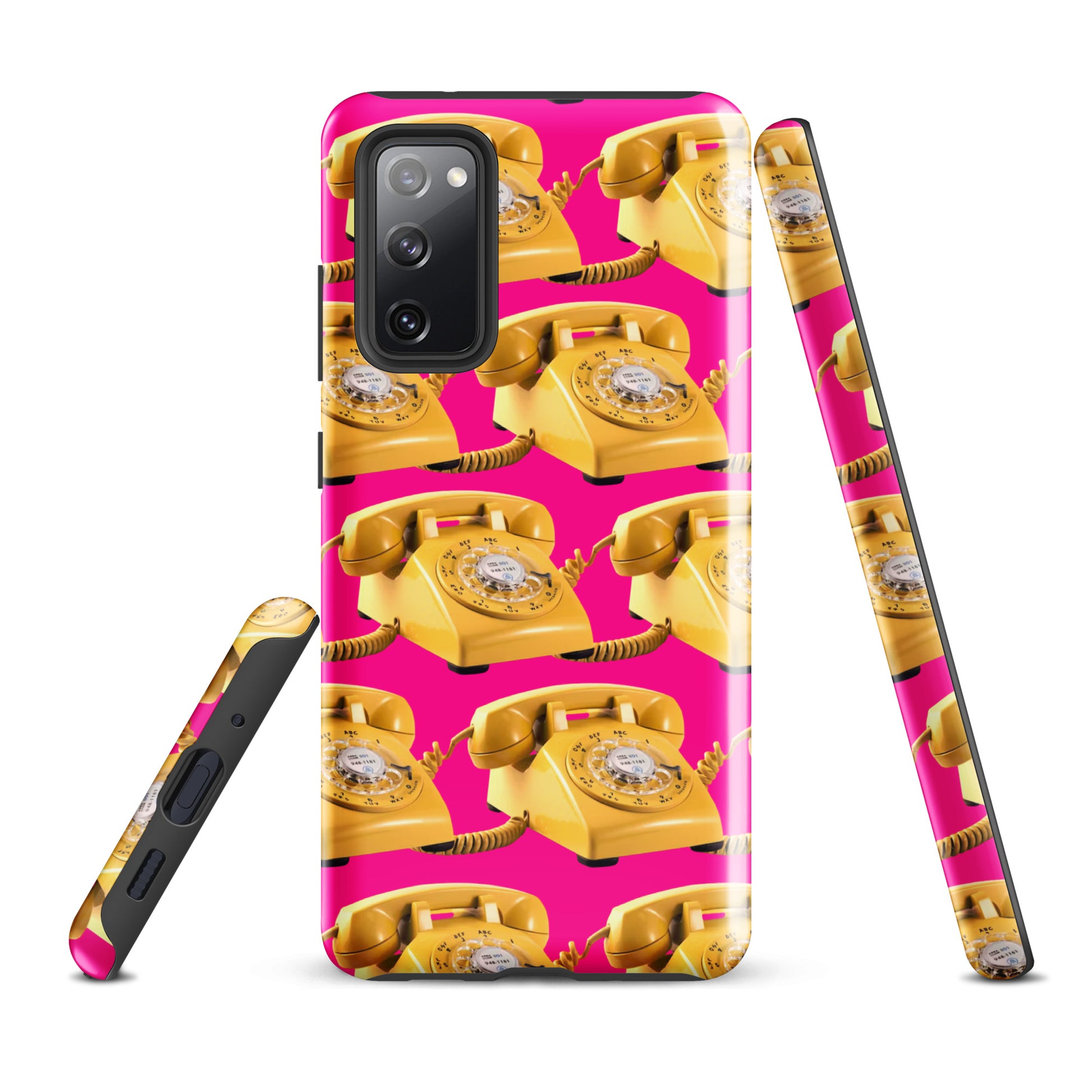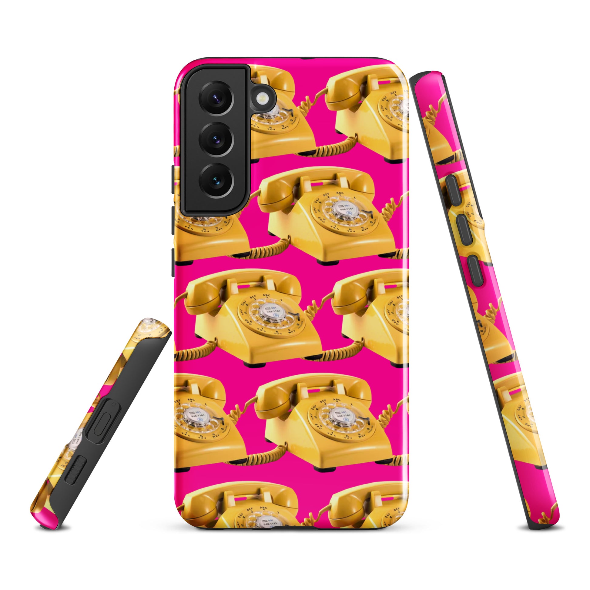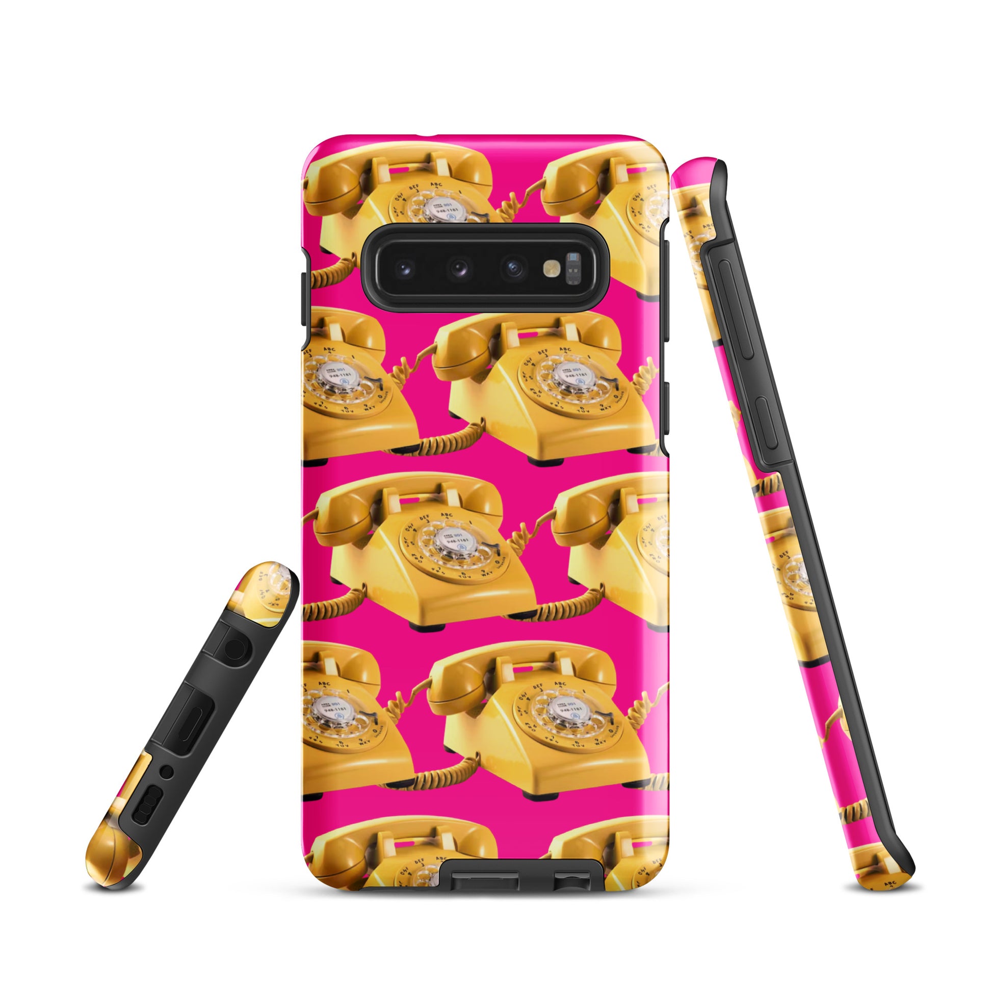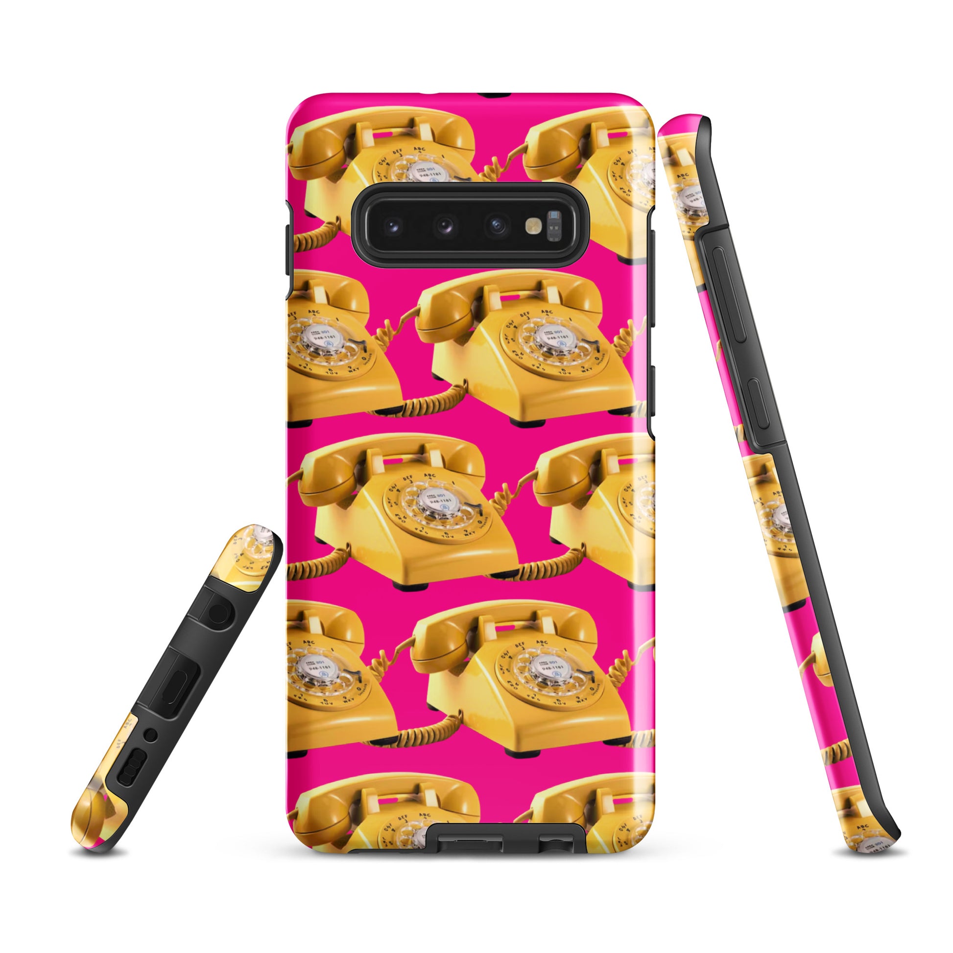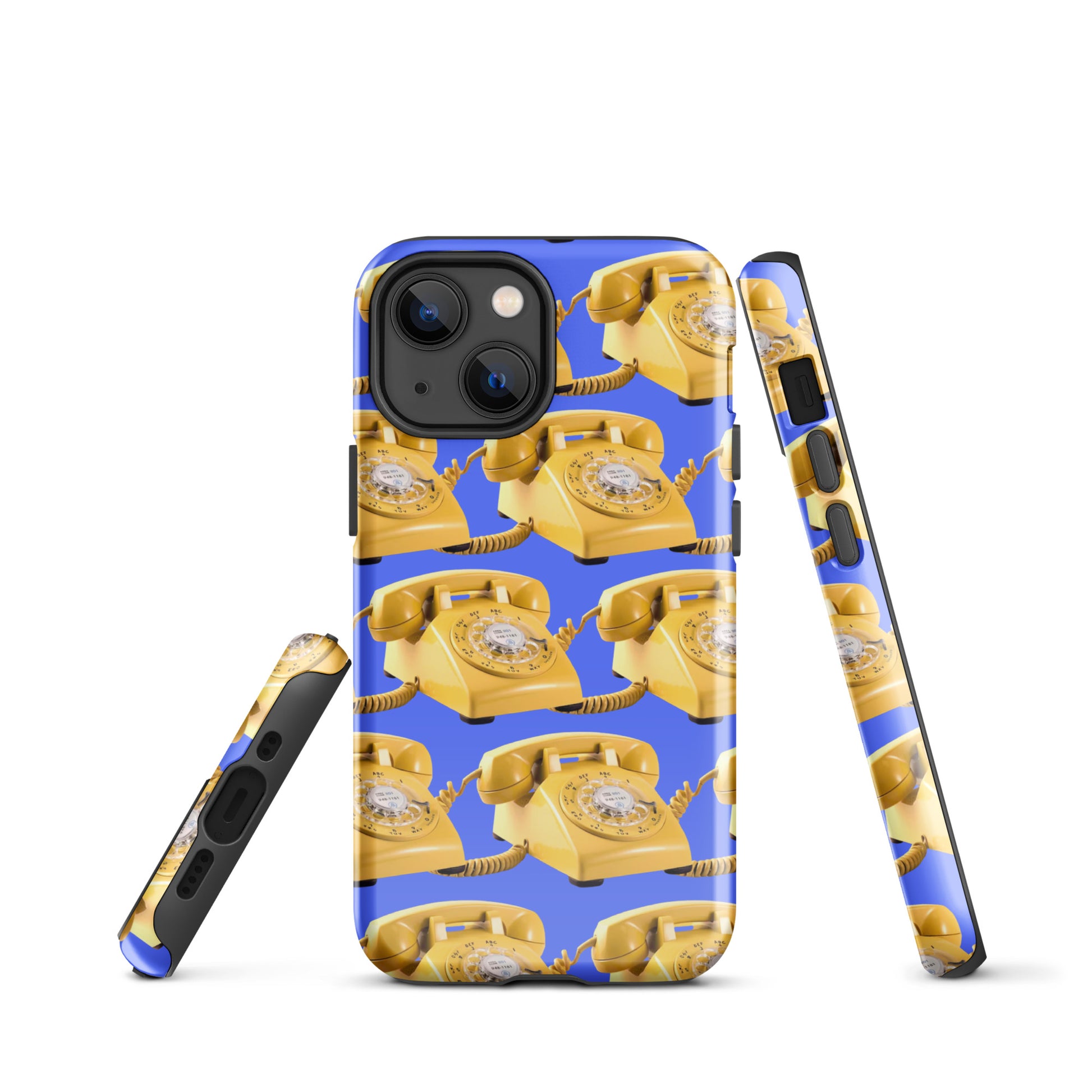 Design features vintage yellow rotary phone over pink or blue background - so retro! What a throwback!
