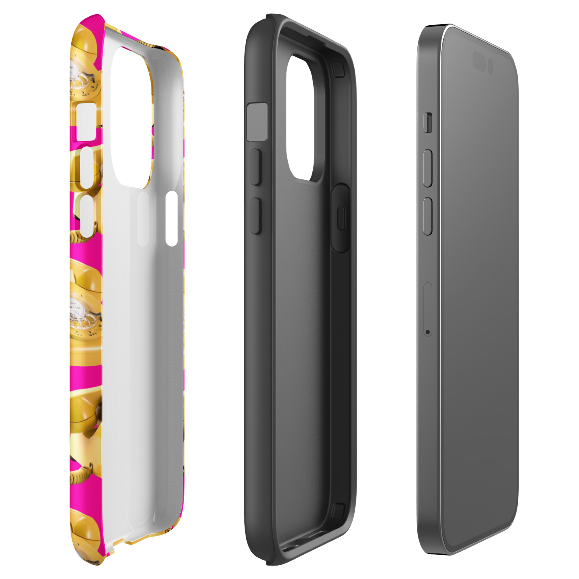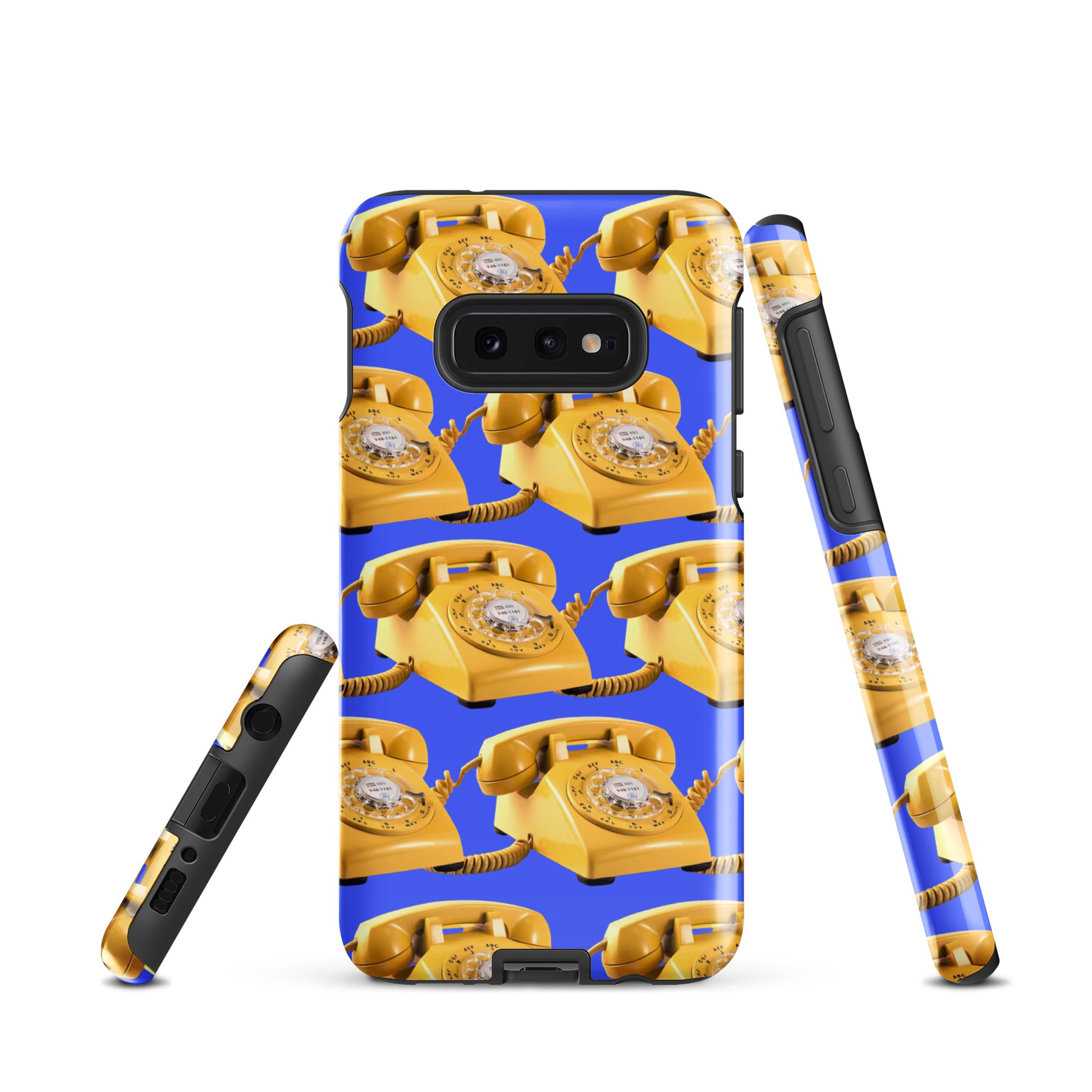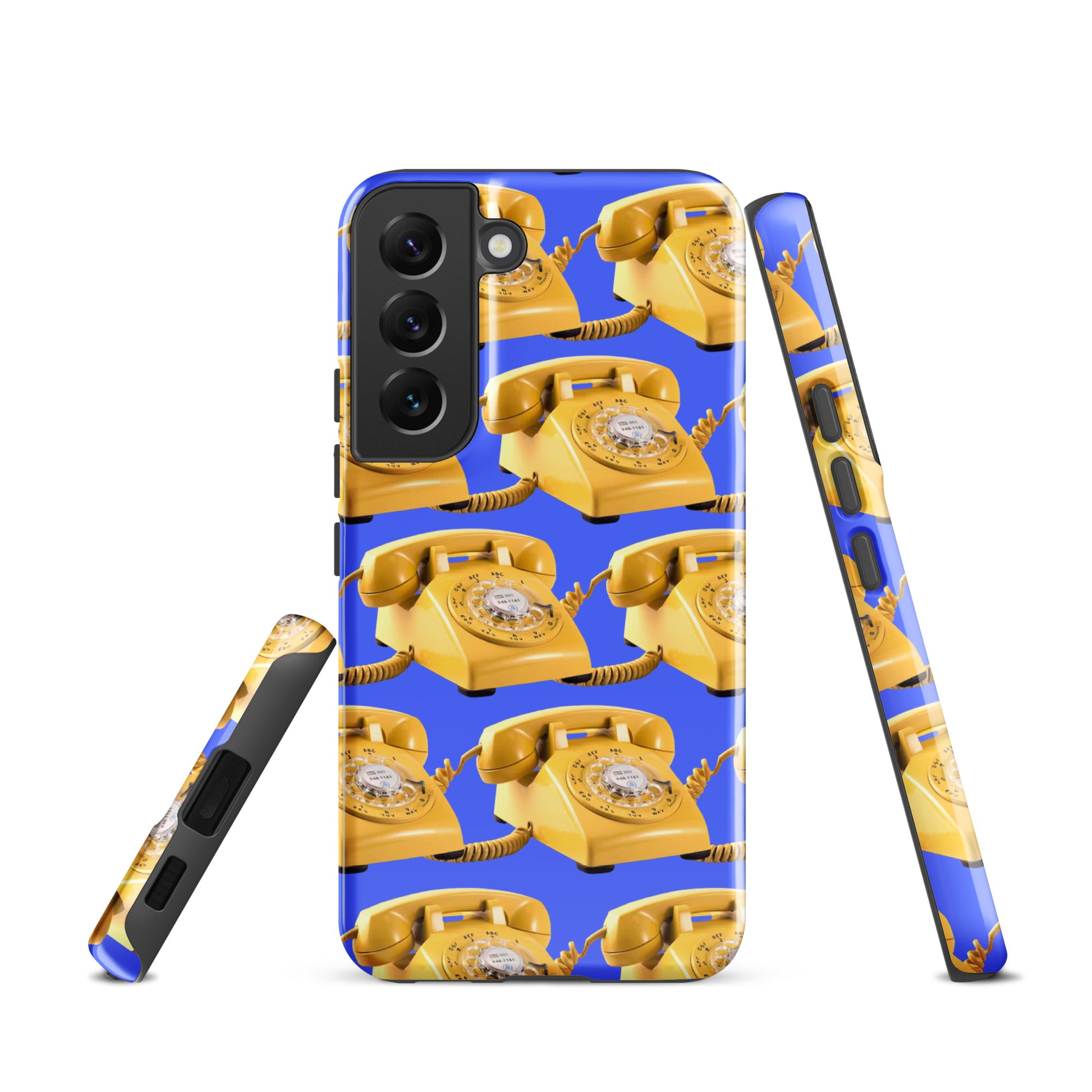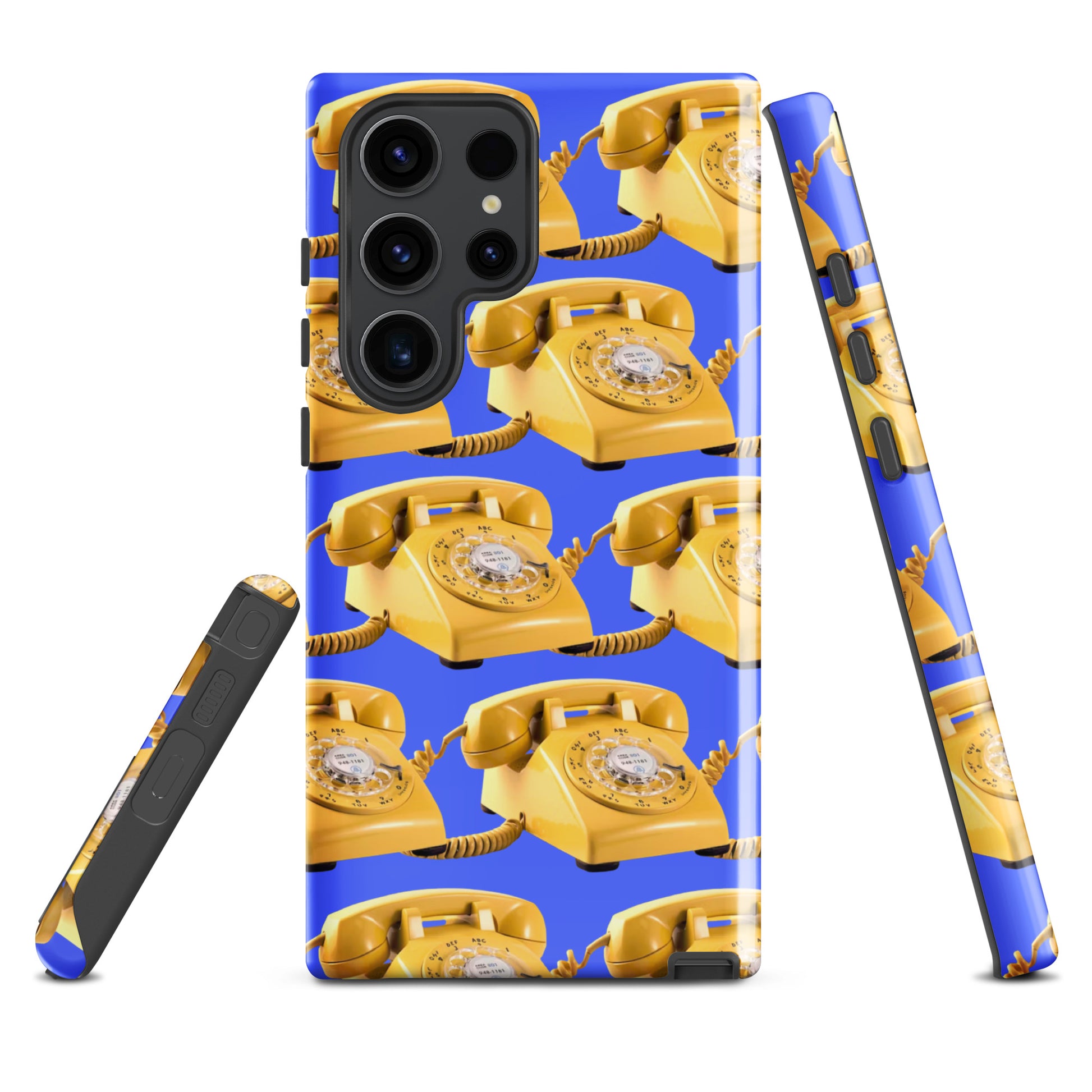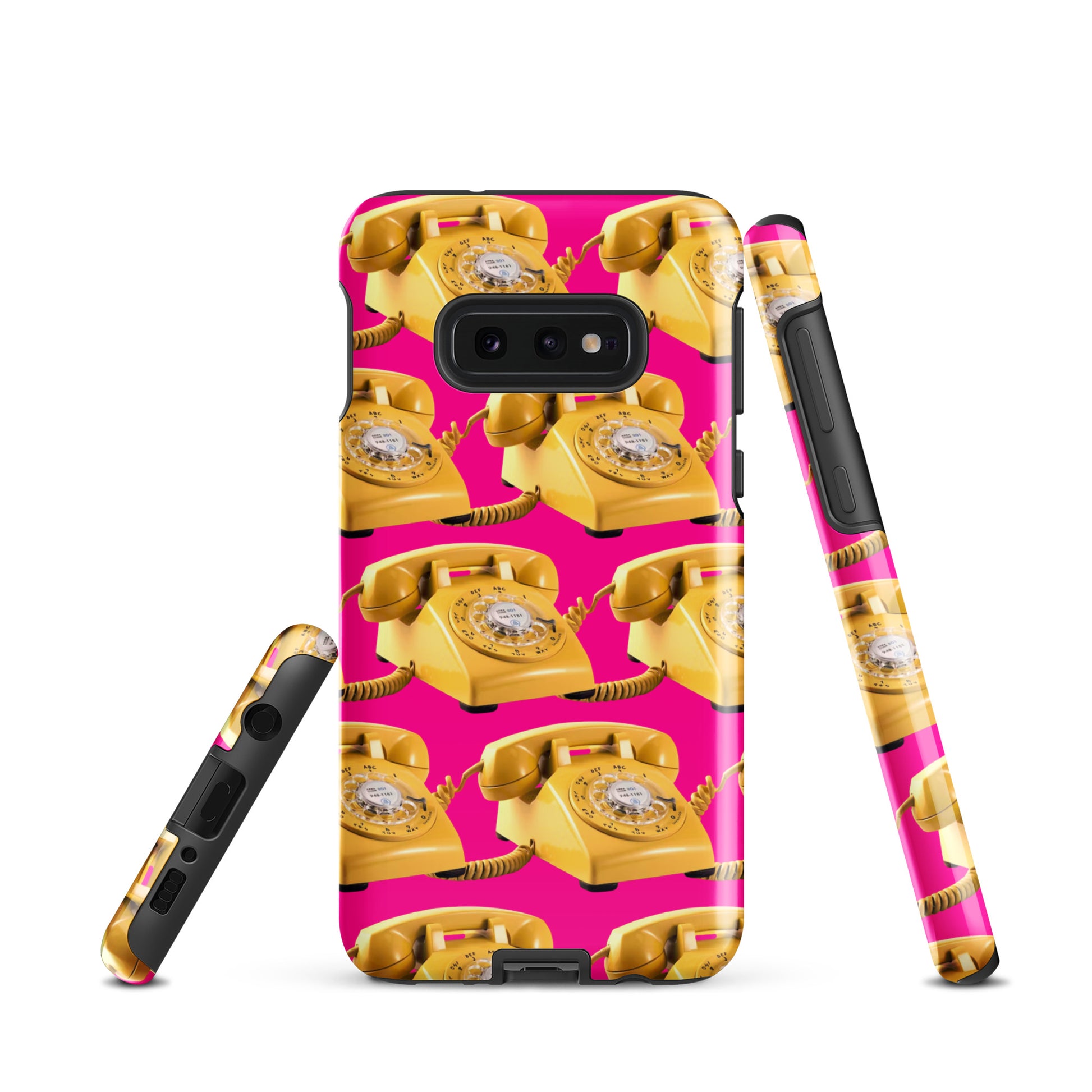 Design features vintage yellow rotary phone over pink or blue background - so retro! What a throwback!