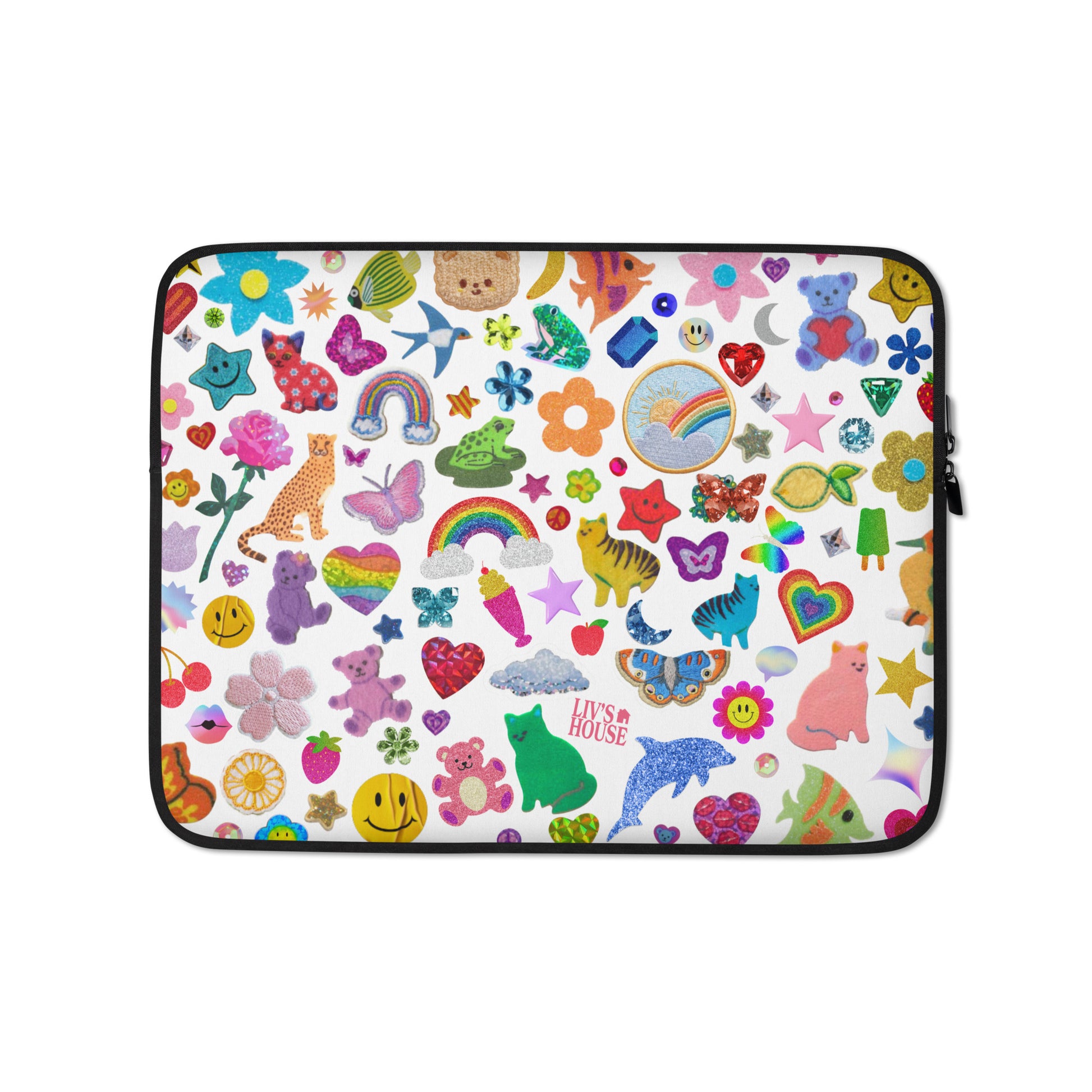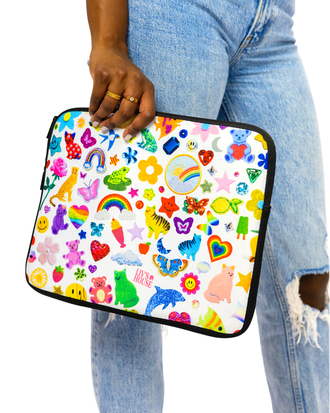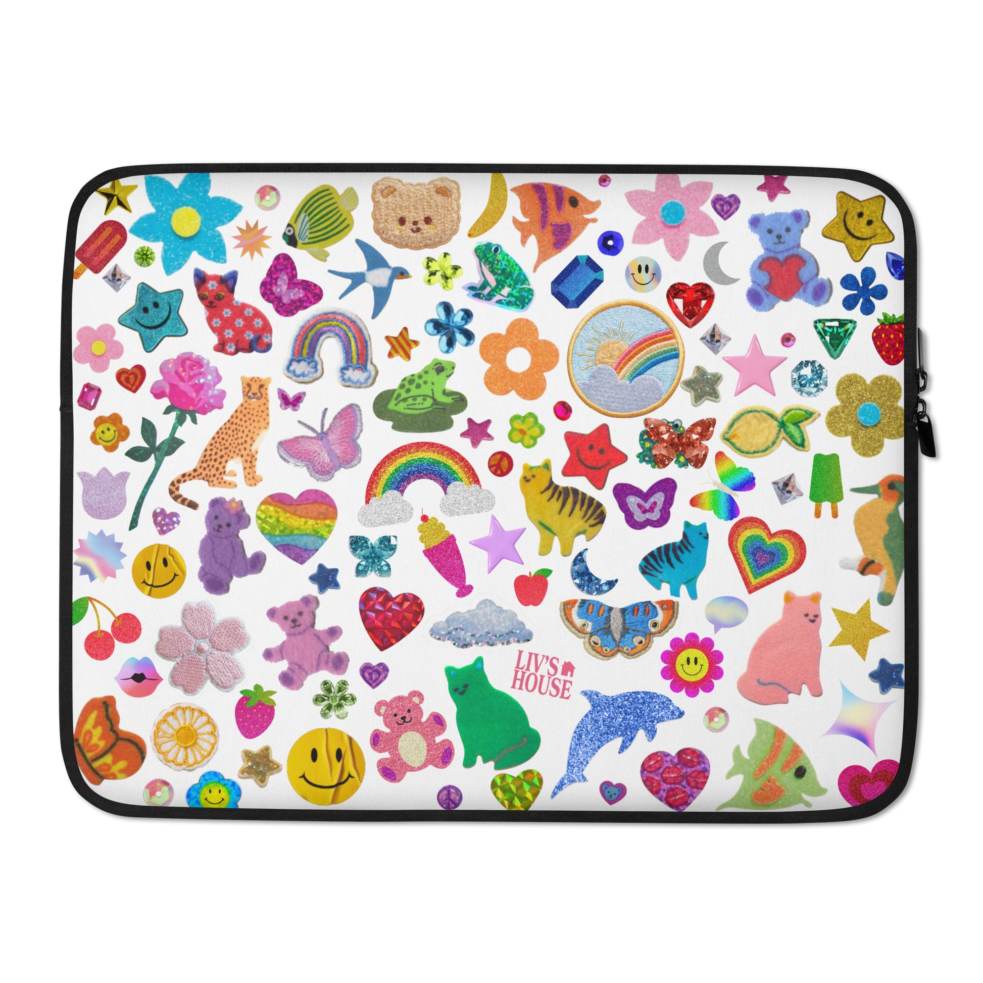 Design features an array of faux 'stickers' for a colorful, throwback, Y2K aesthetic. 'Stickers' include rainbows, flowers, teddy bears, frogs, stars, rhinestones, butterflies, and more!