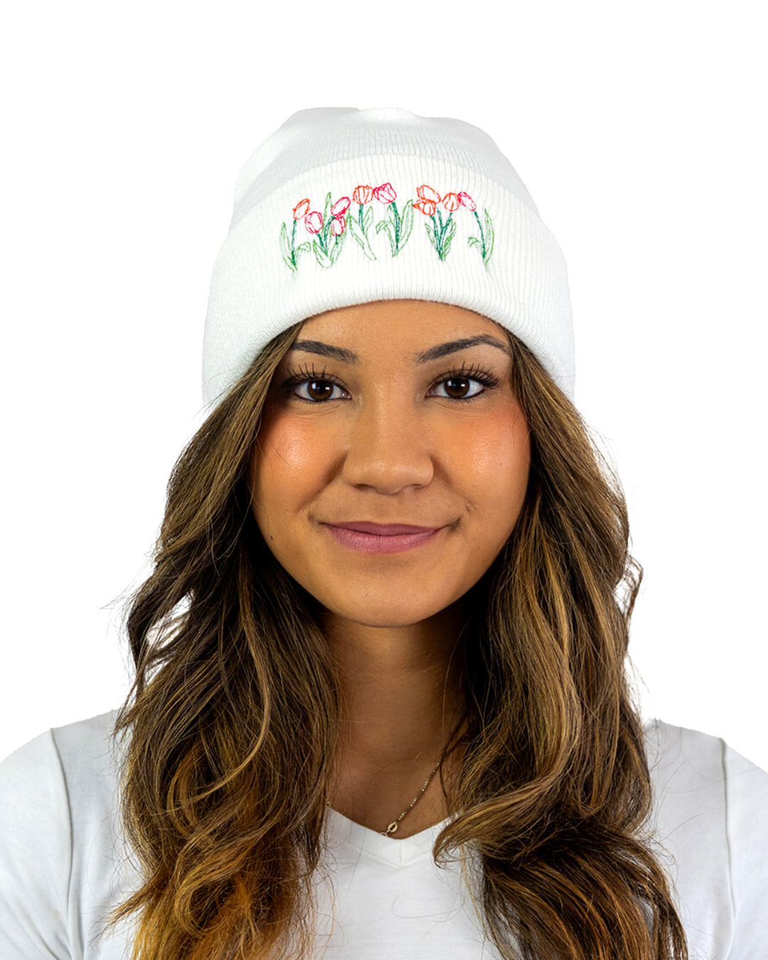 Whether you're accessorizing, staying warm, or covering up a bad hair day, this hat has got you covered. Embroidered with tulips in pink, orange, and green.