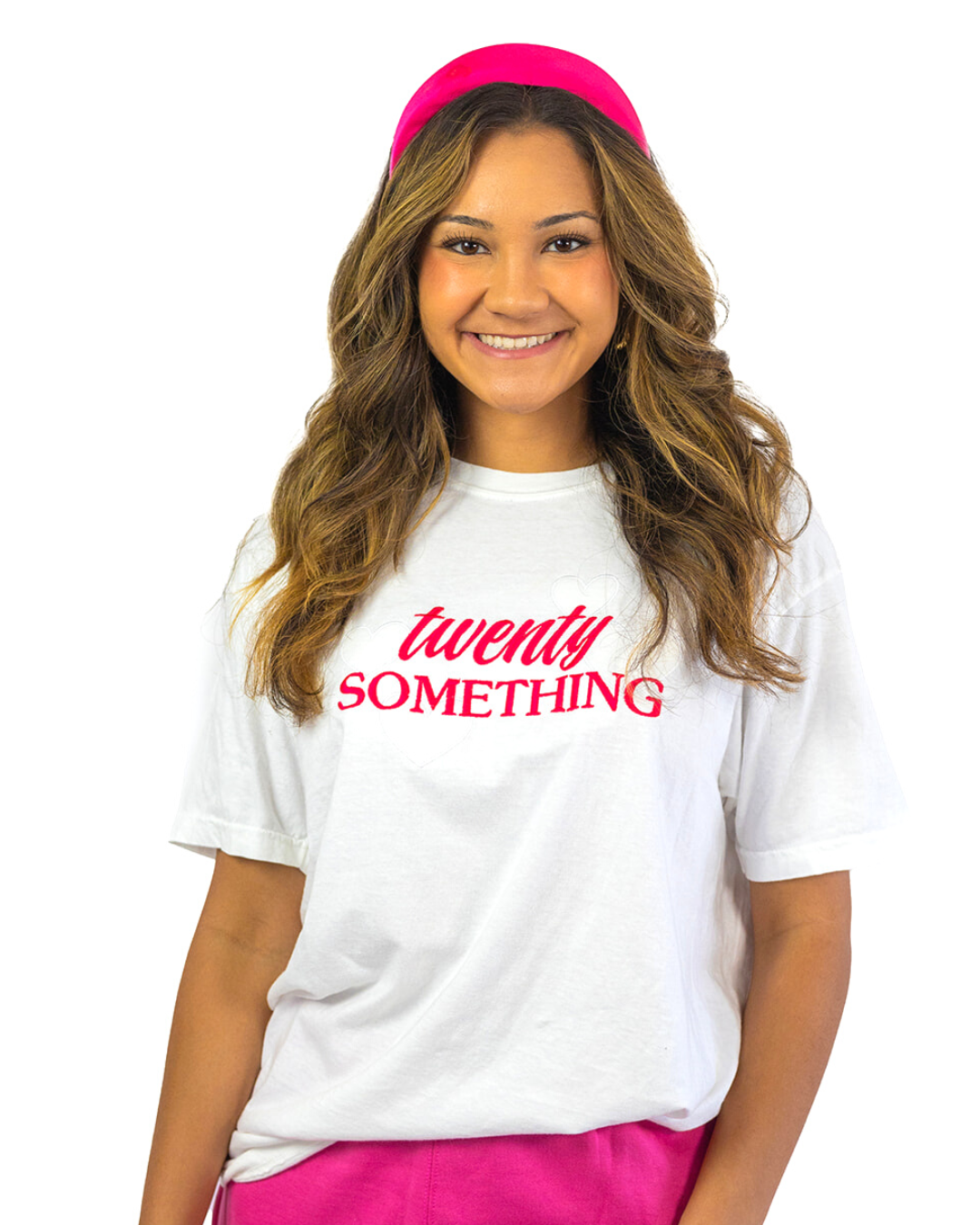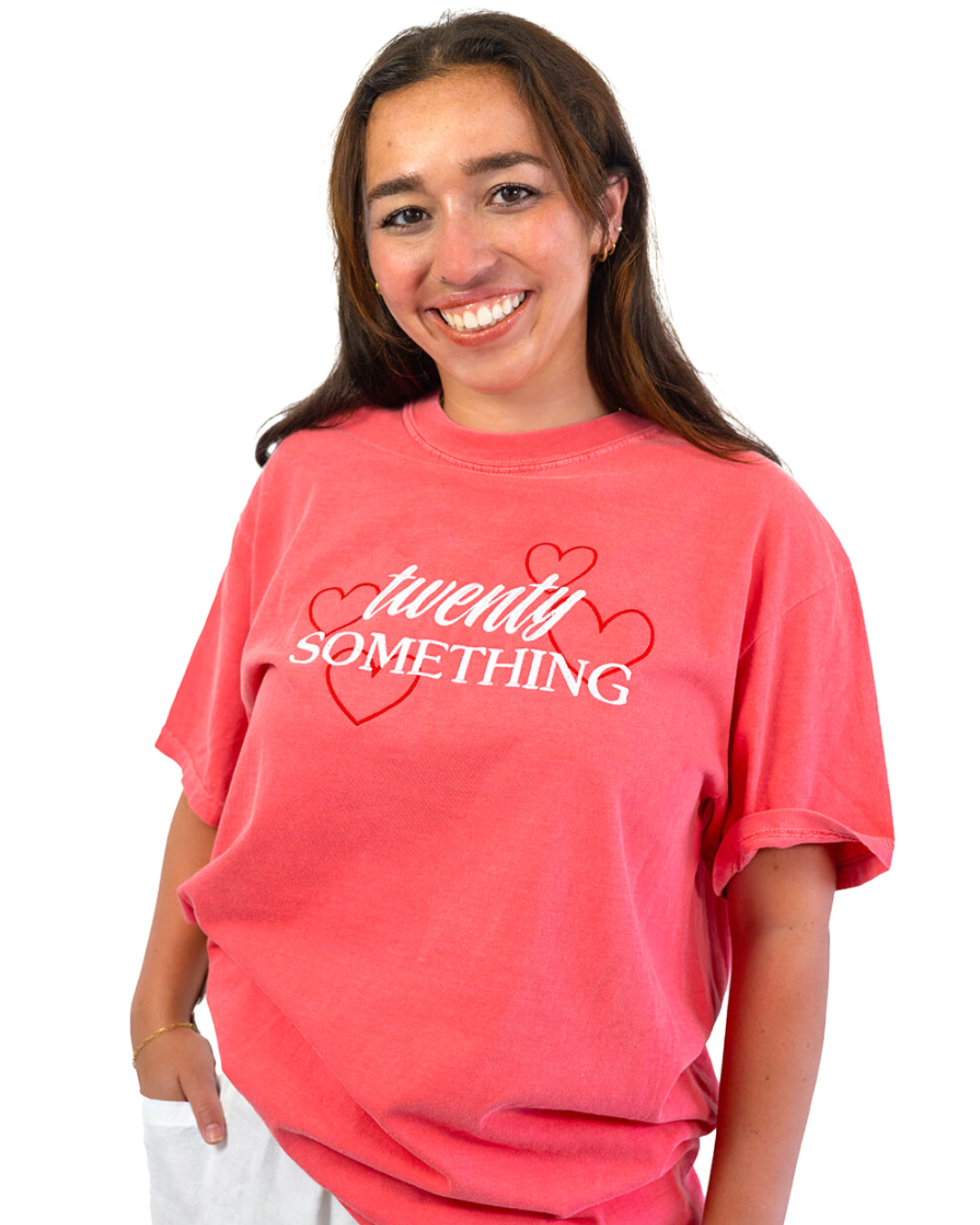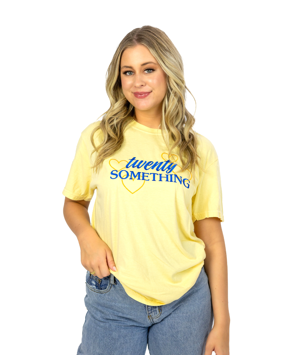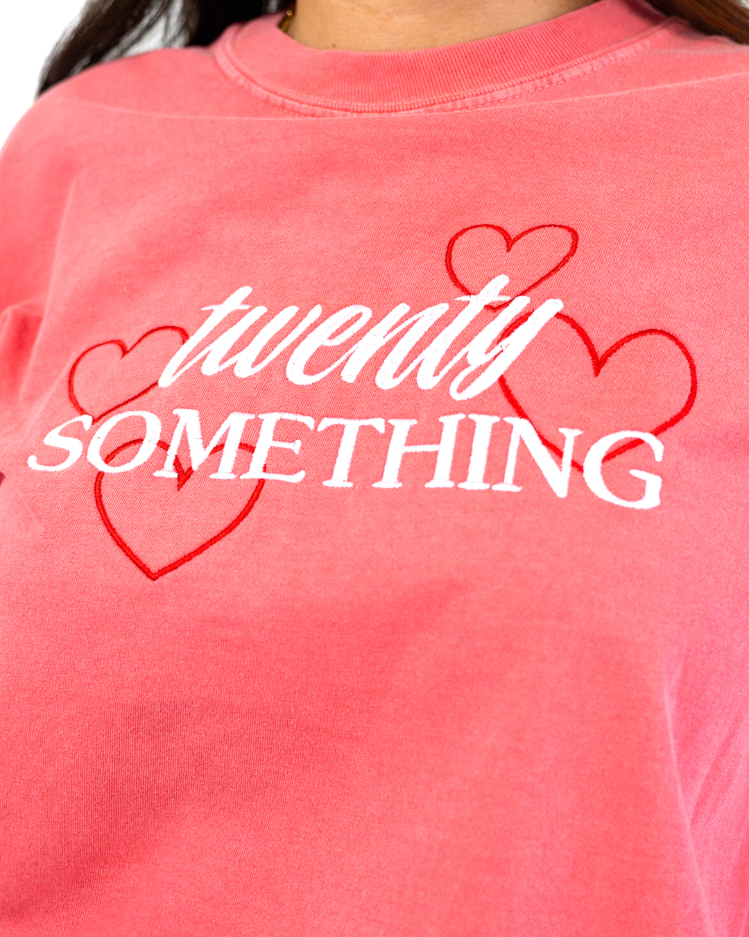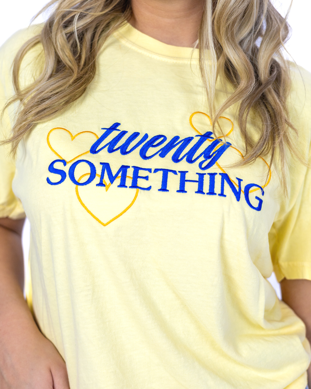 Embroidered on heavy-weight, high quality Comfort Colors tees with a relaxed fit and structured look. Size up for an oversized fit! This shirt is durable and long-lasting, made of 100% preshrunk ring-spun cotton. Tees come in yellow with embroidered yellow hearts and blue text, red with embroidered red hearts and white text, or white with embroidered white hearts and pink text. Embroidered text reads "Twenty Something" in trendy fonts.