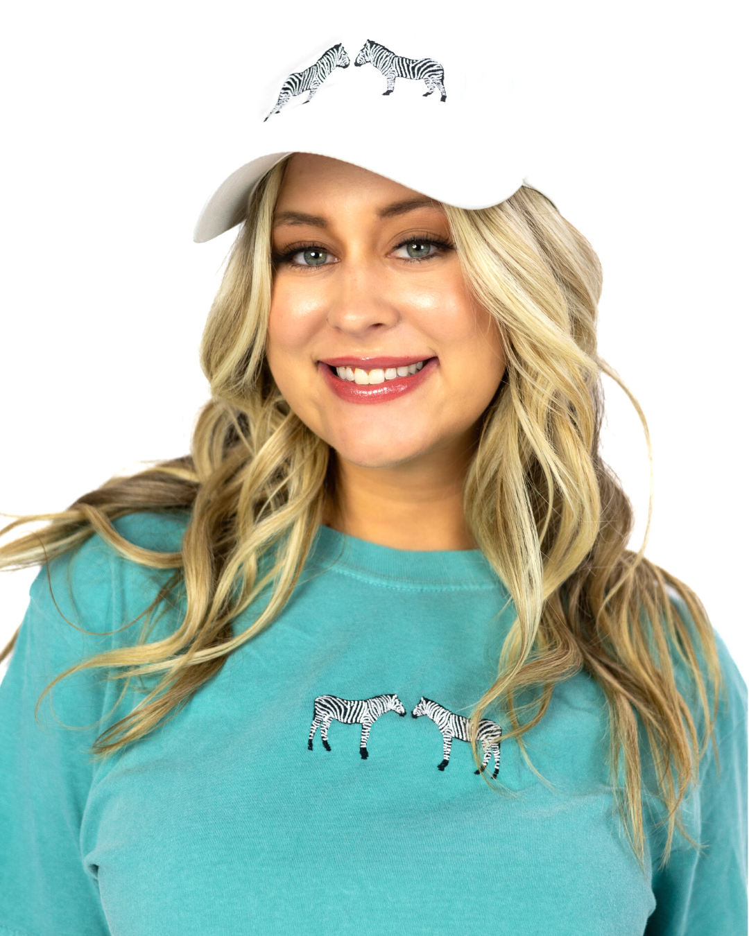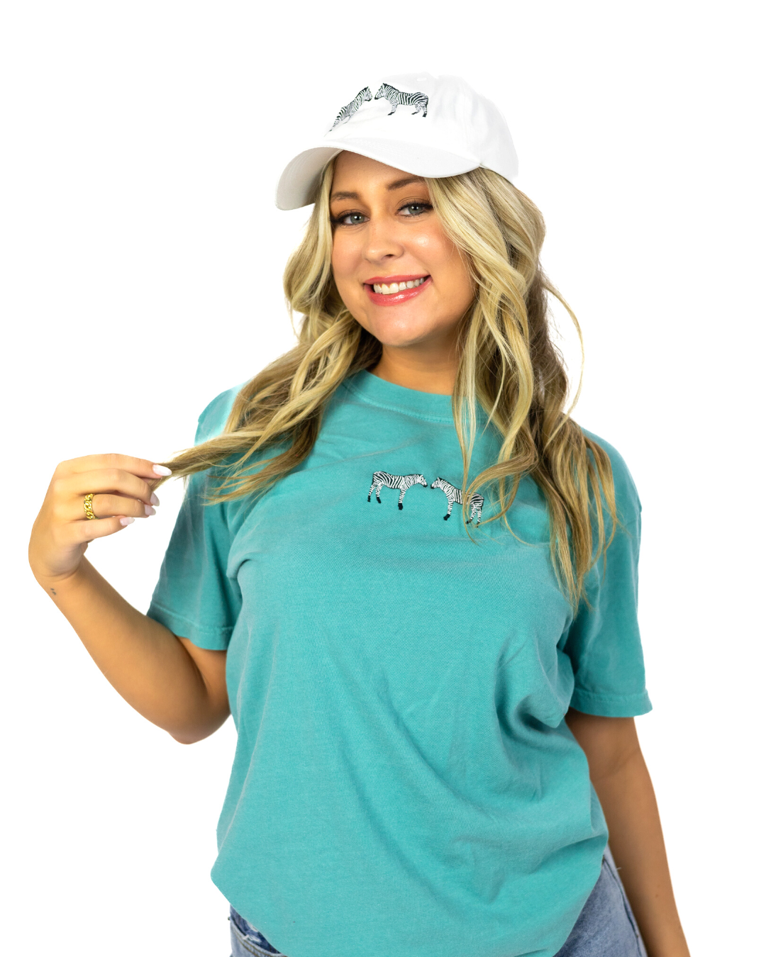 Embroidered on heavy-weight, high quality Comfort Colors tees with a relaxed fit and structured look. This shirt is durable and long-lasting, made of 100% preshrunk ring-spun cotton. Turquoise blue tee with front embroidery featuring two loving zebras in black and white thread. Perfect for animal lovers!